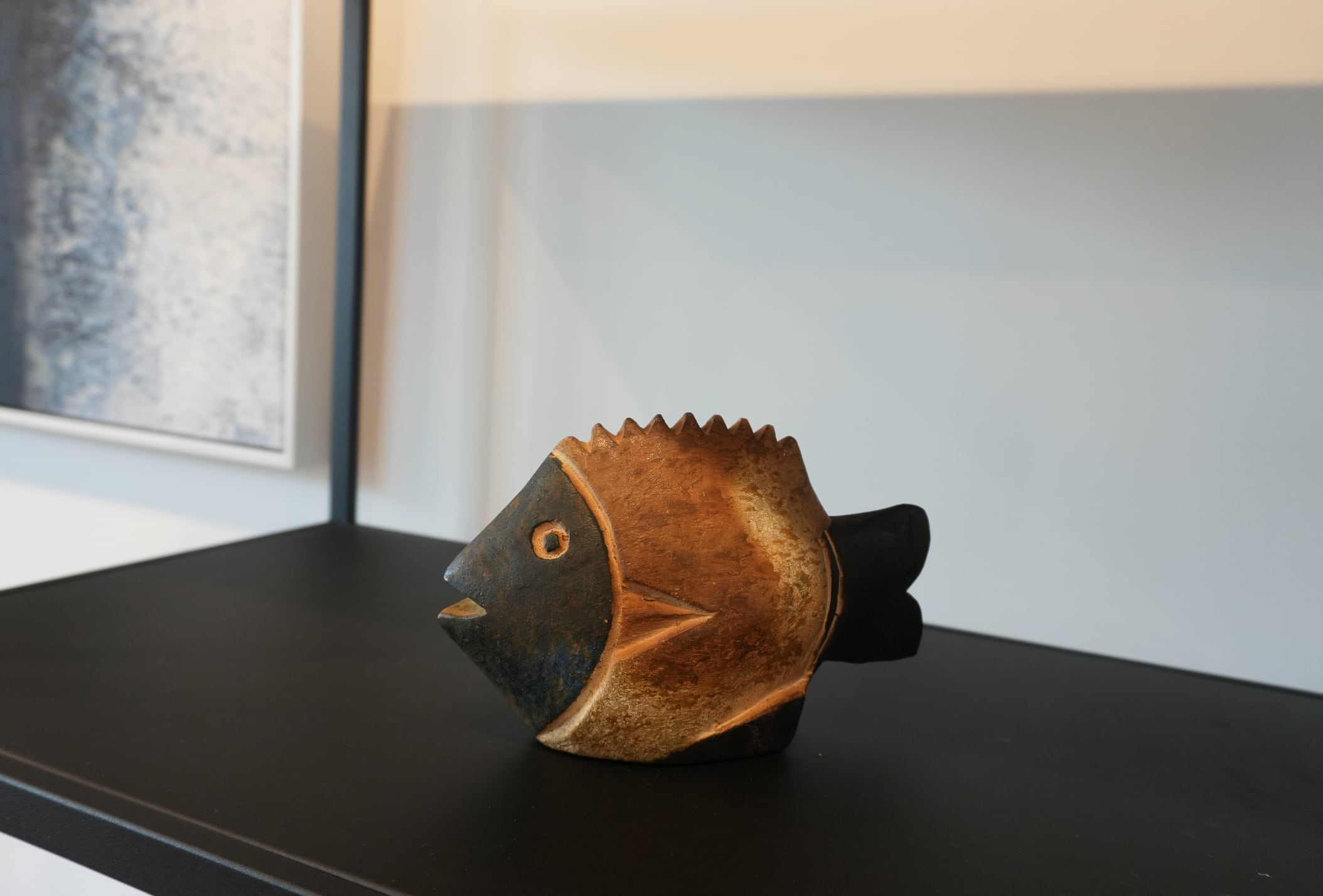 Unlike the brightly colored Bozo fish often seen, this piece features a subdued palette of natural wood tones contrasted with black highlights.
