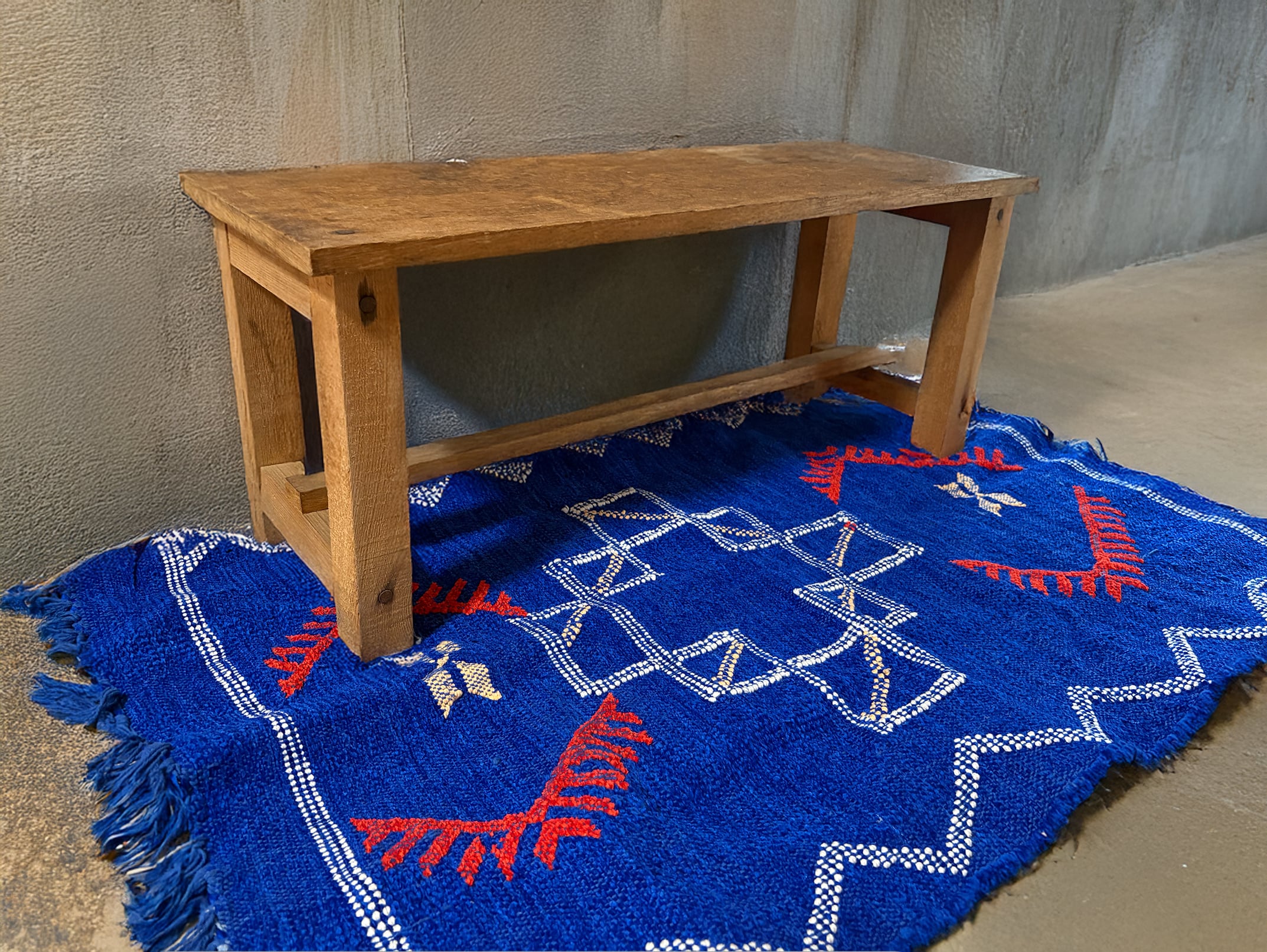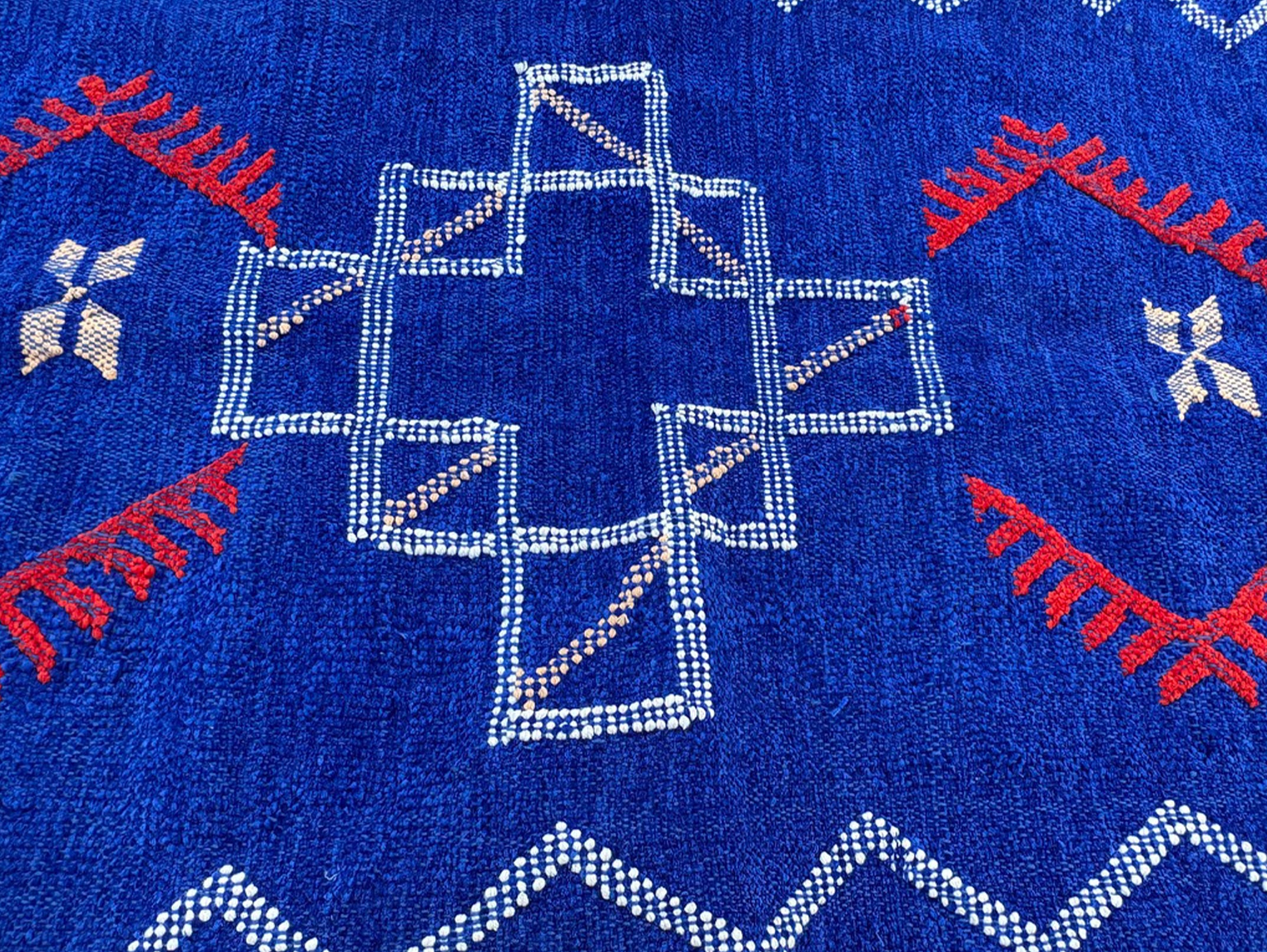 サハラの青 – モロッコ 手織りラグ(平織り・刺繍入り)