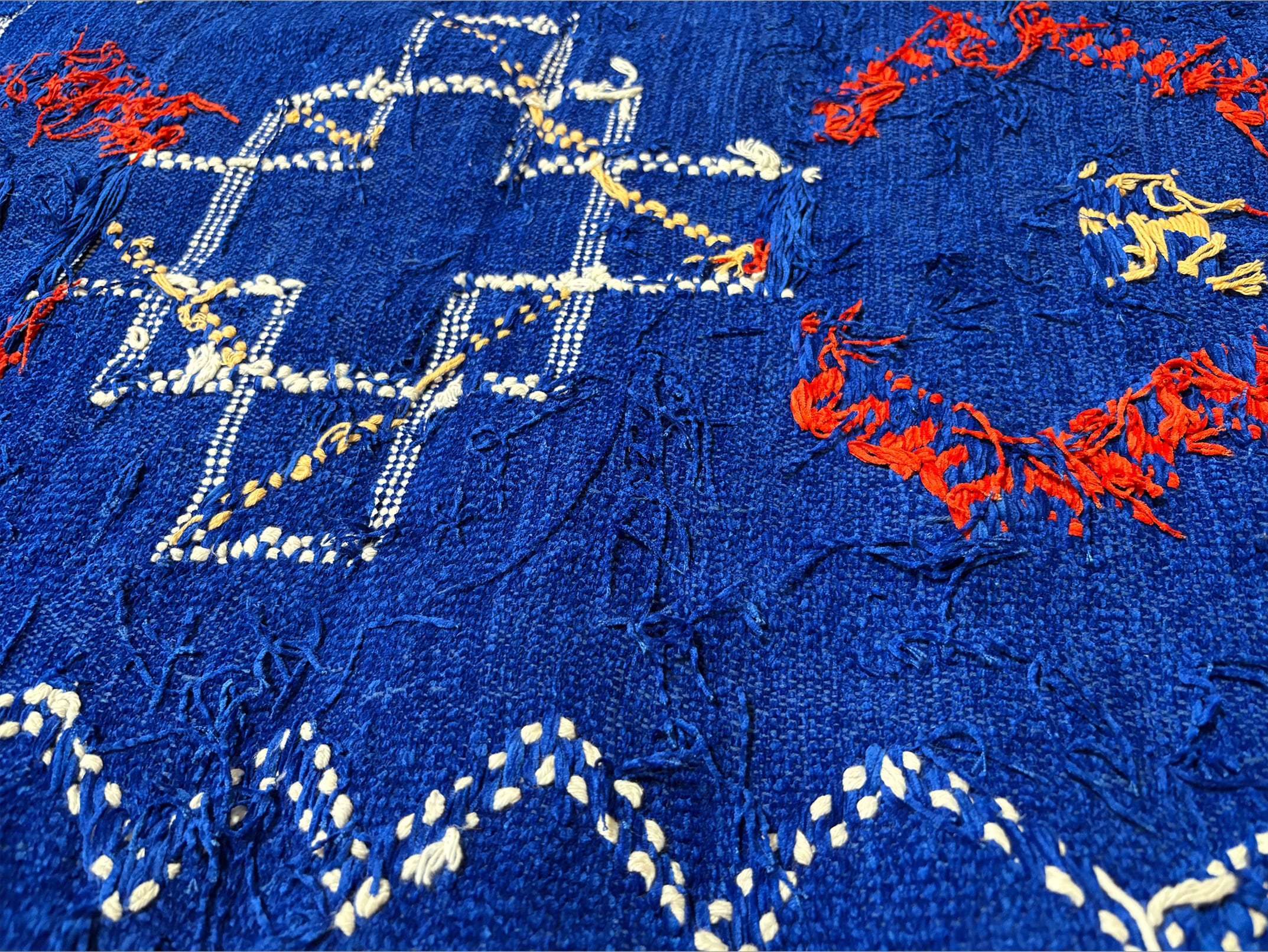 深いコバルトブルーに鮮やかな刺繍模様が浮かび上がるこちらのラグは、モロッコのベルベル(アマジグ)女性たちが一枚ずつ手仕事で仕上げた伝統的な作品です。