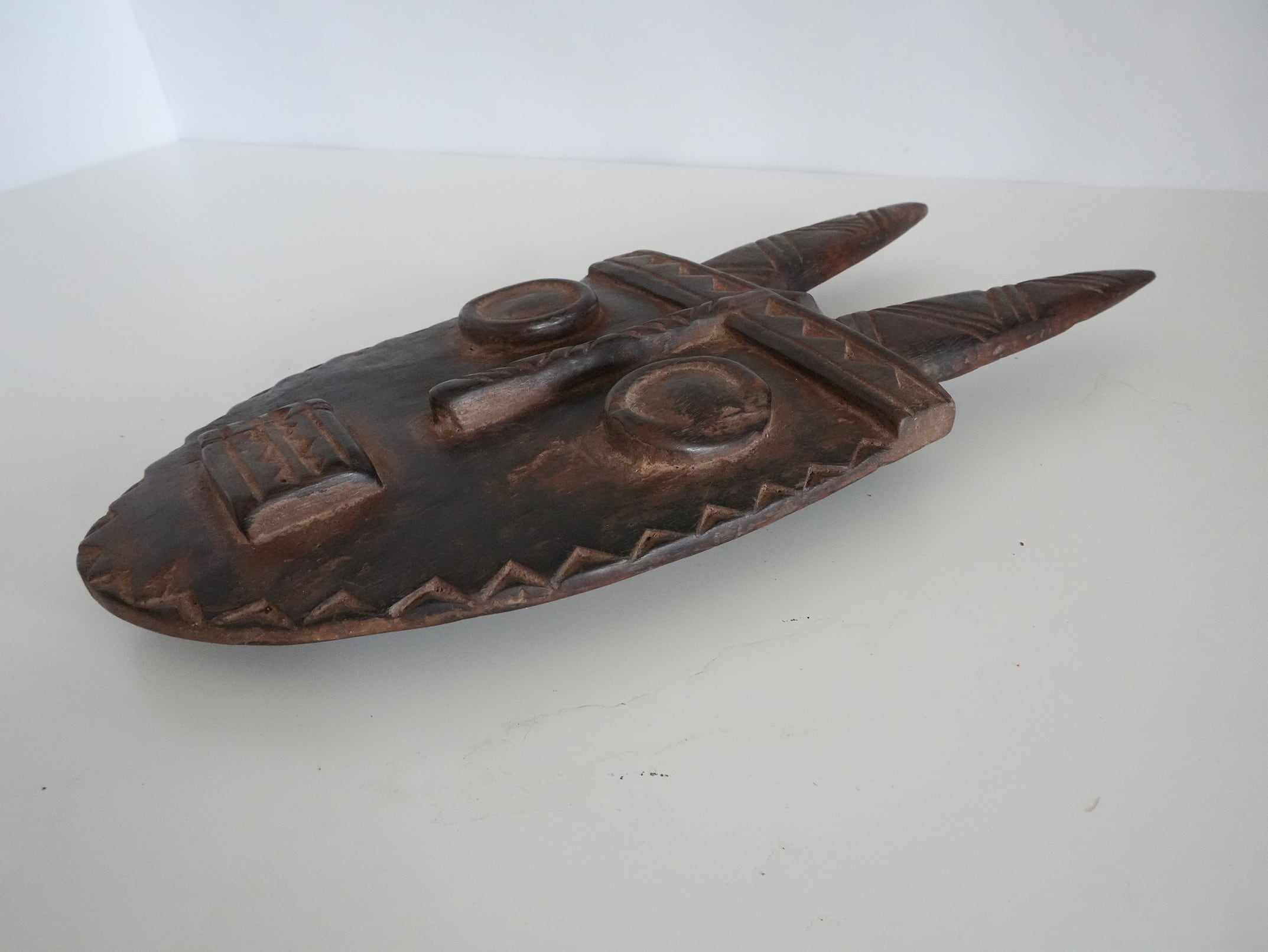 顔全体に刻まれた幾何学的な文様、直線的な口元、大胆な造形の角状突起が特徴で、抽象とシンメトリーの美しさが際立つ一品です。