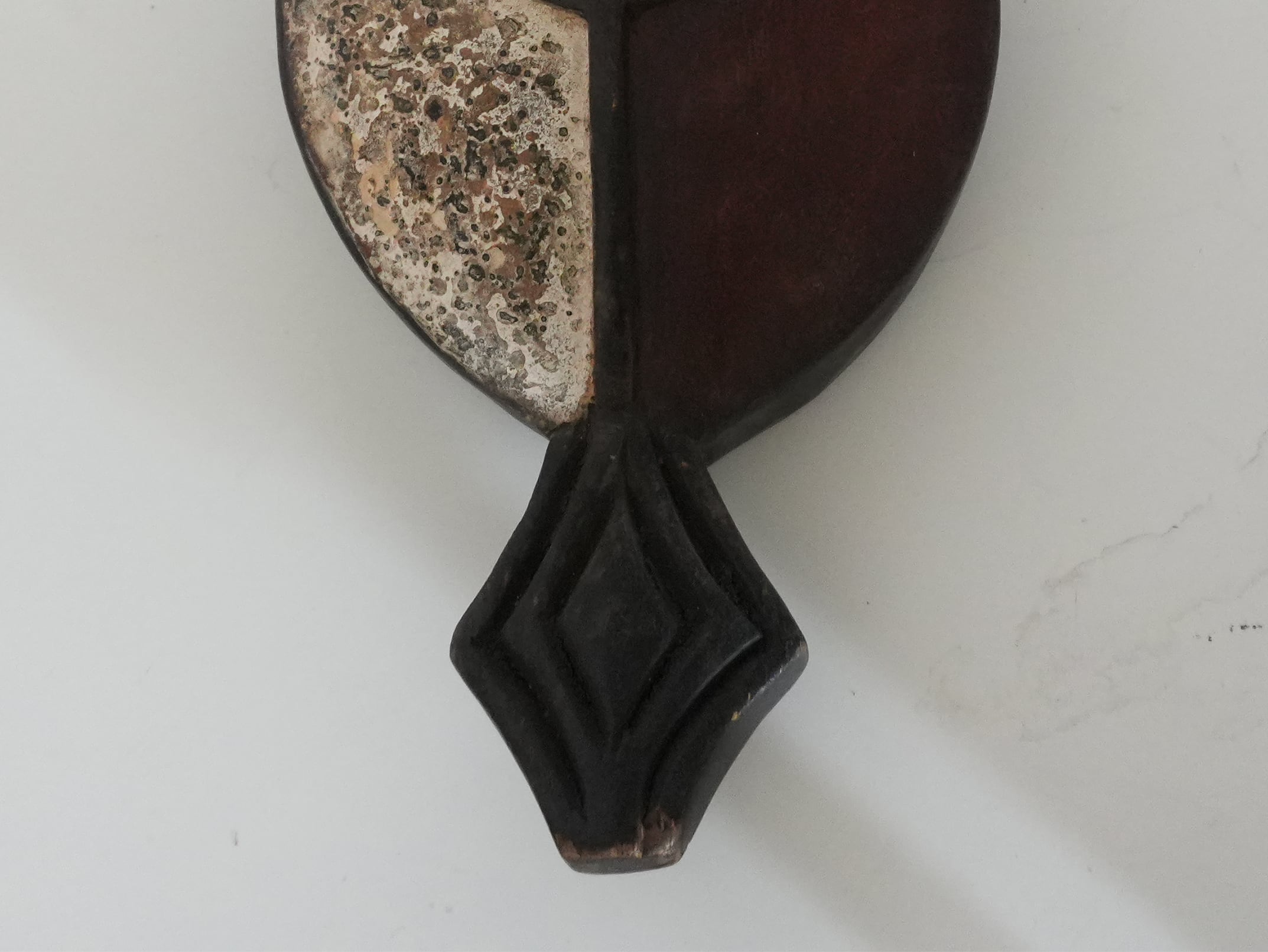 角の左右対称な造形、簡素で抽象化された目と鼻、そして顔の外郭の柔らかな曲線は、象徴性と造形的洗練が融合したアフリカ部族彫刻の典型的な様式です。