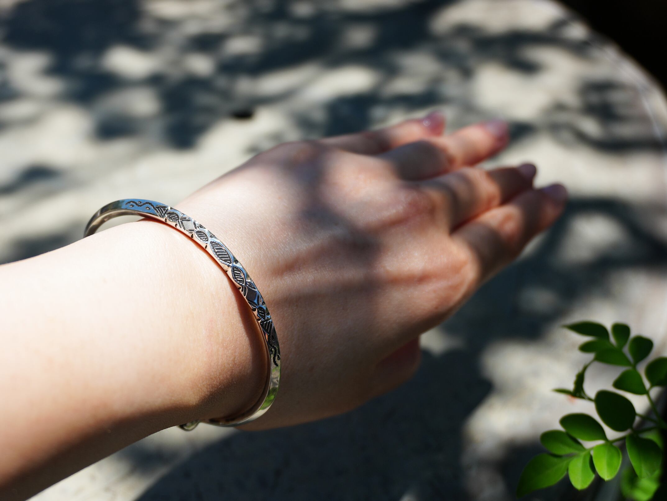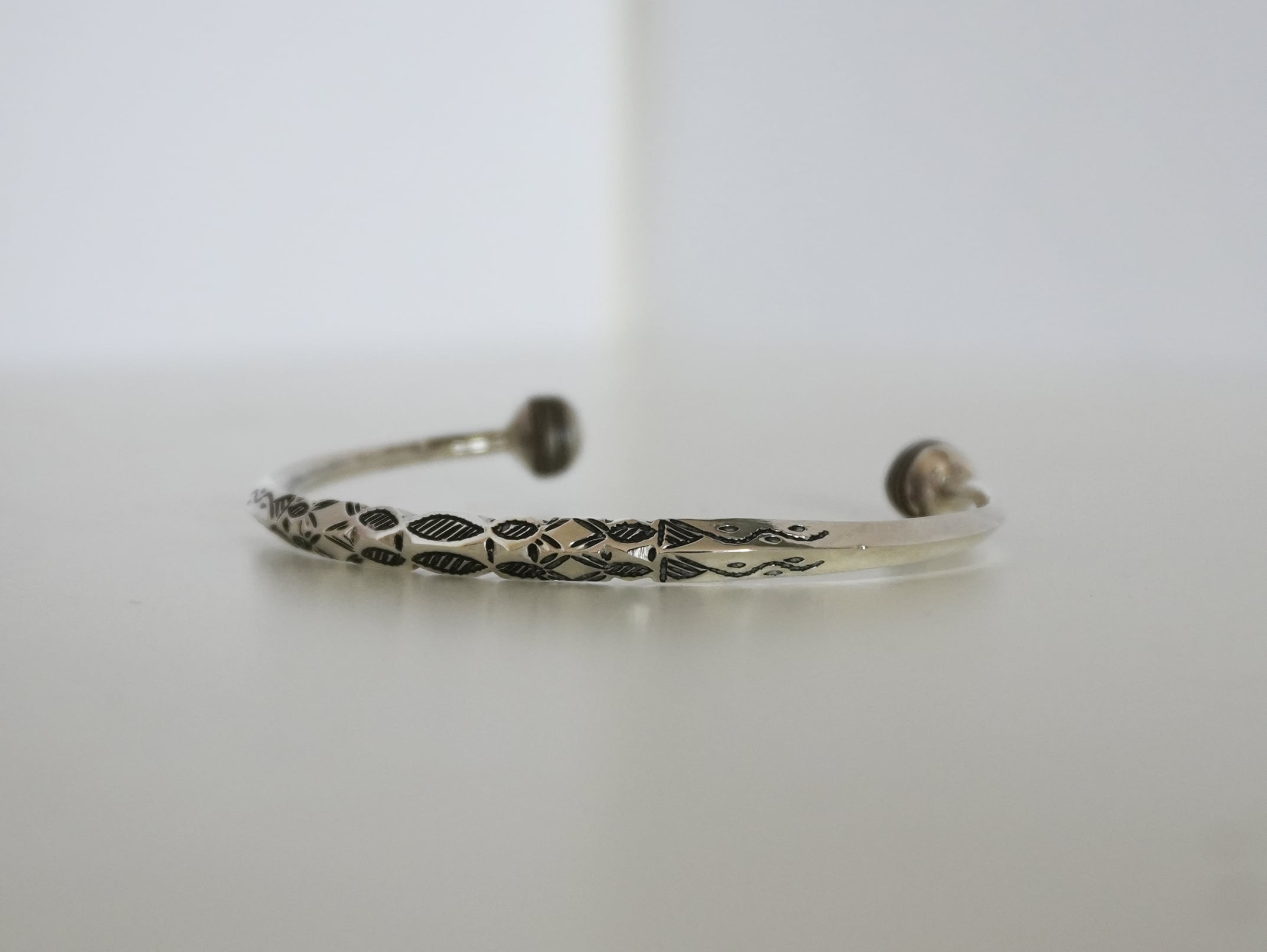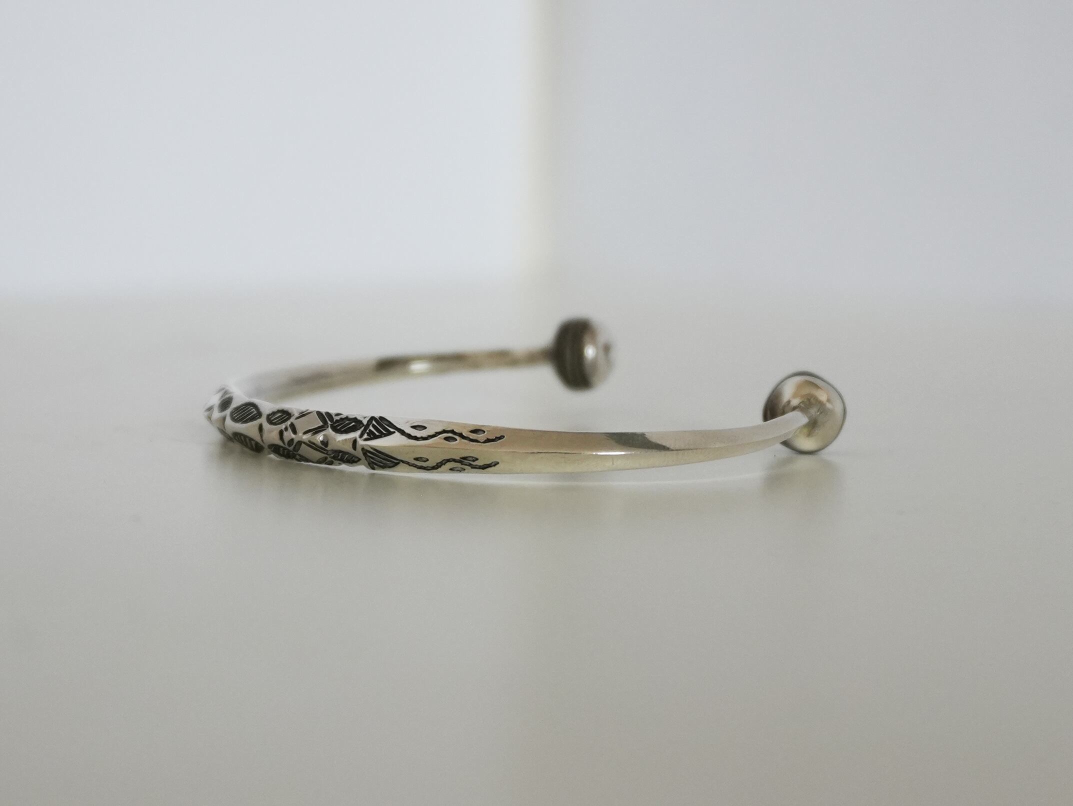 この細身のバングルは、銀を主な素材として使用し、職人による手作業の彫金が施されています。彫金技術は繊細でありながらも力強く、シンメトリーに均整の取れた幾何学模様や部族独特のシンボルが彫り込まれています。