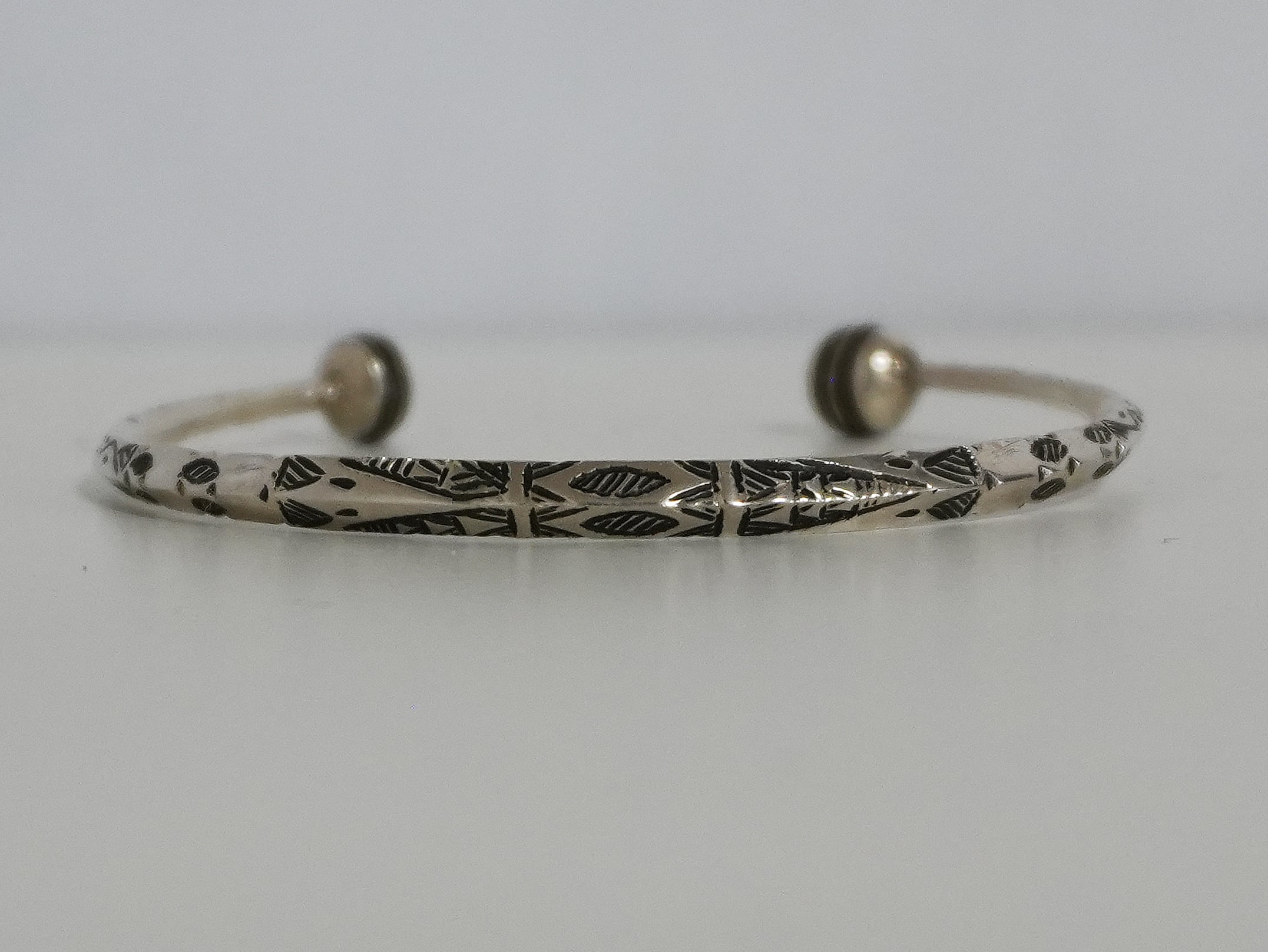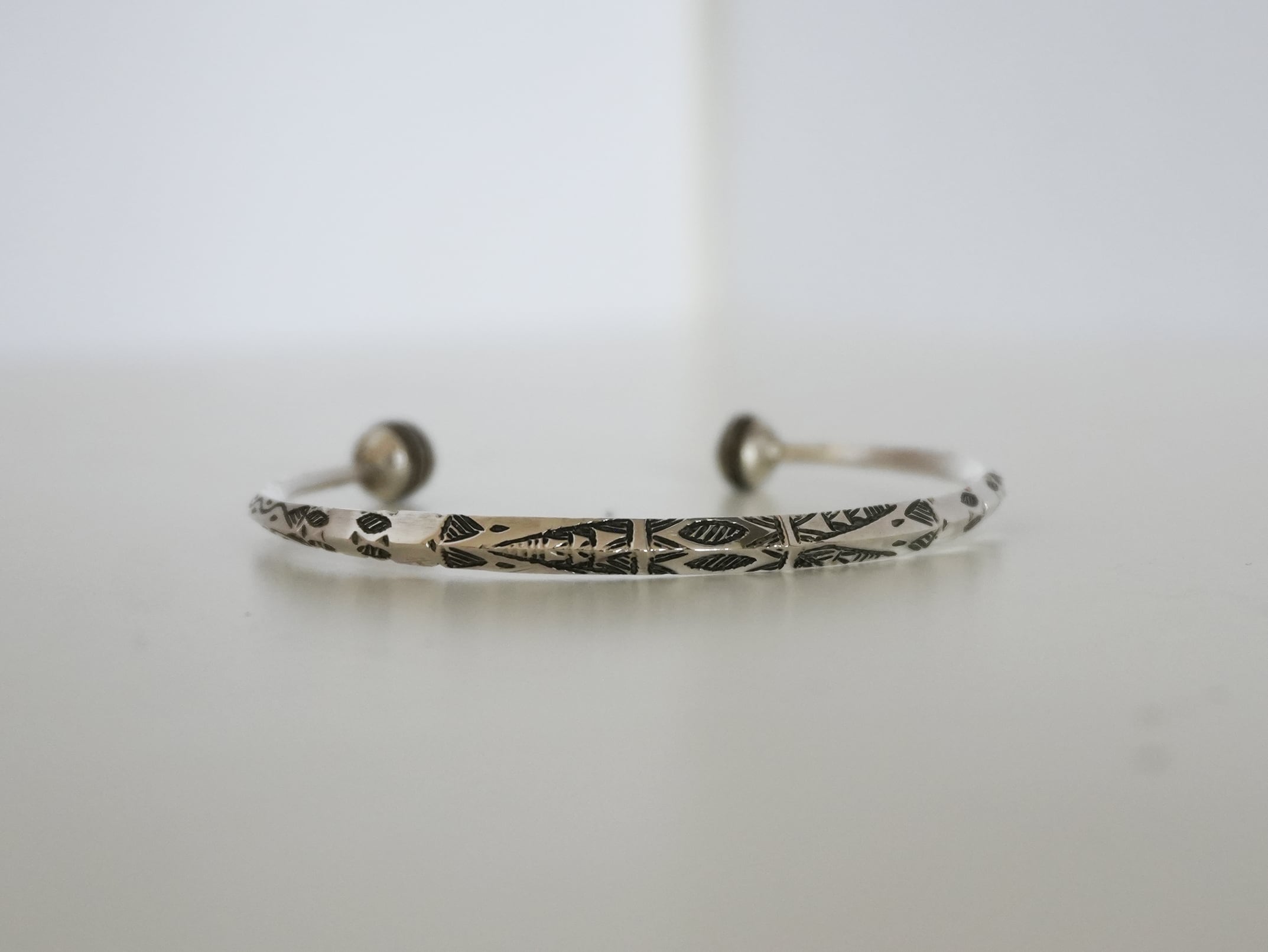 彼らが伝統的な技術と祈りを込めて手作業で作り上げるジュエリーは、単なる装飾品ではなく、民族の記憶と精神を伝えるアートピースです。この細身のシルバーバングルも例外ではなく、トゥアレグの自然観、暮らし、信仰、そして誇りが、銀の地に静かに刻み込まれています。