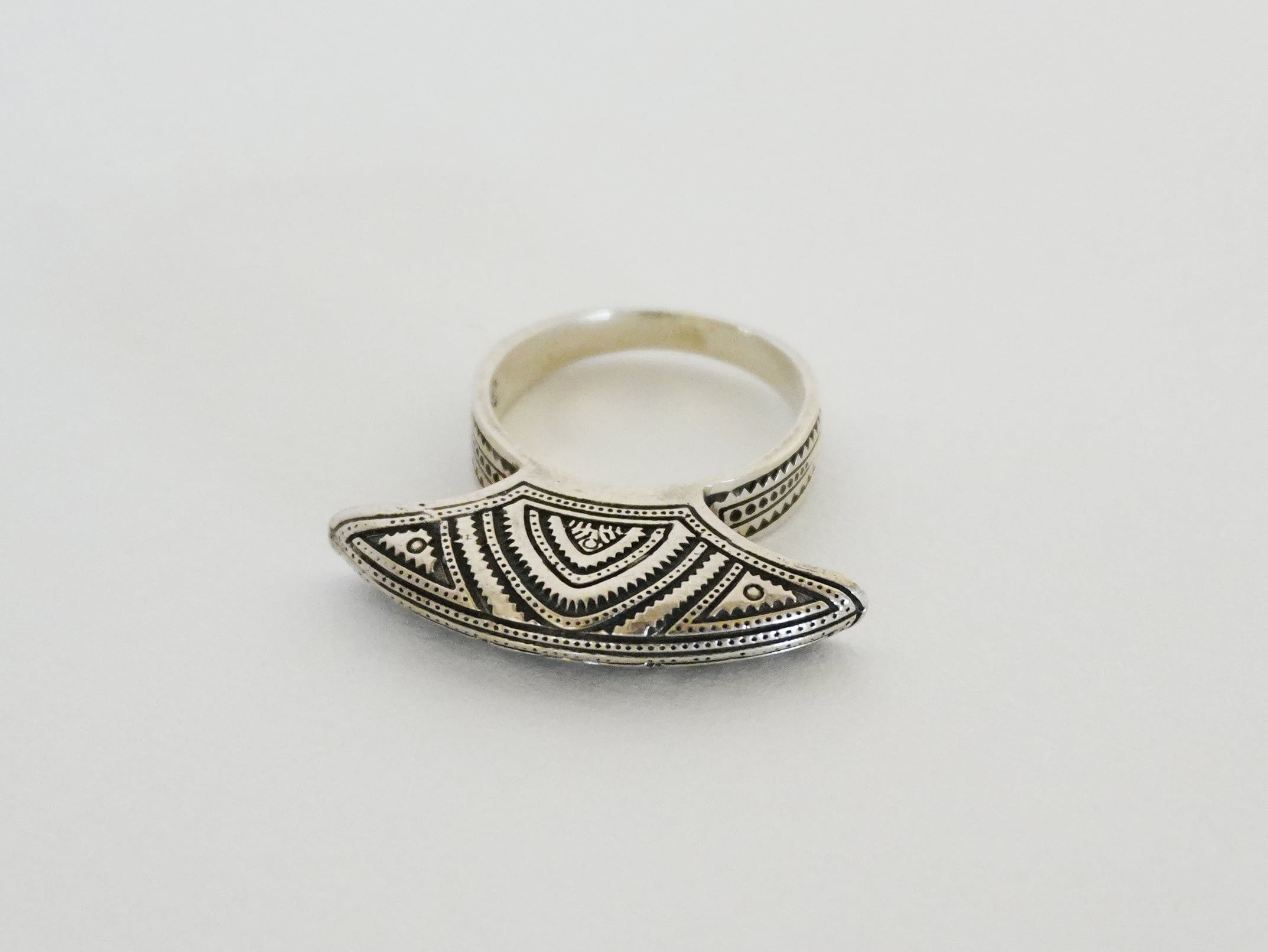 このトゥアレグシルバーリングは、砂漠の民が長い時をかけて培った文化と精神性を、まさに指先に宿す一点もののジュエリーです。