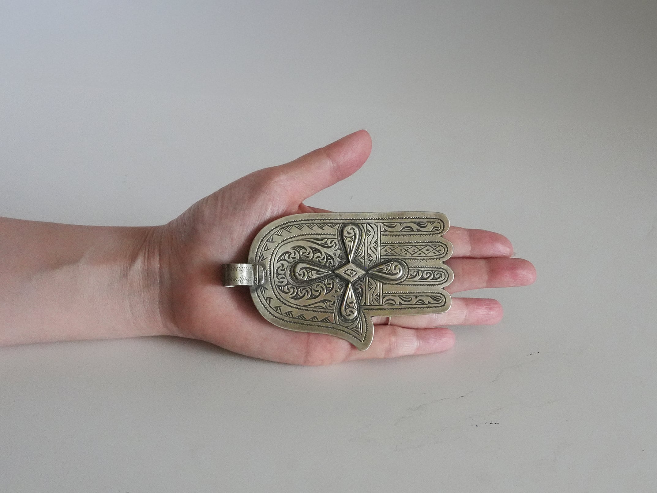 こちらのハムサ装飾オブジェは、モロッコのベルベル銀細工による「ファティマの手(ハムサ)」をモチーフとした一点ものです。