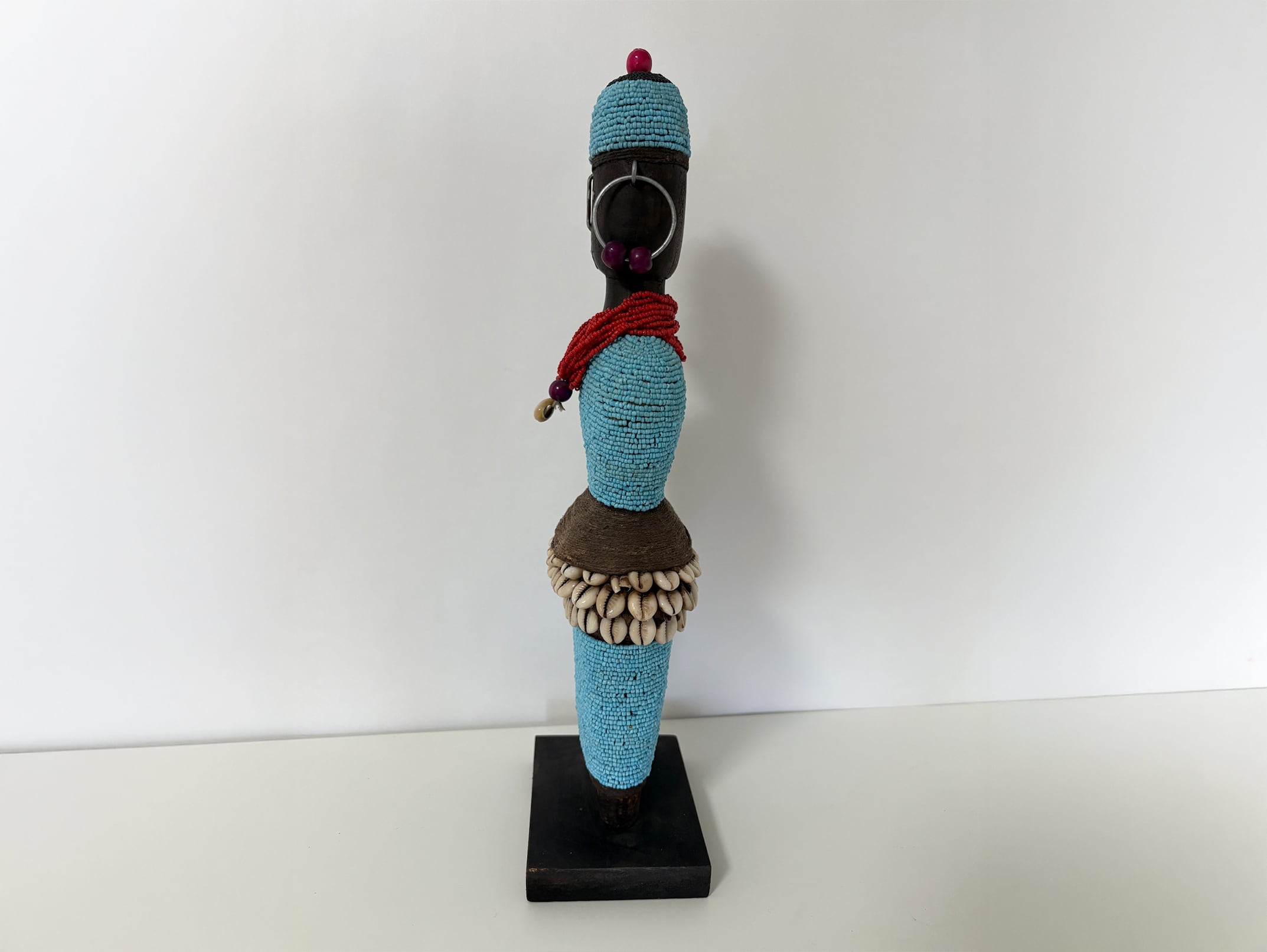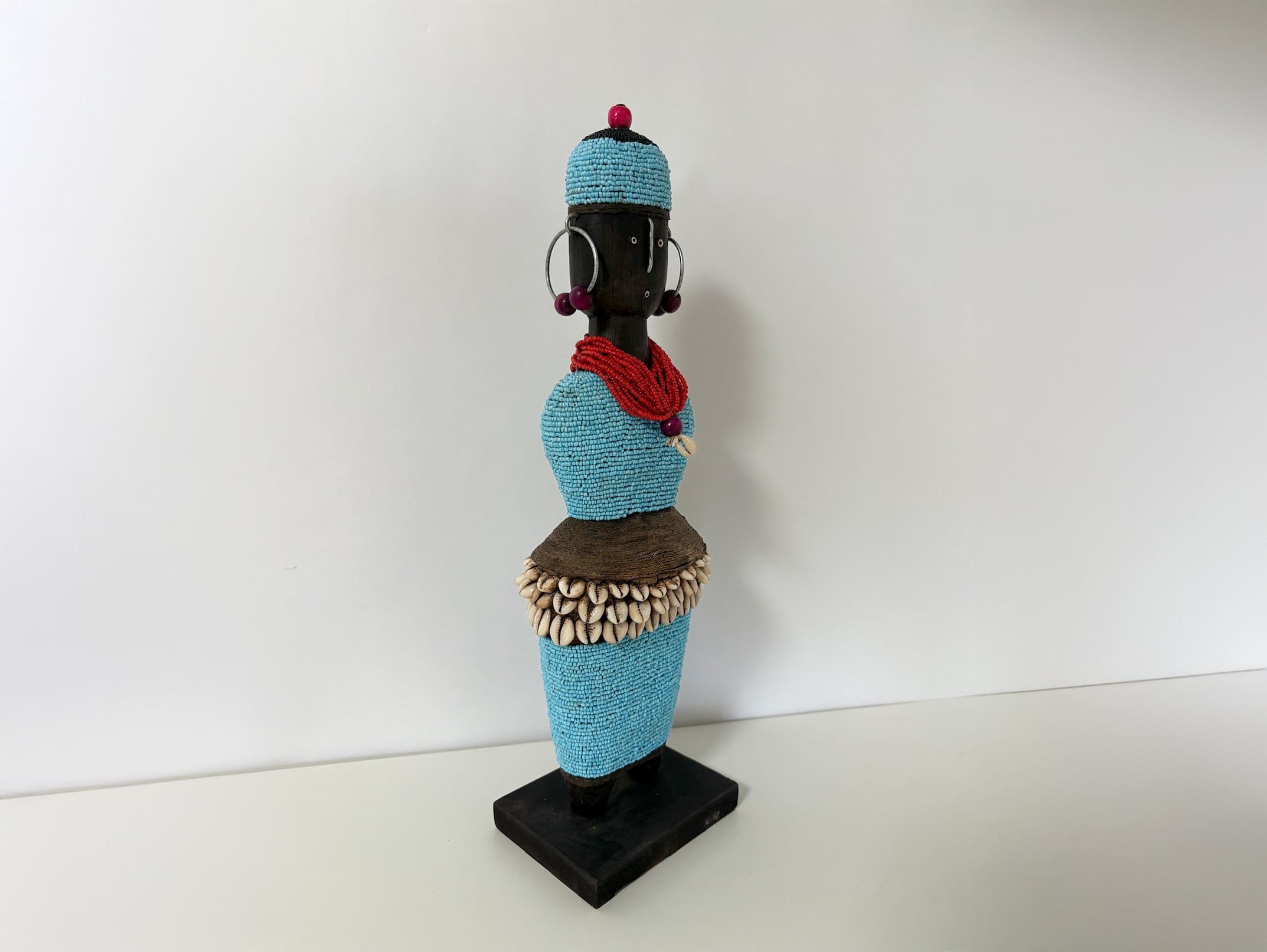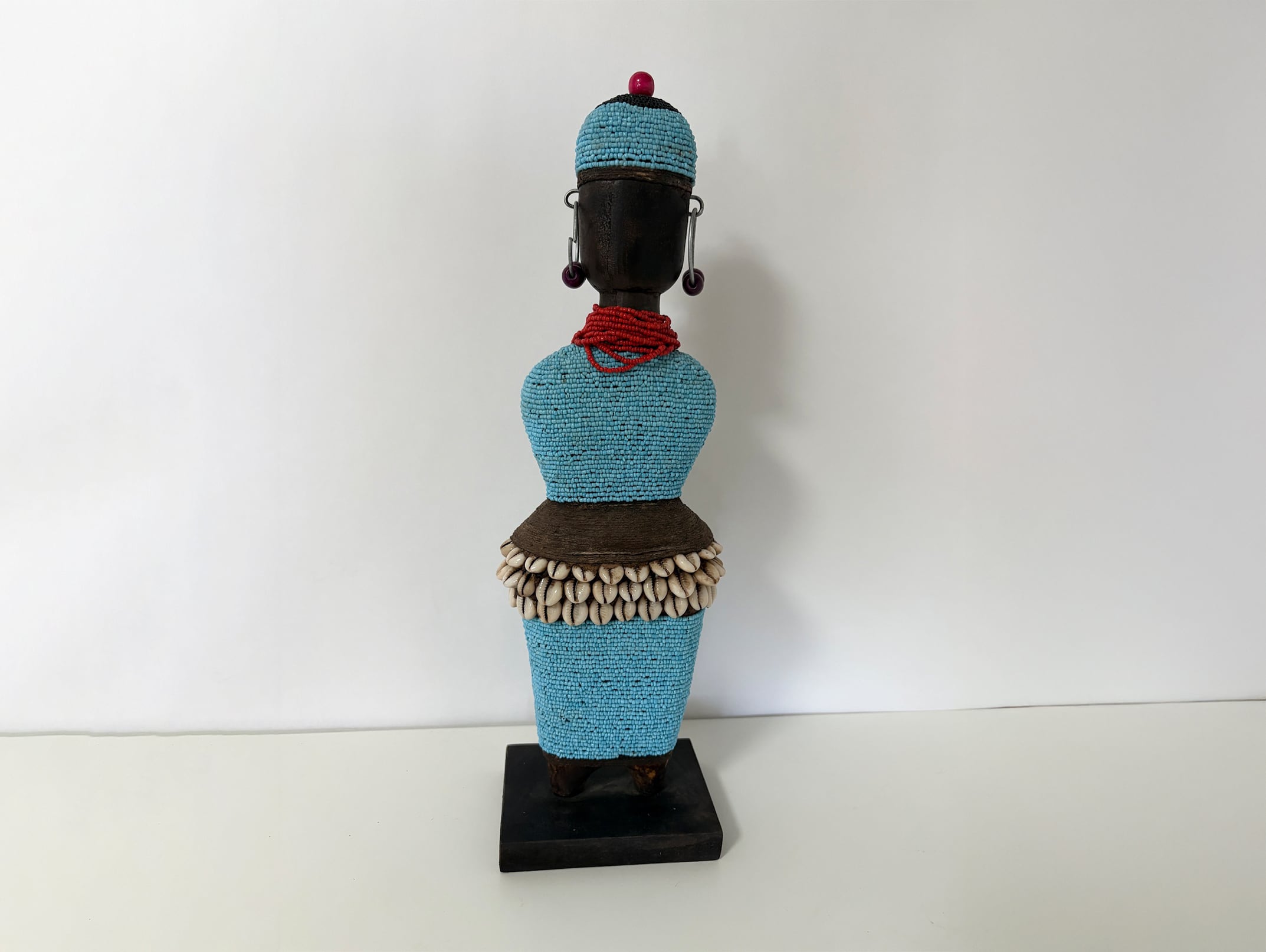 Each Namji doll is uniquely crafted, typically from carved wood and lavishly decorated with vibrant beads, cowrie shells, leather, and metal, all of which carry deep symbolic meanings.