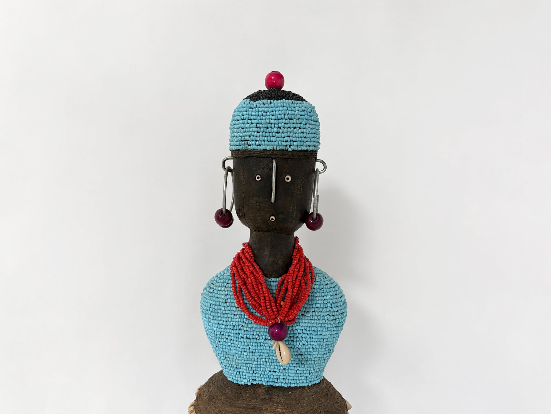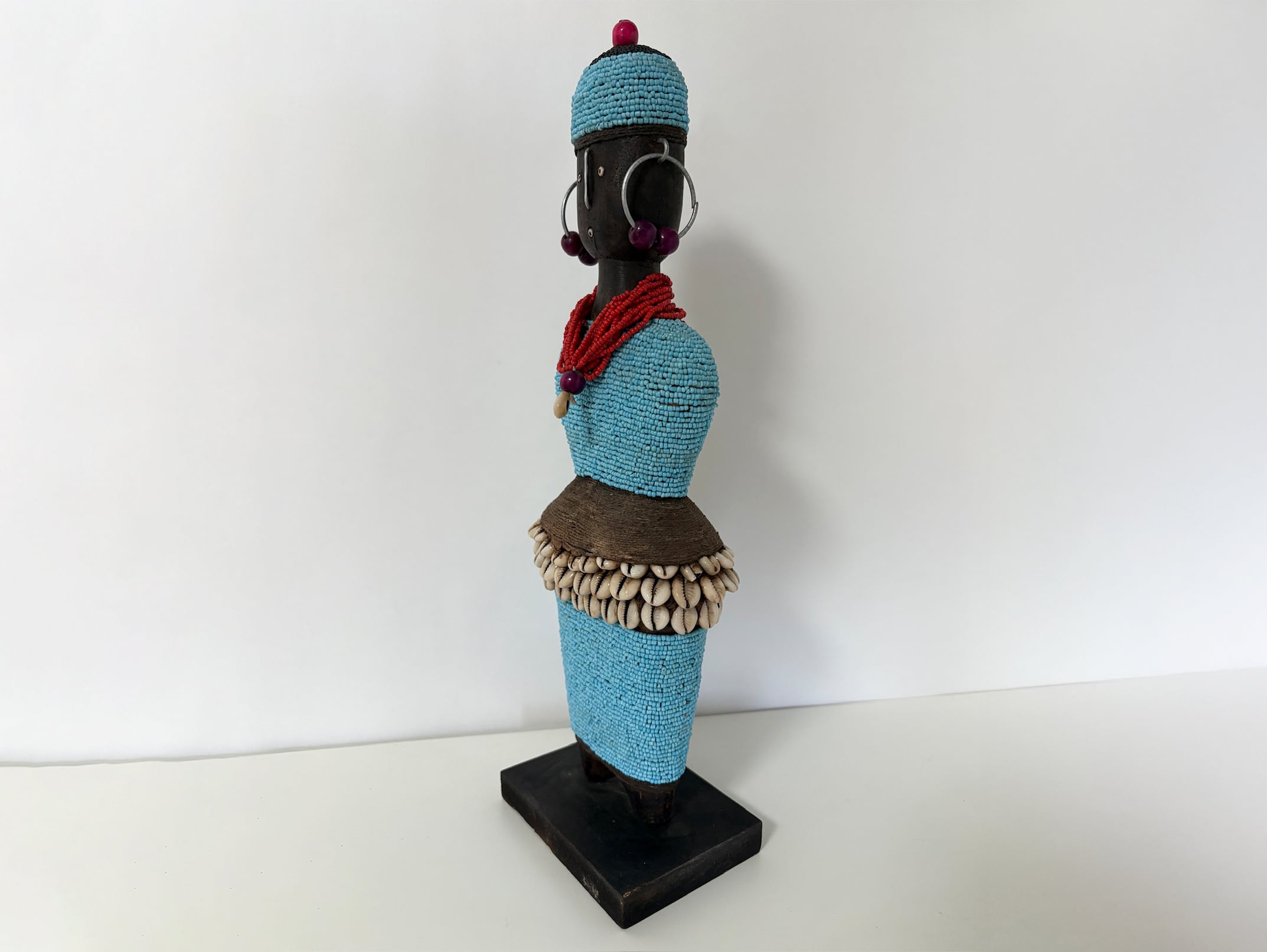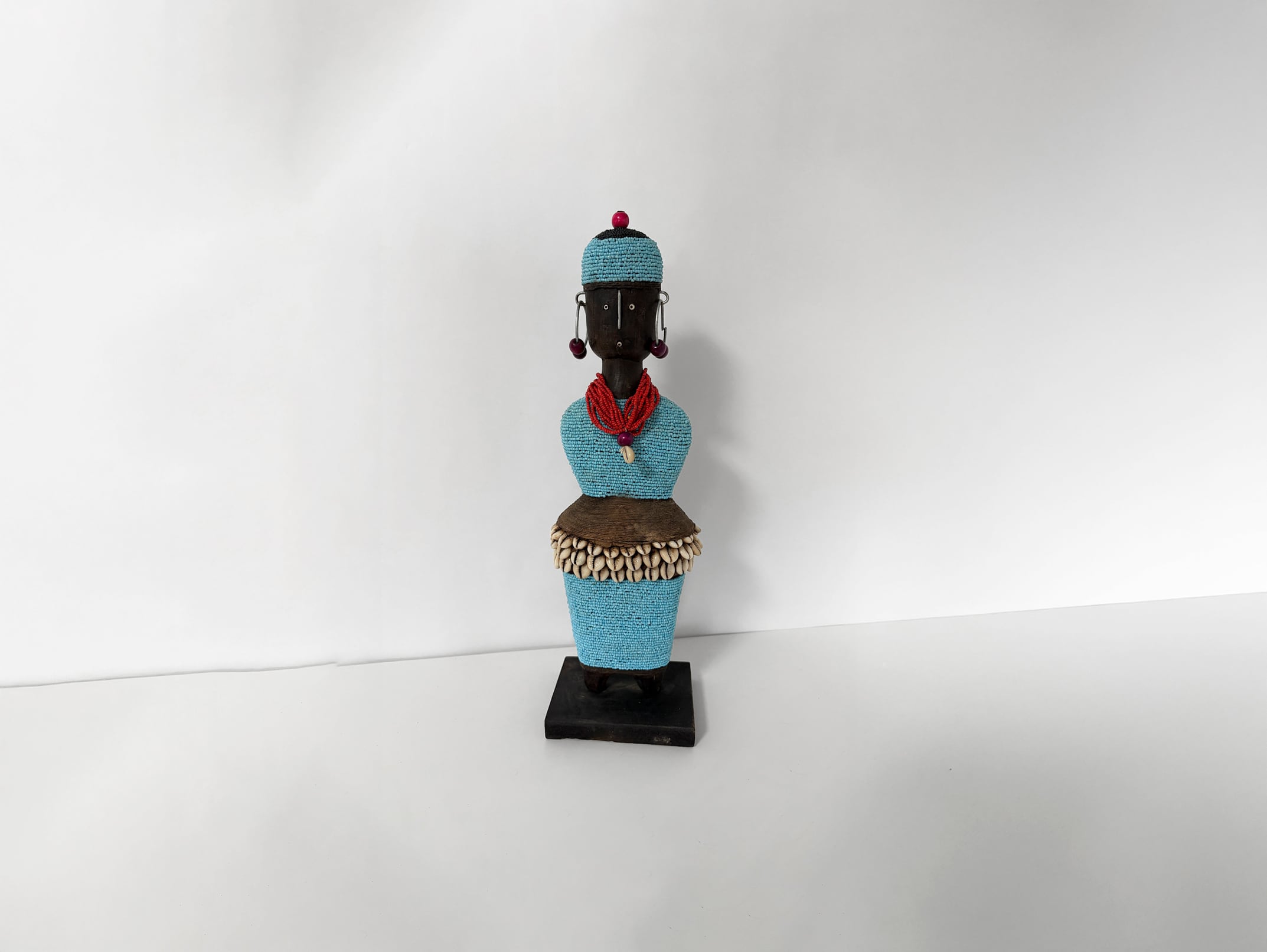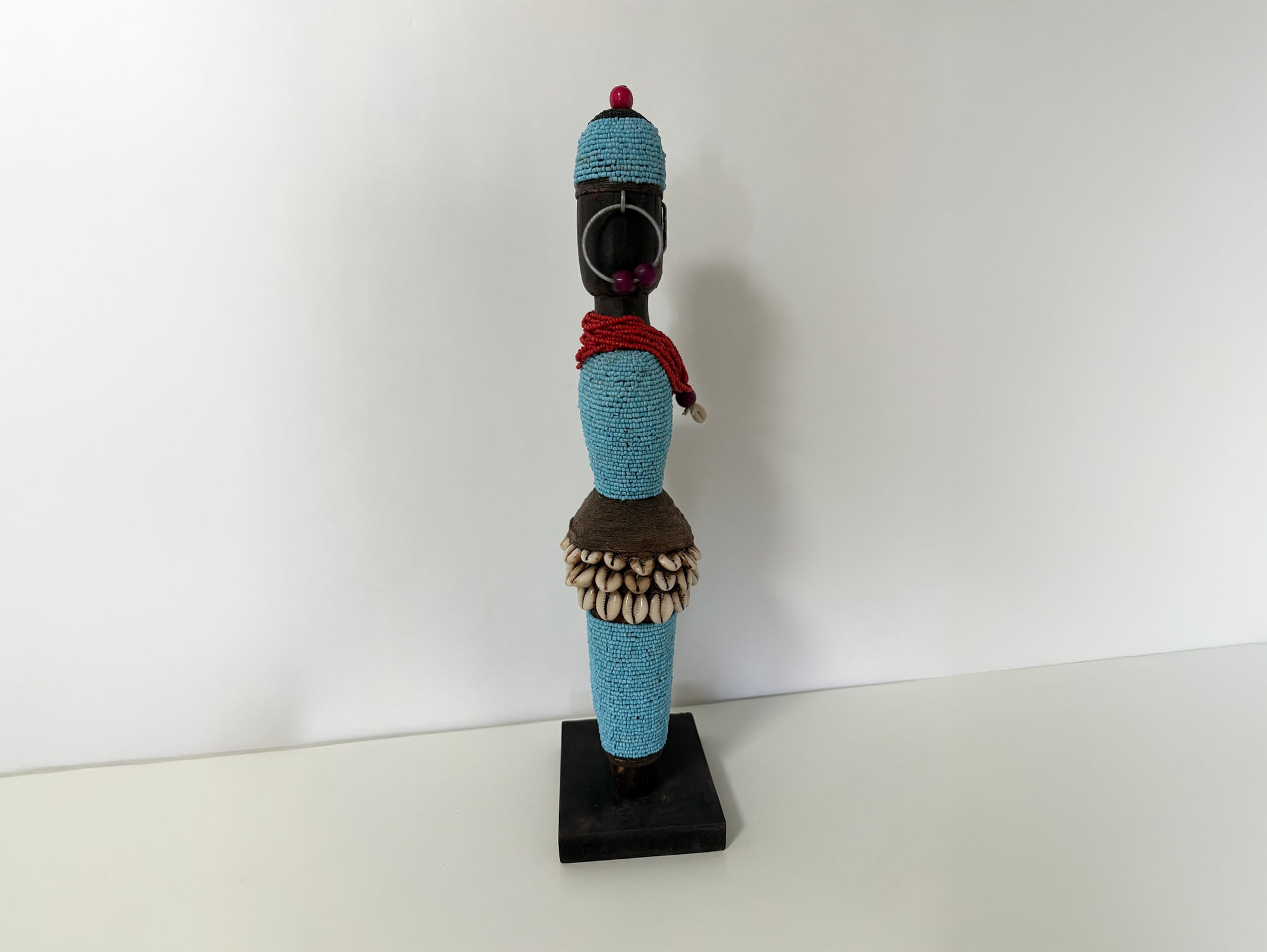 Each Namji doll is uniquely crafted, typically from carved wood and lavishly decorated with vibrant beads, cowrie shells, leather, and metal, all of which carry deep symbolic meanings.