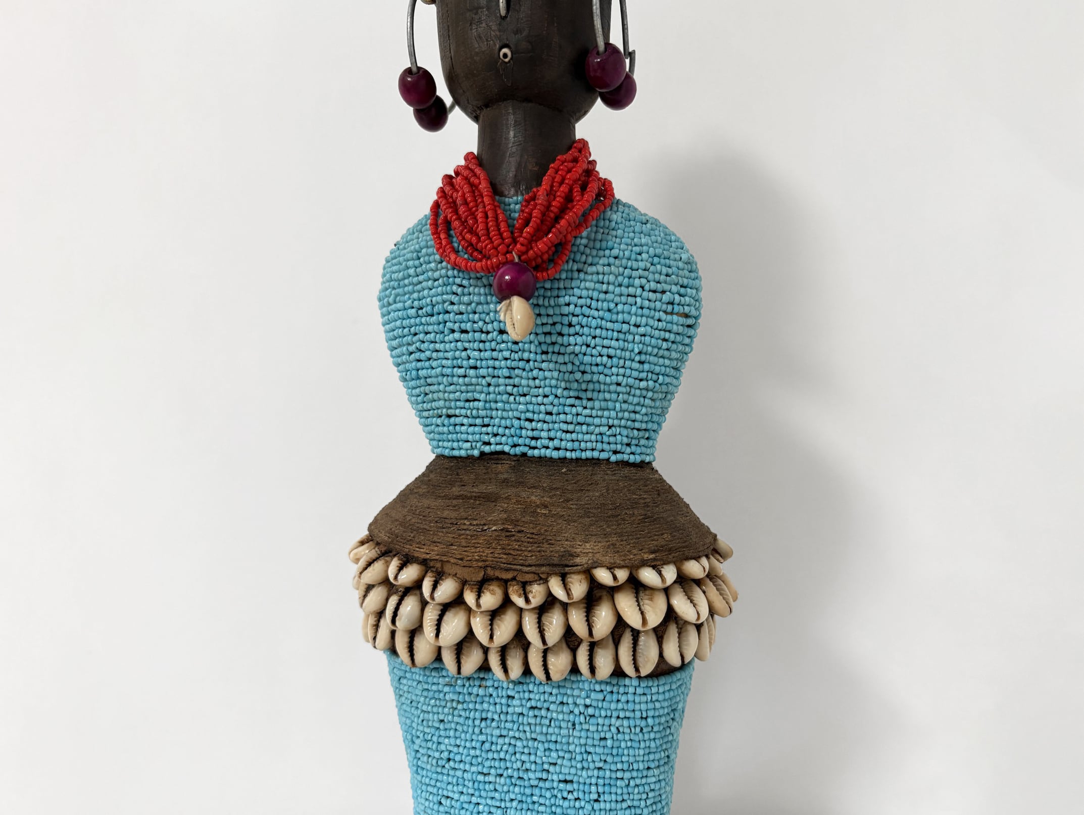 The doll featured here showcases rows of cowrie shells arranged on the head—these shells were once used as currency in ancient Africa and are believed to represent wealth, protection, and spiritual strength.