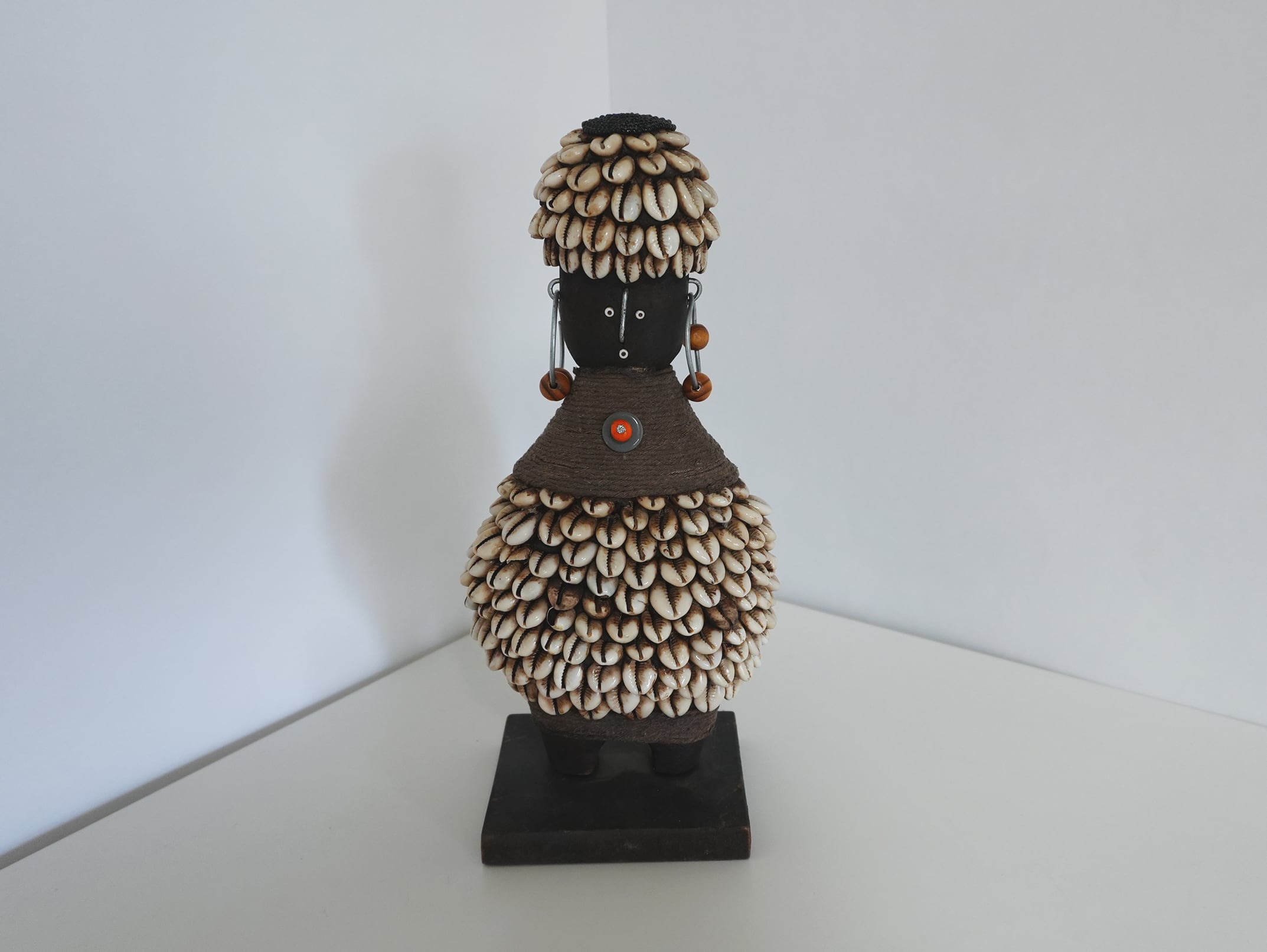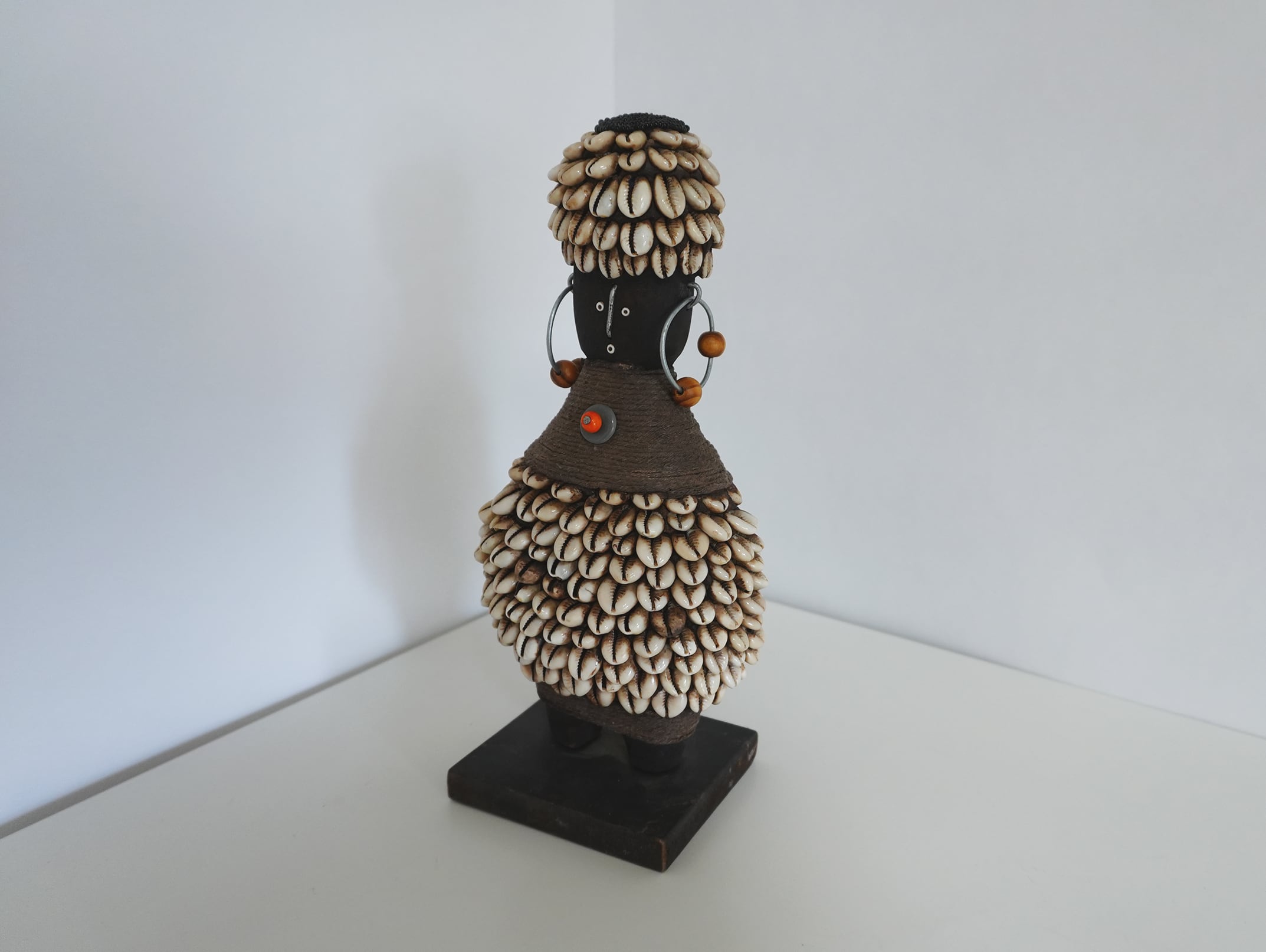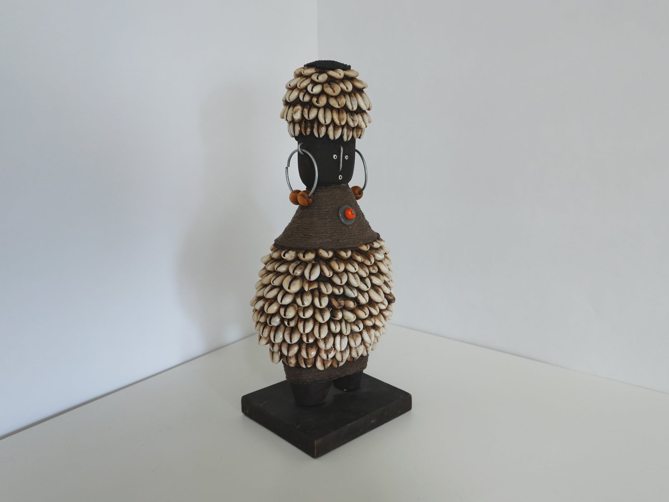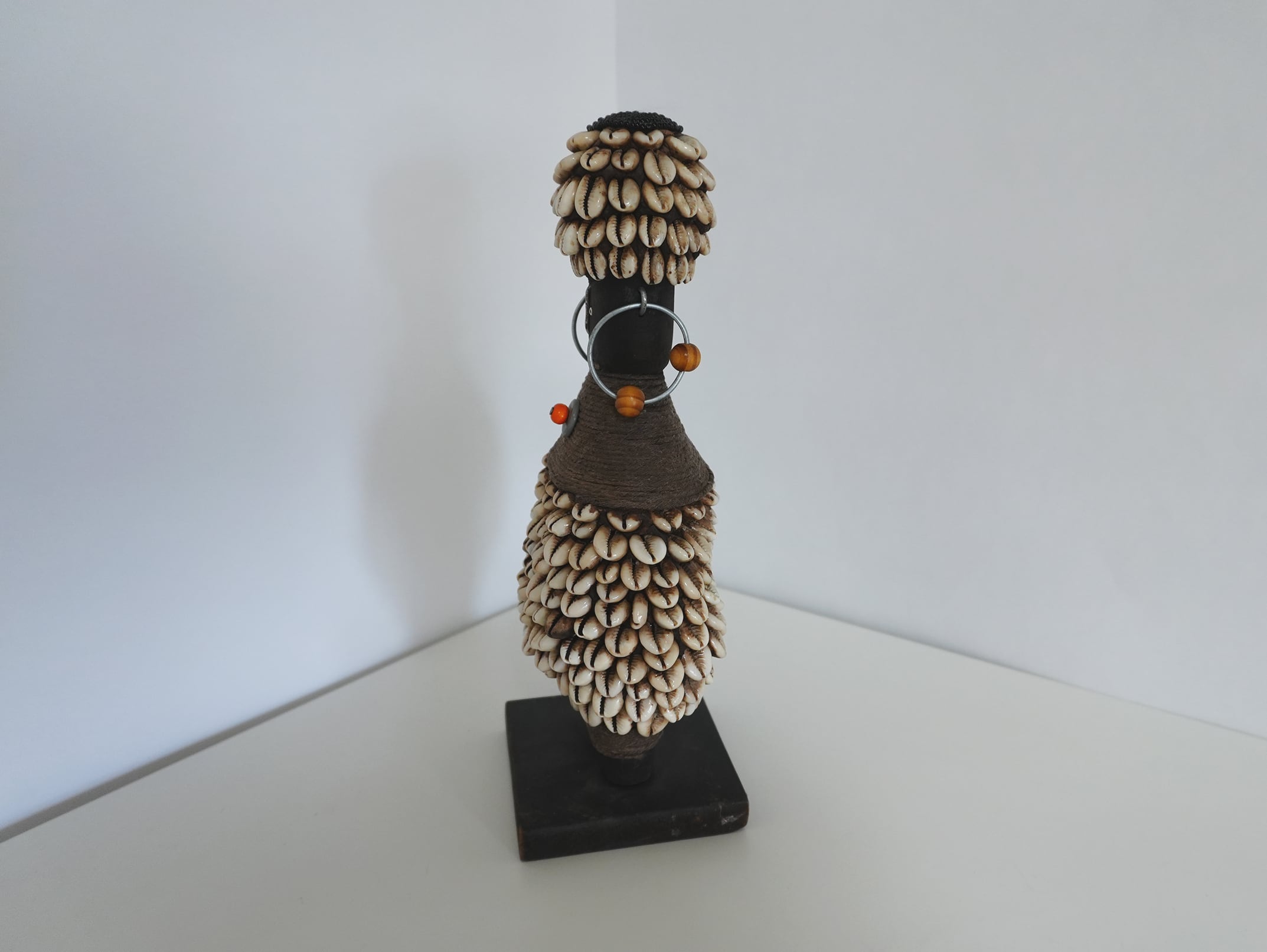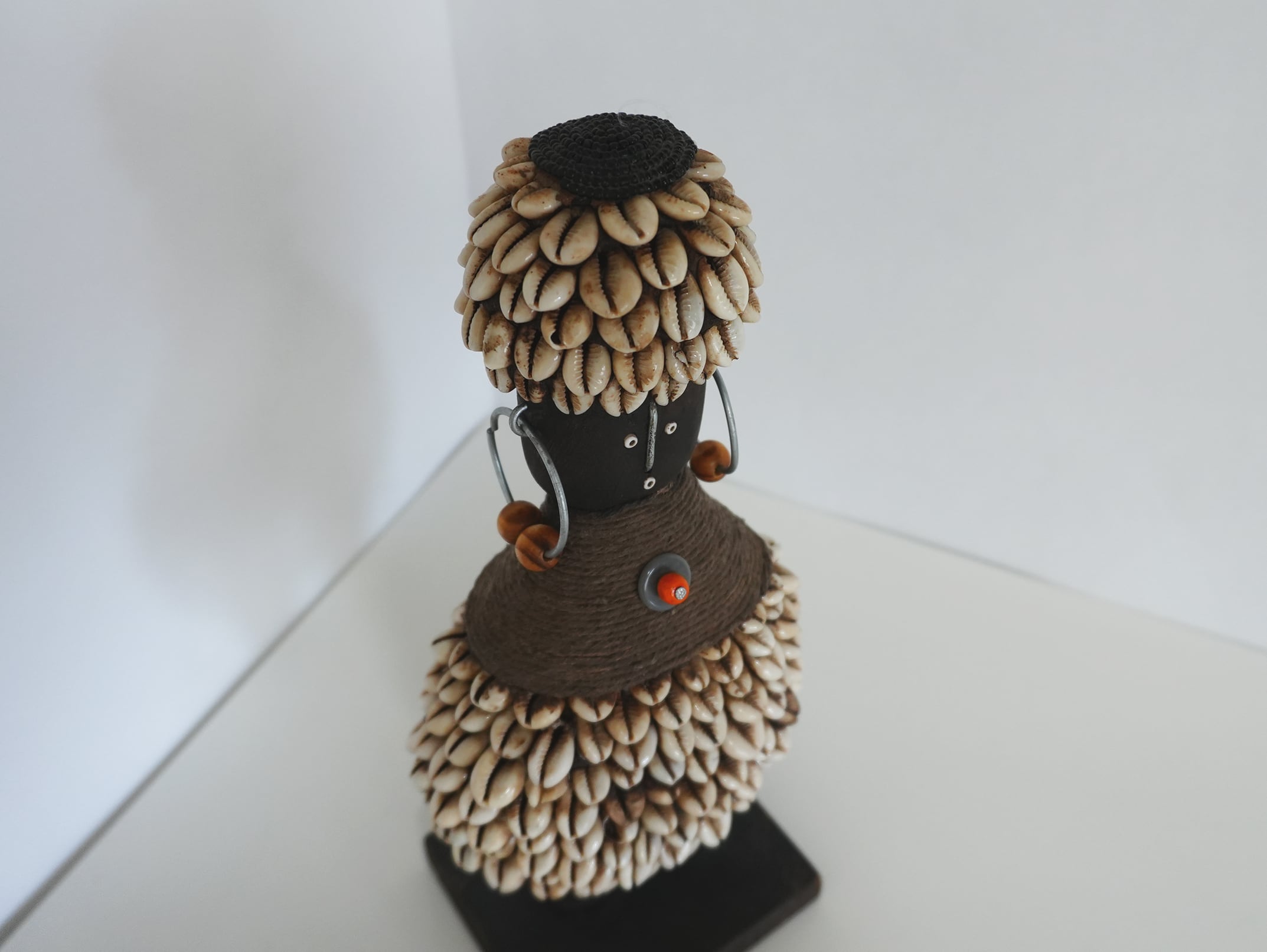 This unique piece is richly adorned with cowrie shells, once used as currency across Africa and still revered as symbols of wealth, femininity, and spiritual protection.