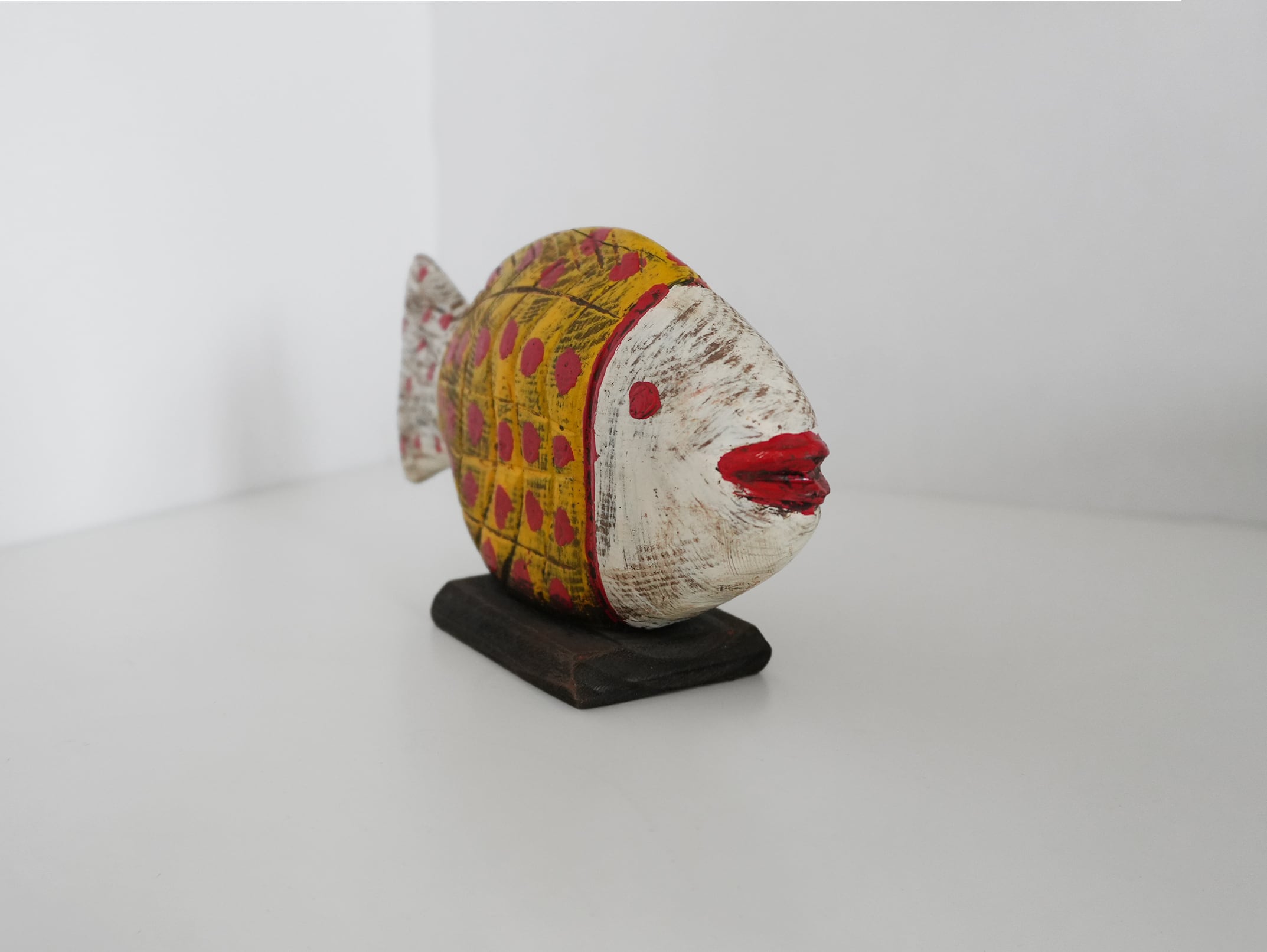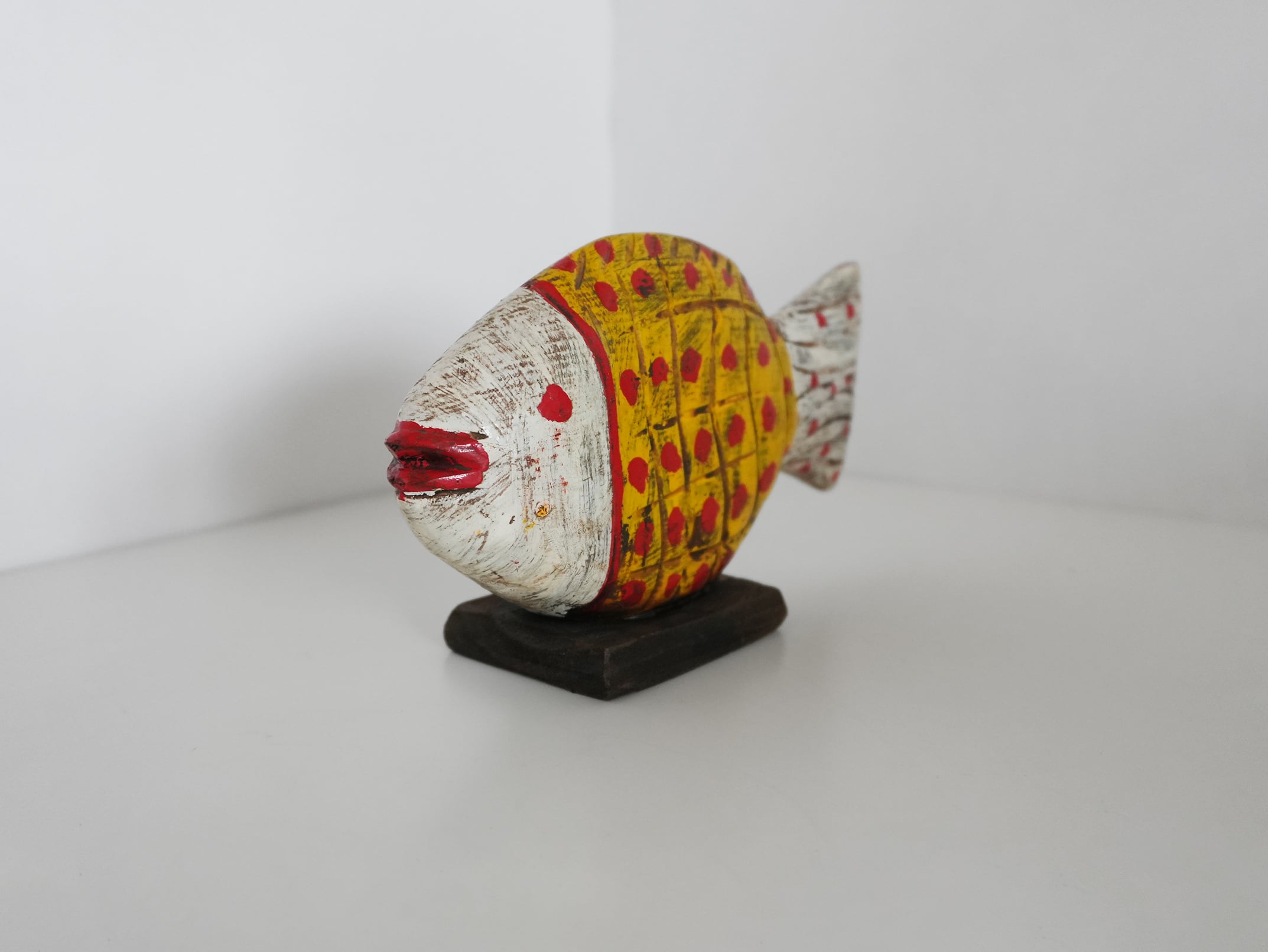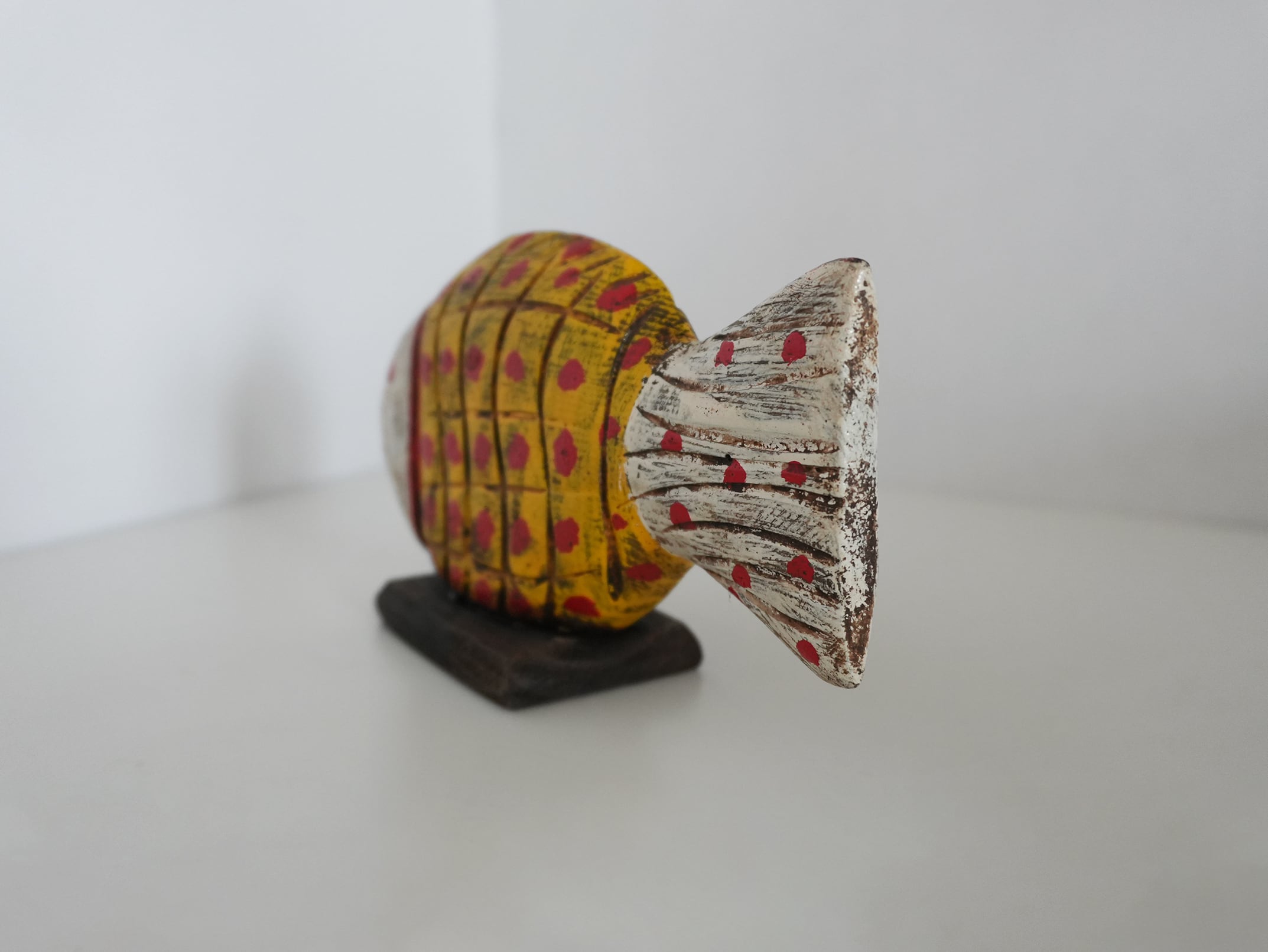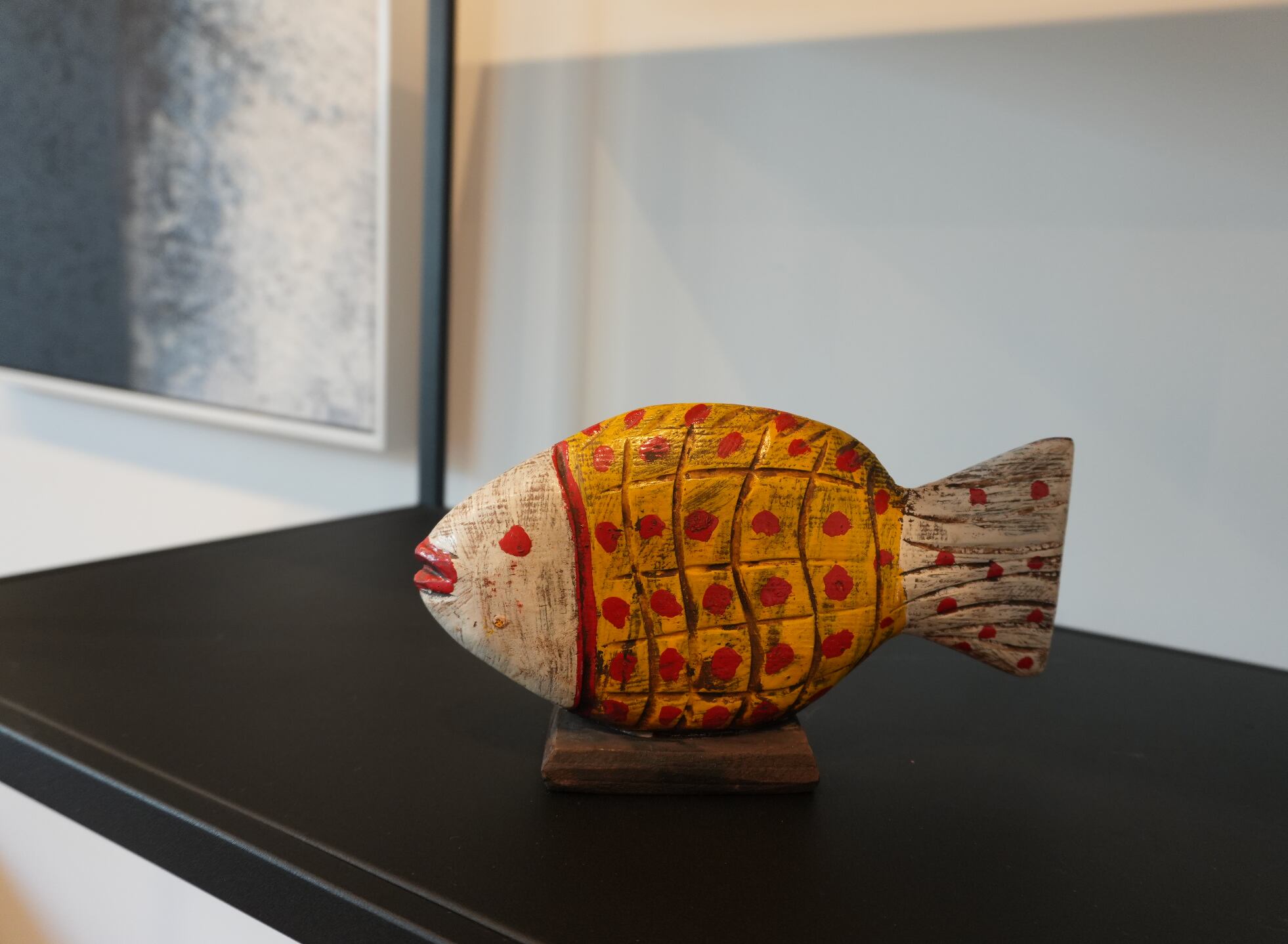 This hand-carved wooden fish object was discovered in the souks of Morocco.