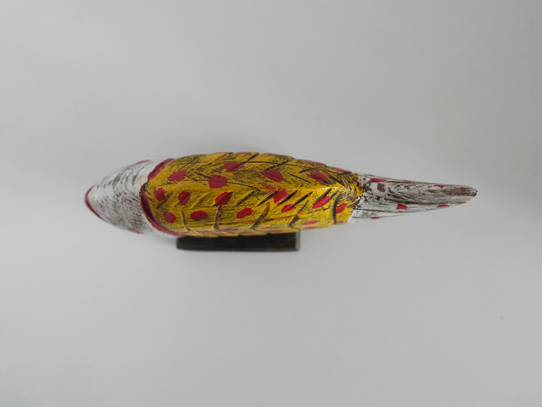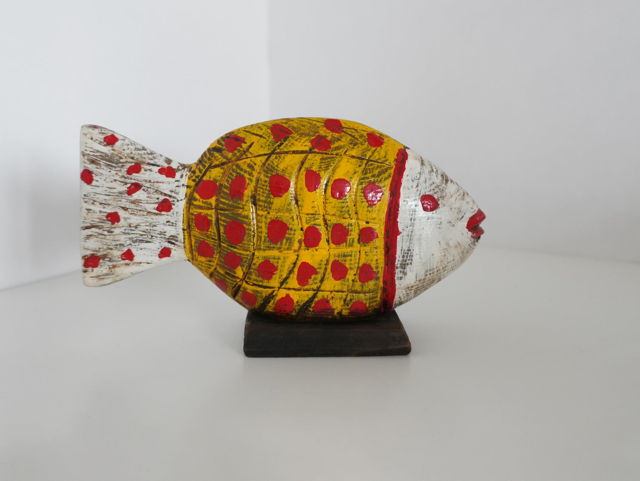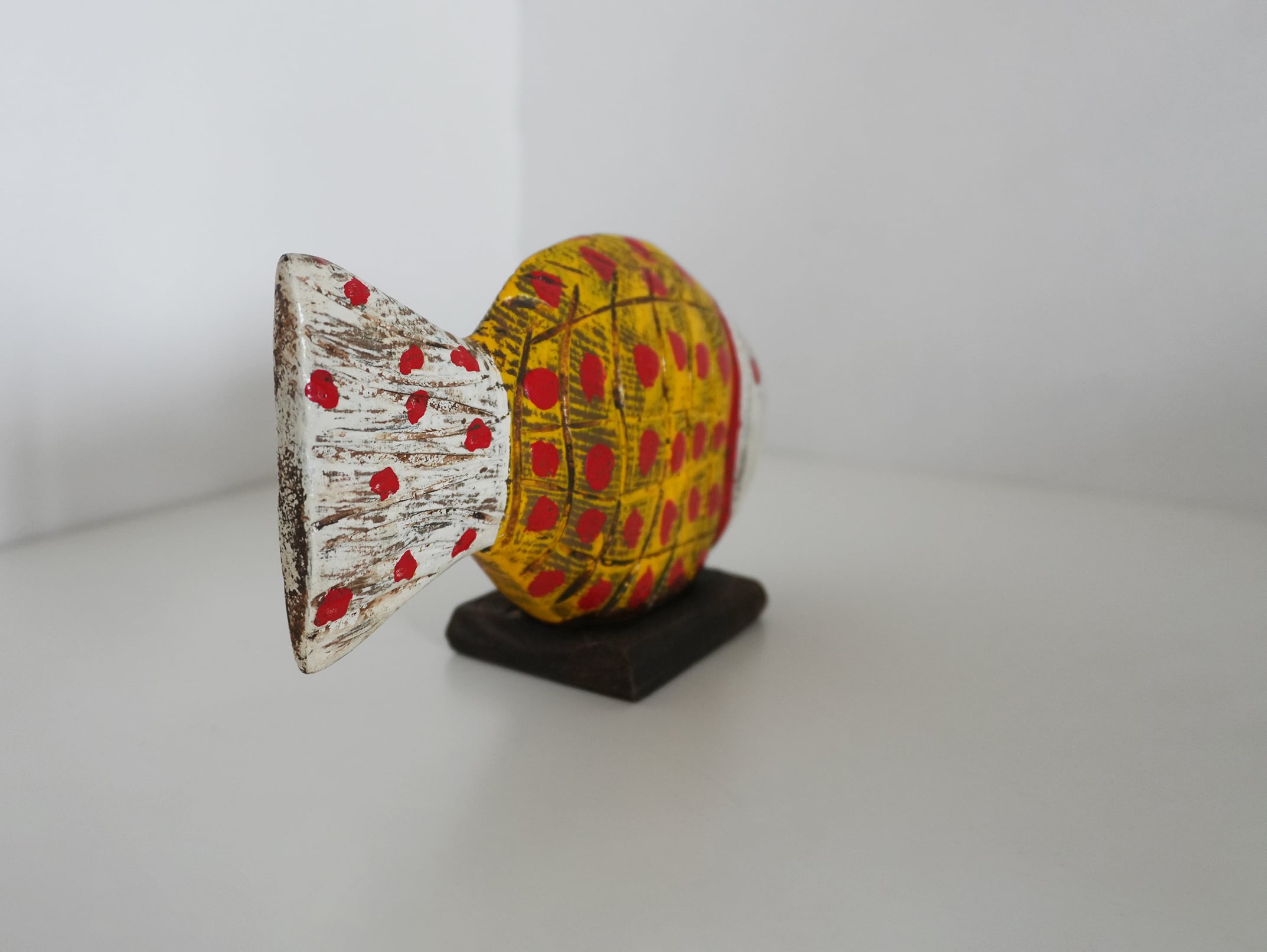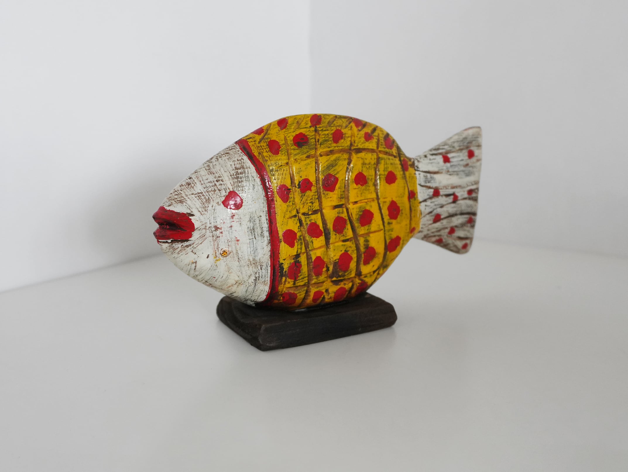This hand-carved wooden fish object was discovered in the souks of Morocco.