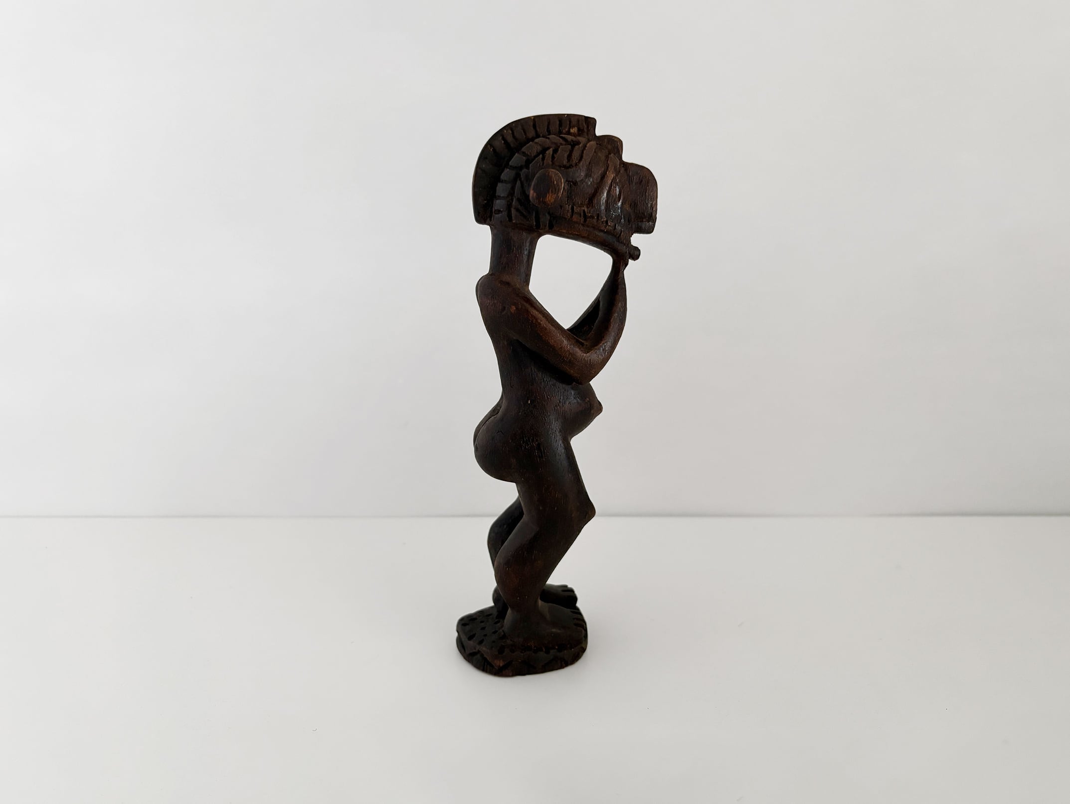 この像は、村の祭礼で使われる肩掛け式の巨大なマスクを原型にしており、家庭の守護や豊作祈願の象徴として小型化されたものです。