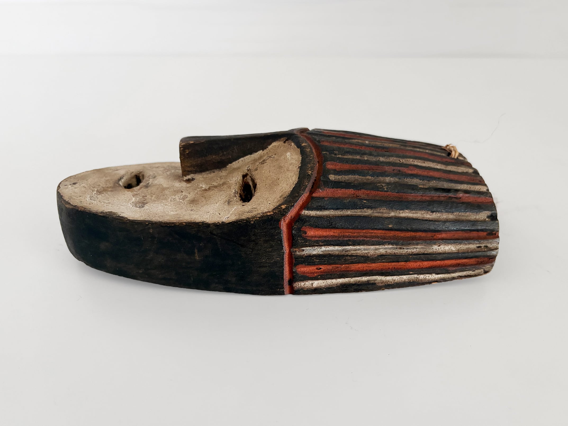 ブワミ社会では、人が成長する段階を精神的に表現し、人生の教訓や徳を語る際にこの仮面が登場します。白く塗られた顔はカオリン(白土)によるもので、魂の清らかさや祖先とのつながりを象徴し、静寂と精神性を宿した表情が印象的です。