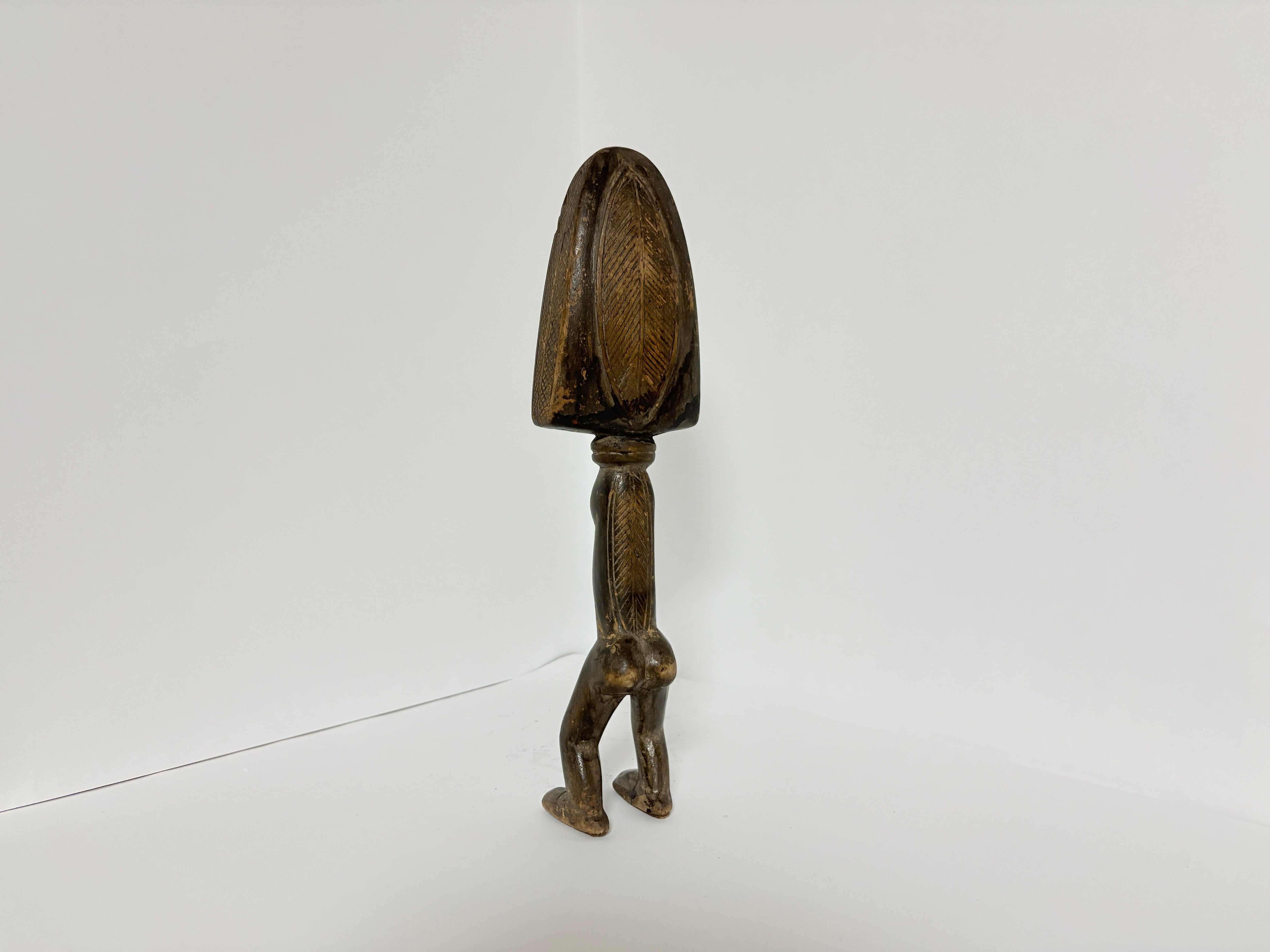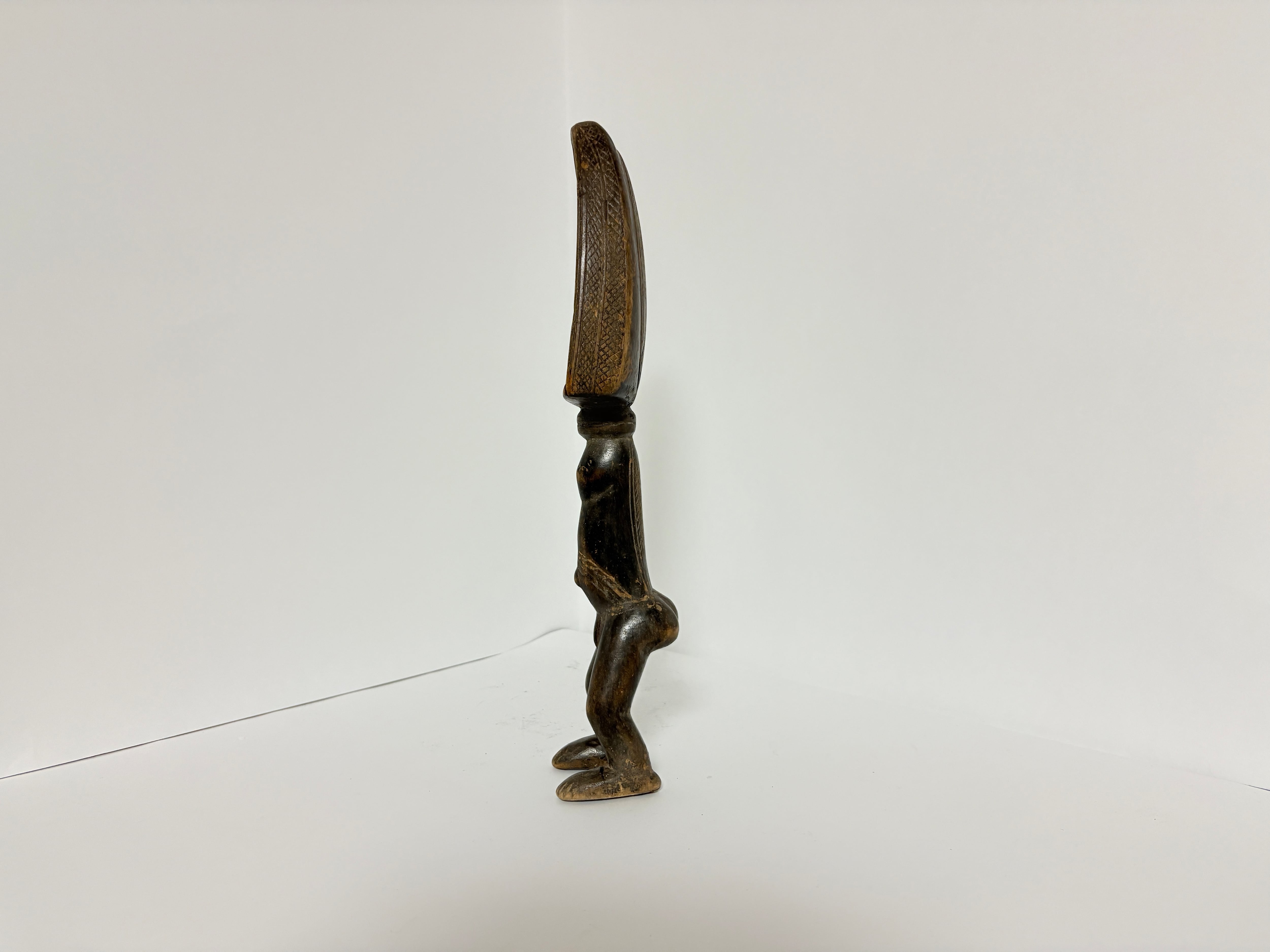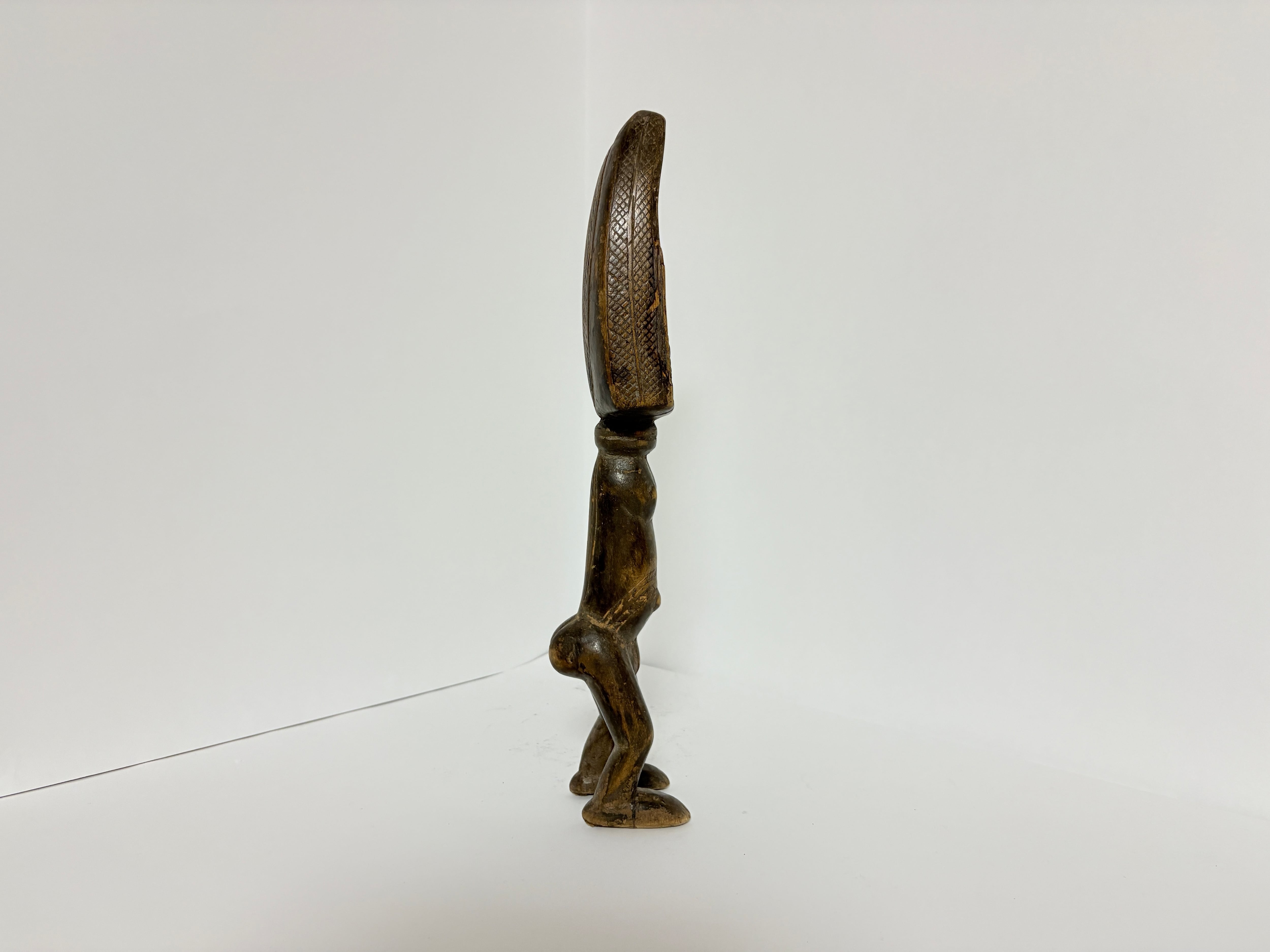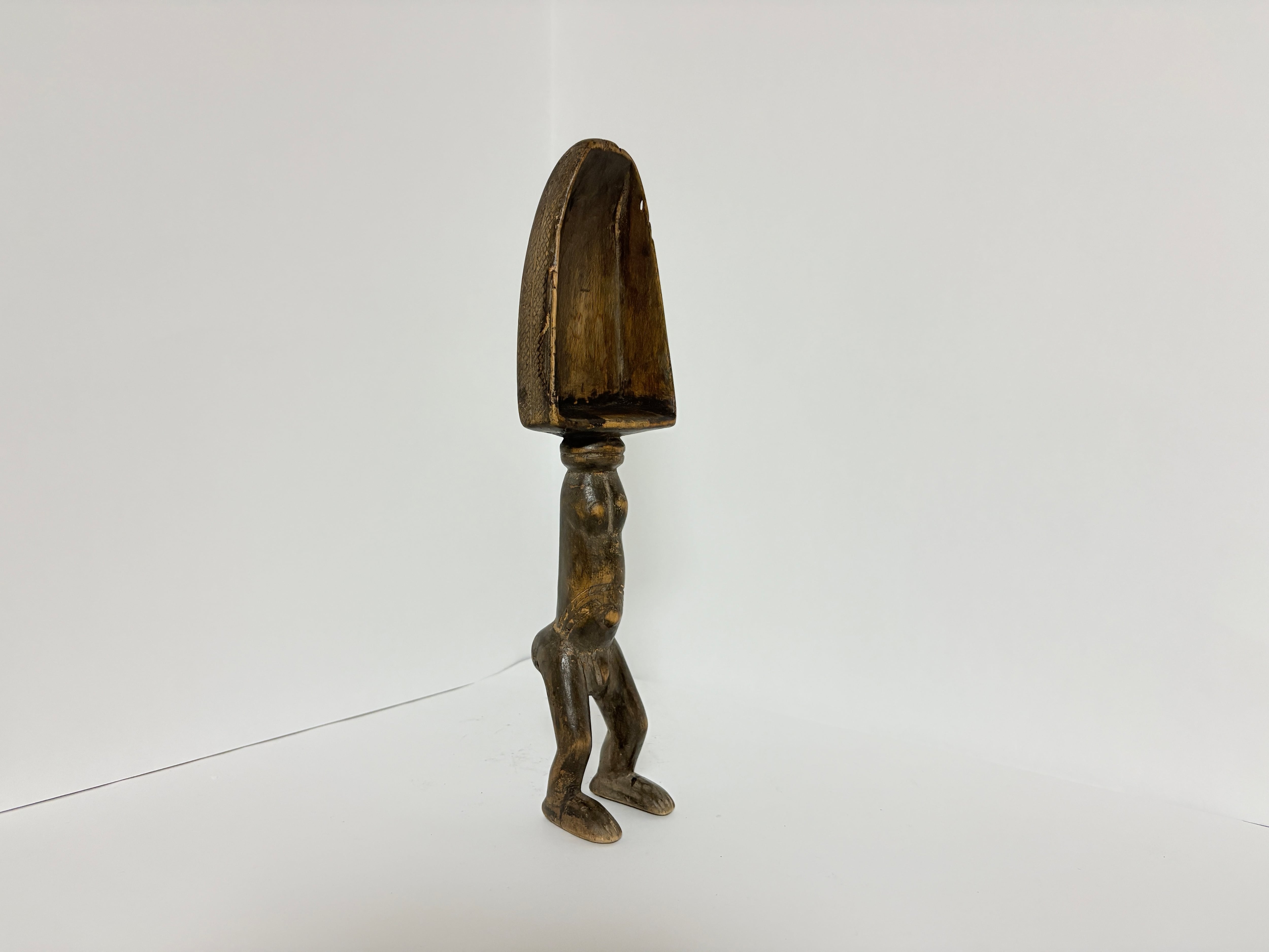 バウレ族のスプーンの多くは上部(柄部分)に顔・胸・胴を表すものが多く、脚付き全身像は比較的珍しい形状です。