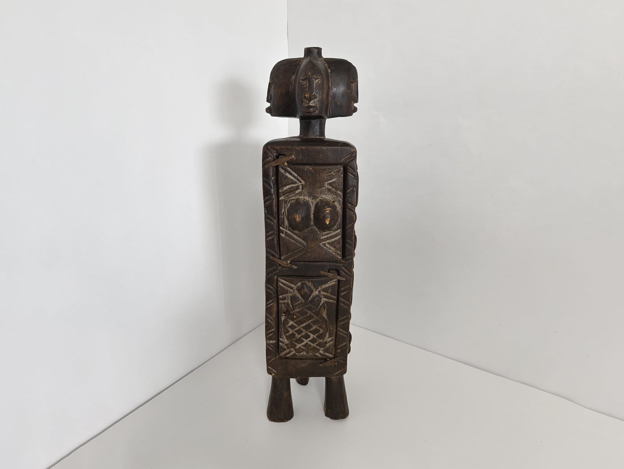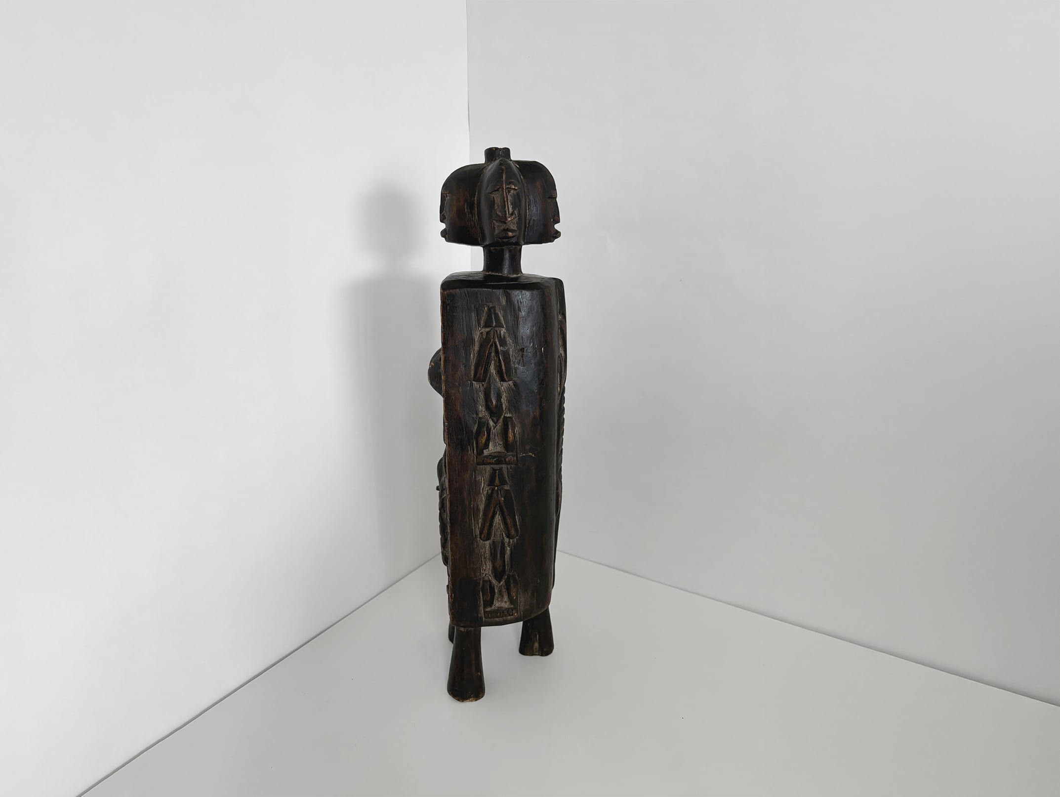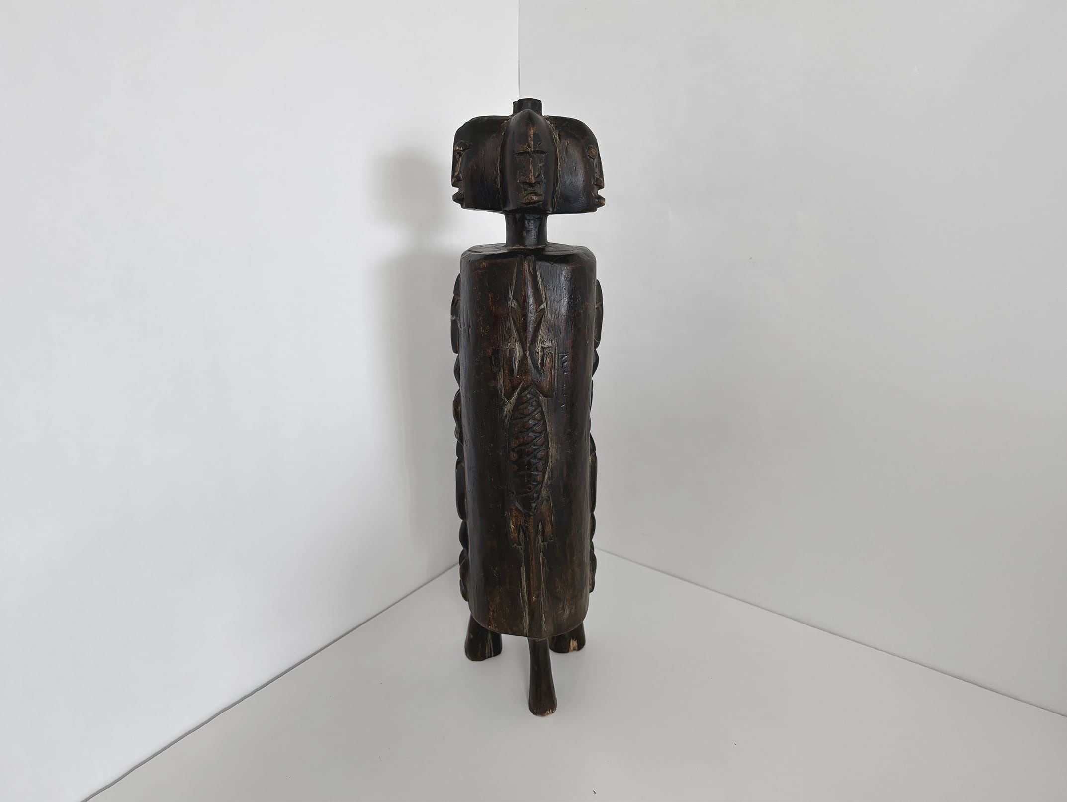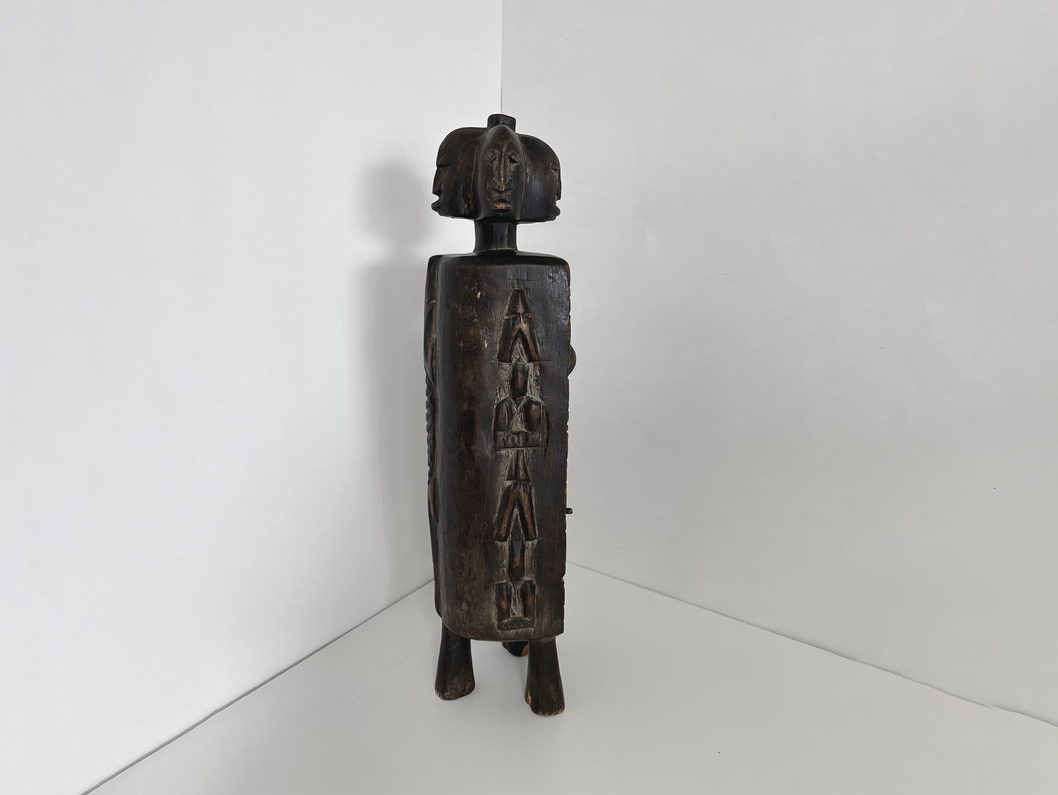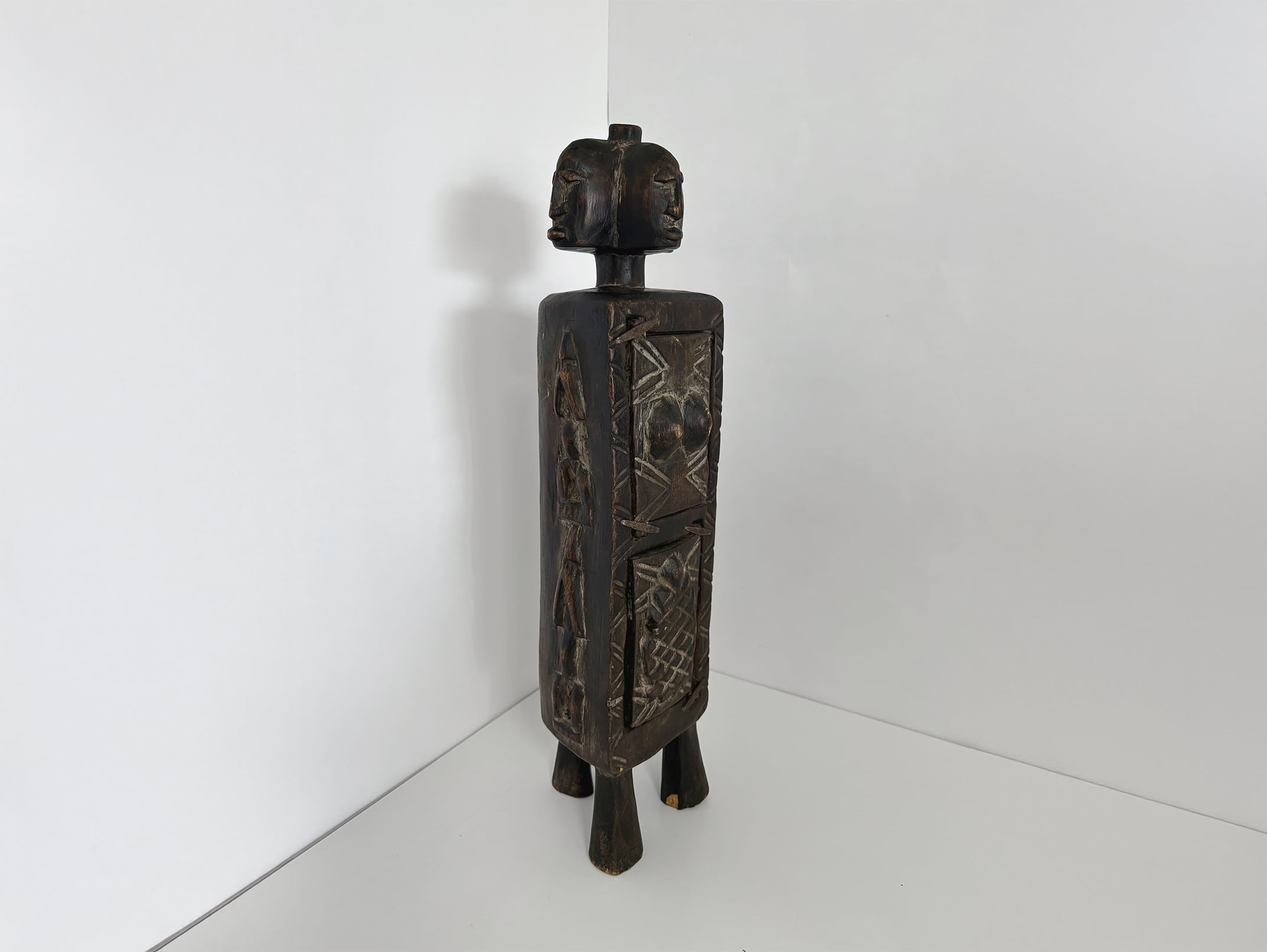 正面には幾何学的な文様が精緻に刻まれ、上部には四つの頭部を持つ人像が配されています。これは単なる装飾ではなく、ドゴン族の宇宙観に基づいた深い意味を持つ重要な意匠です。