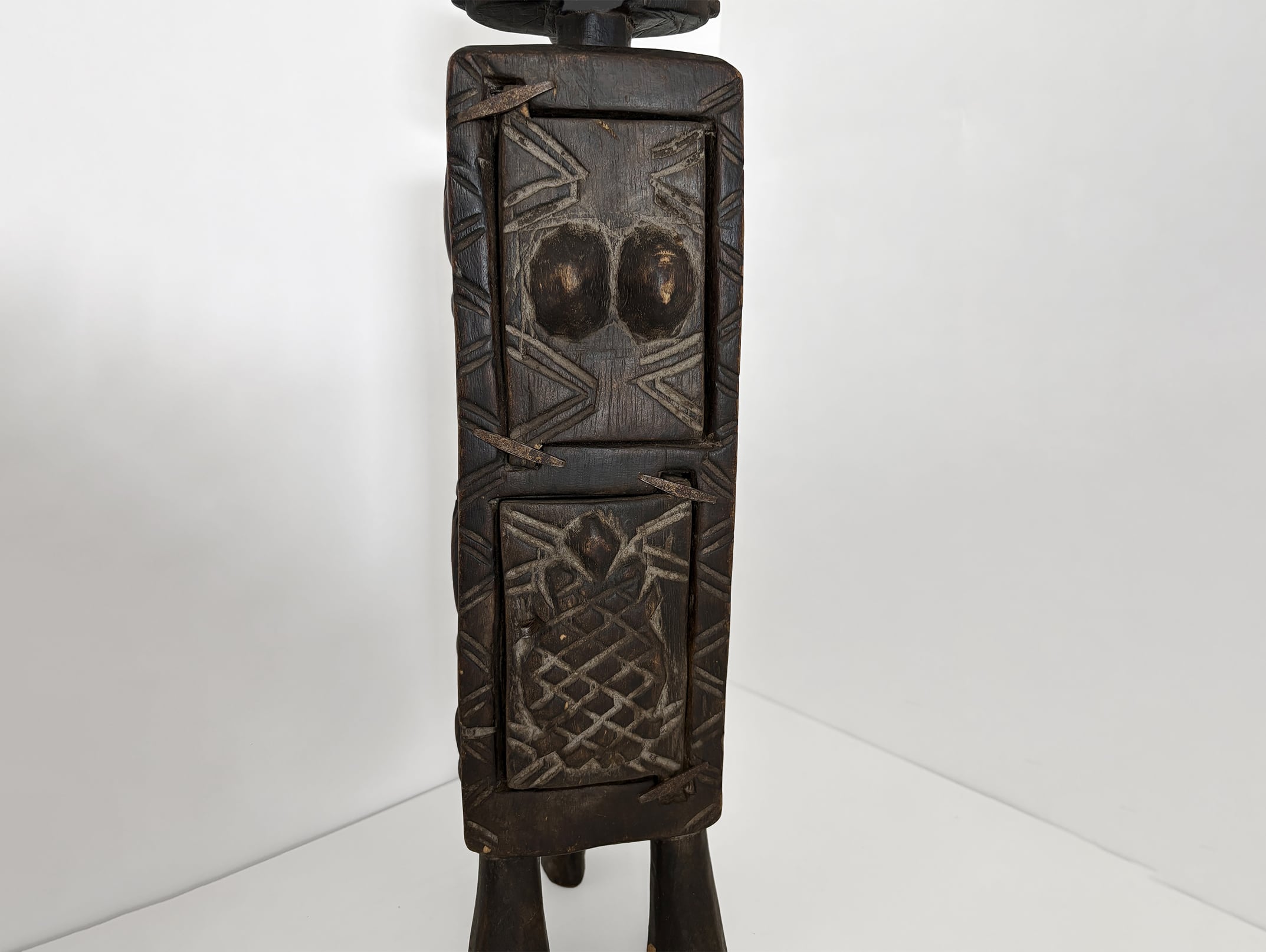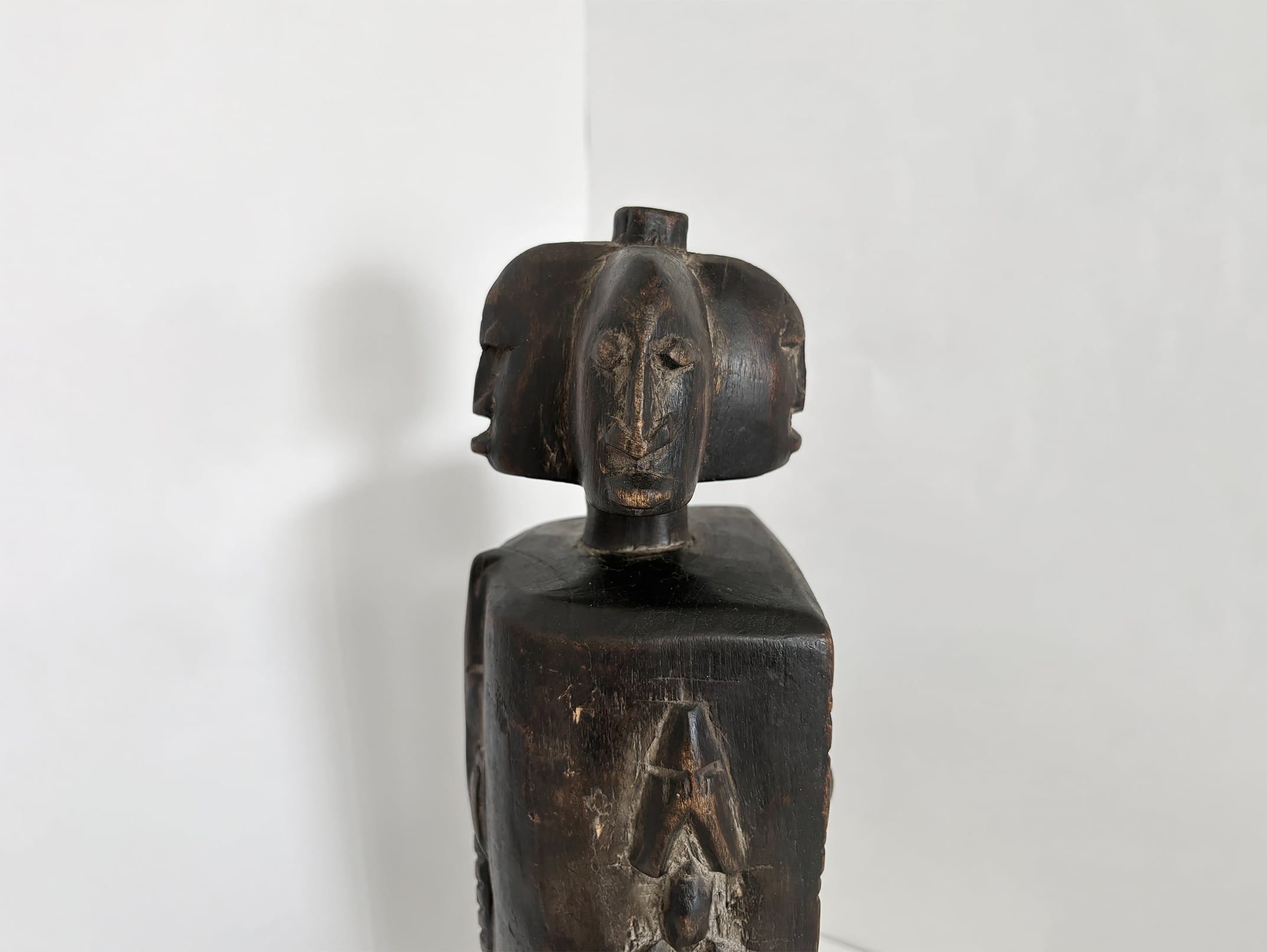 The central symbolic motif and the small standing figures carved at the top represent ancestors or protective spirits.