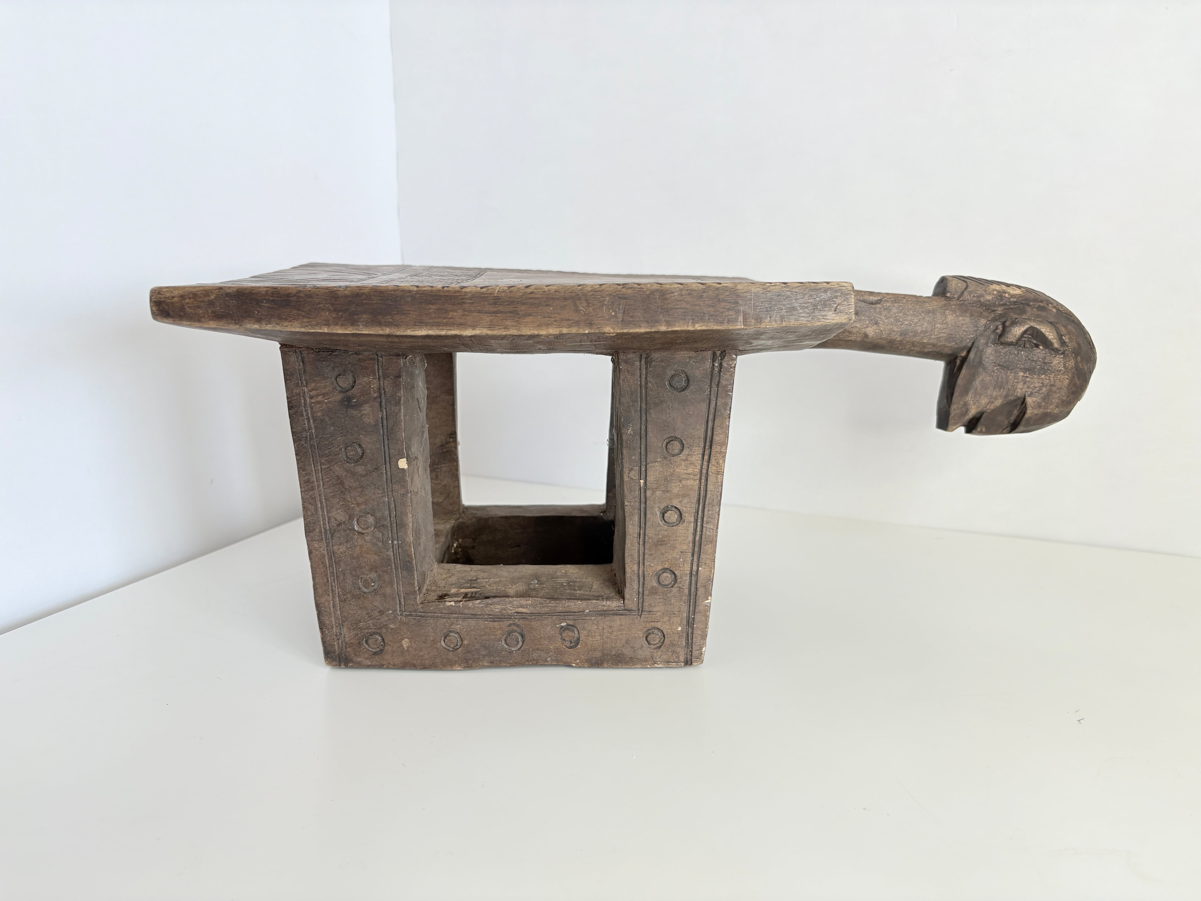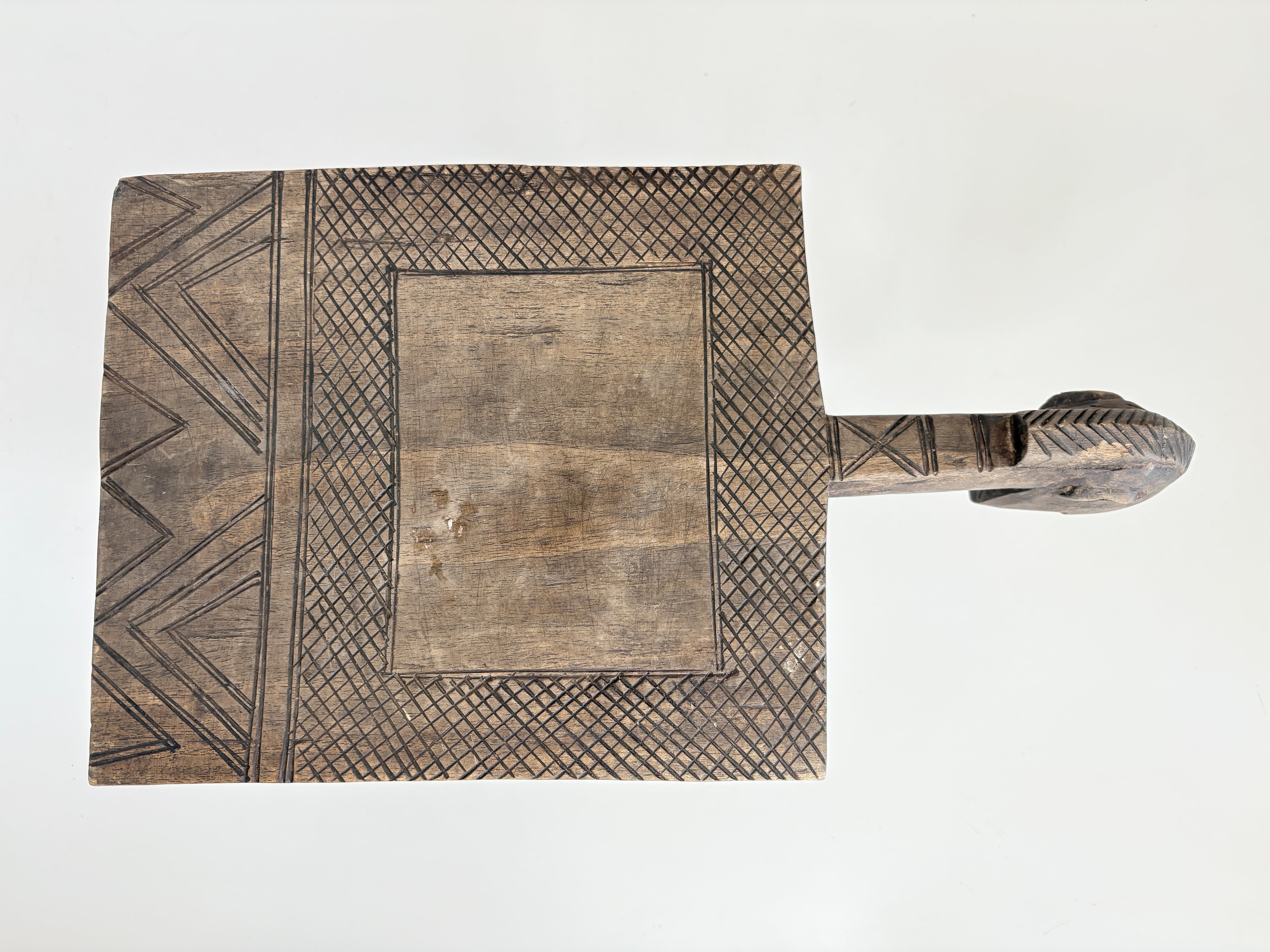 座面・側面・持ち手に刻まれた細密な幾何学文様は、ドゴン族が受け継いできた造形美を象徴し、プリミティブアートとしても高い価値を備えています。