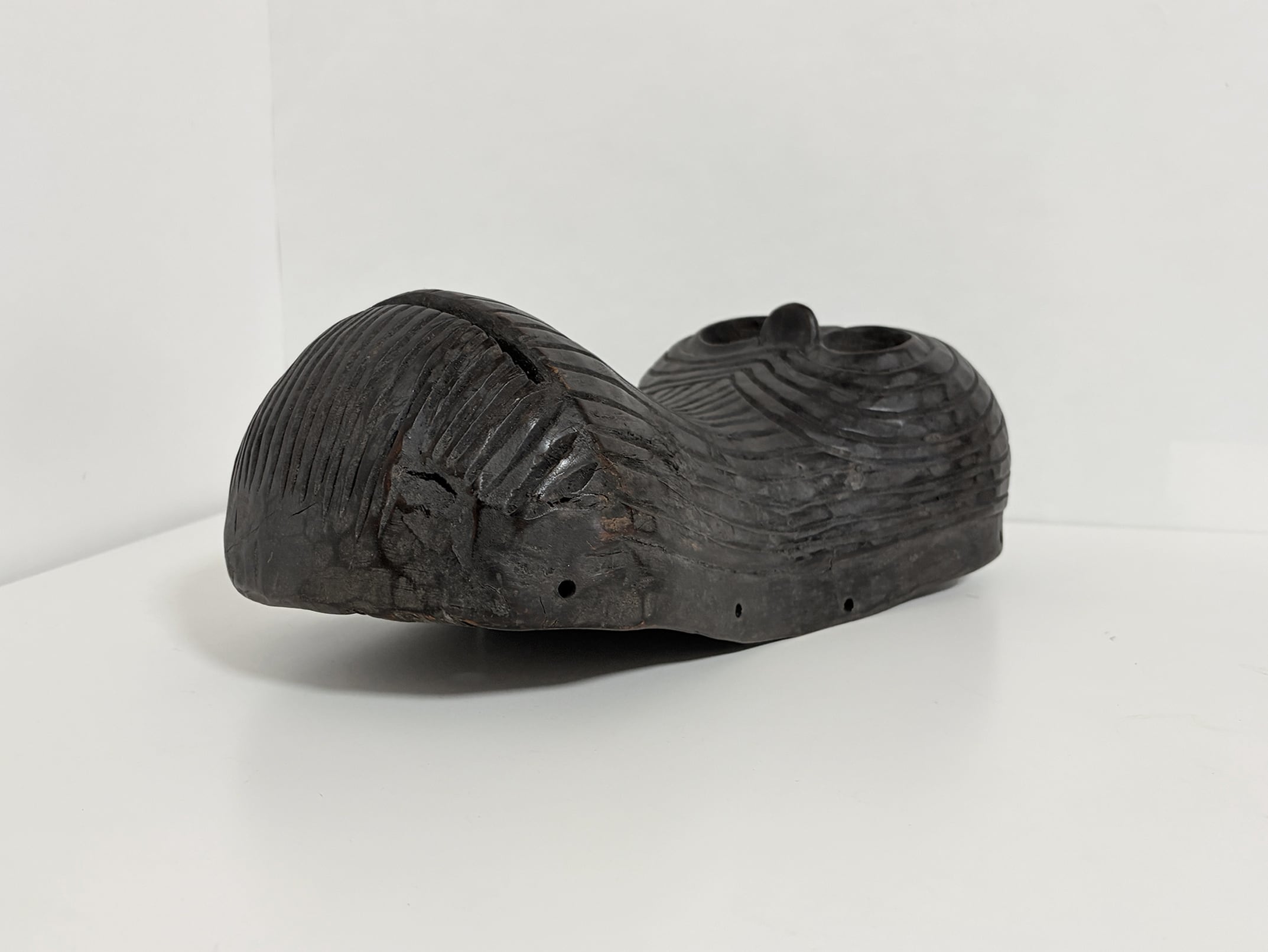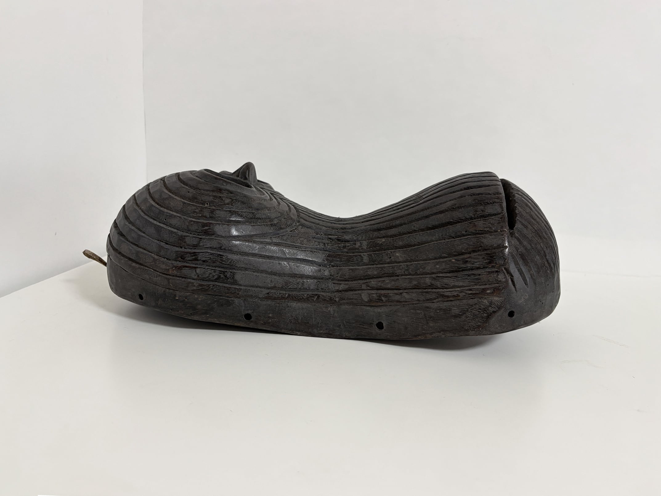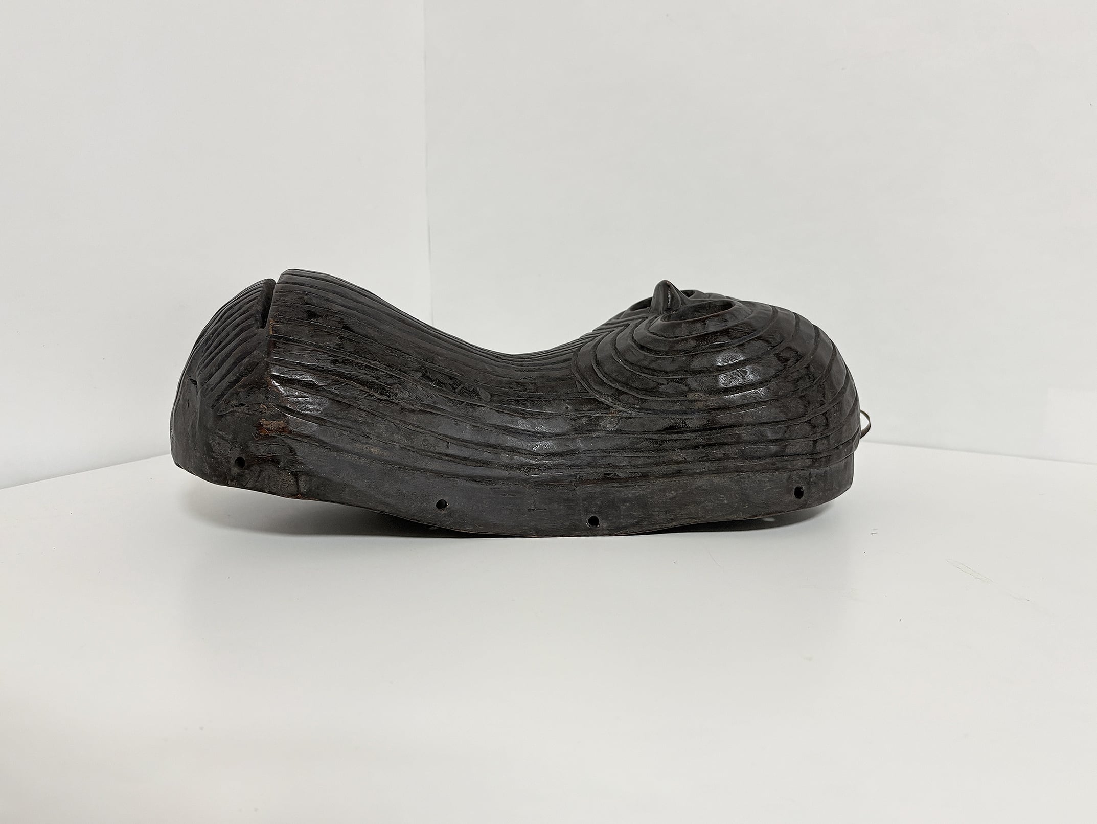 The mask was entirely hand-carved, using adzes and chisels, as shown by the visible tool marks on its interior surface. Its smooth curvature and deep-cut eyes give the impression of movement and vitality. The dark patina, enriched by time and handling, reveals both the artistry and the age of the piece. The interior shows natural wear consistent with ritual use, attesting to its authenticity and cultural significance.