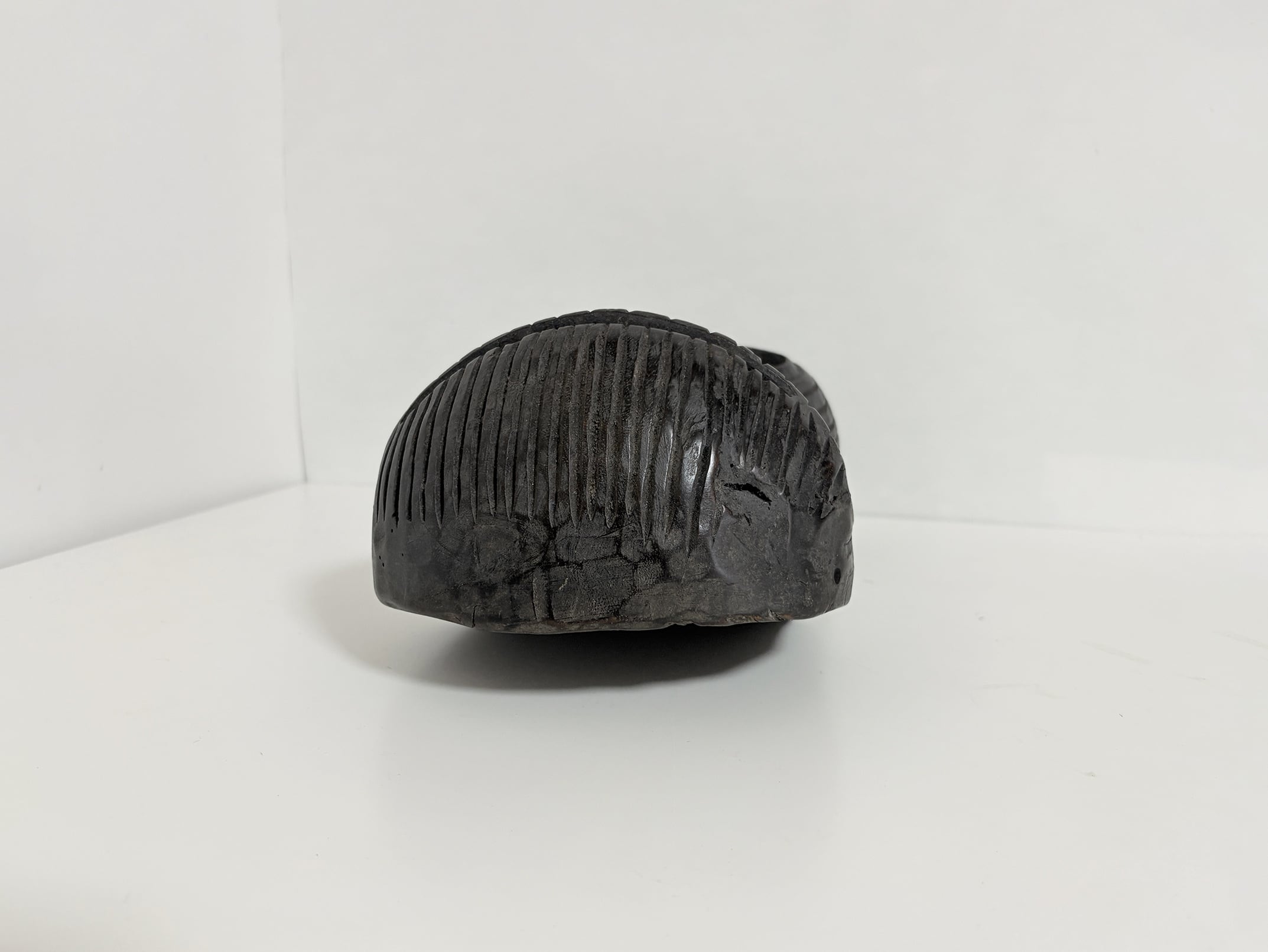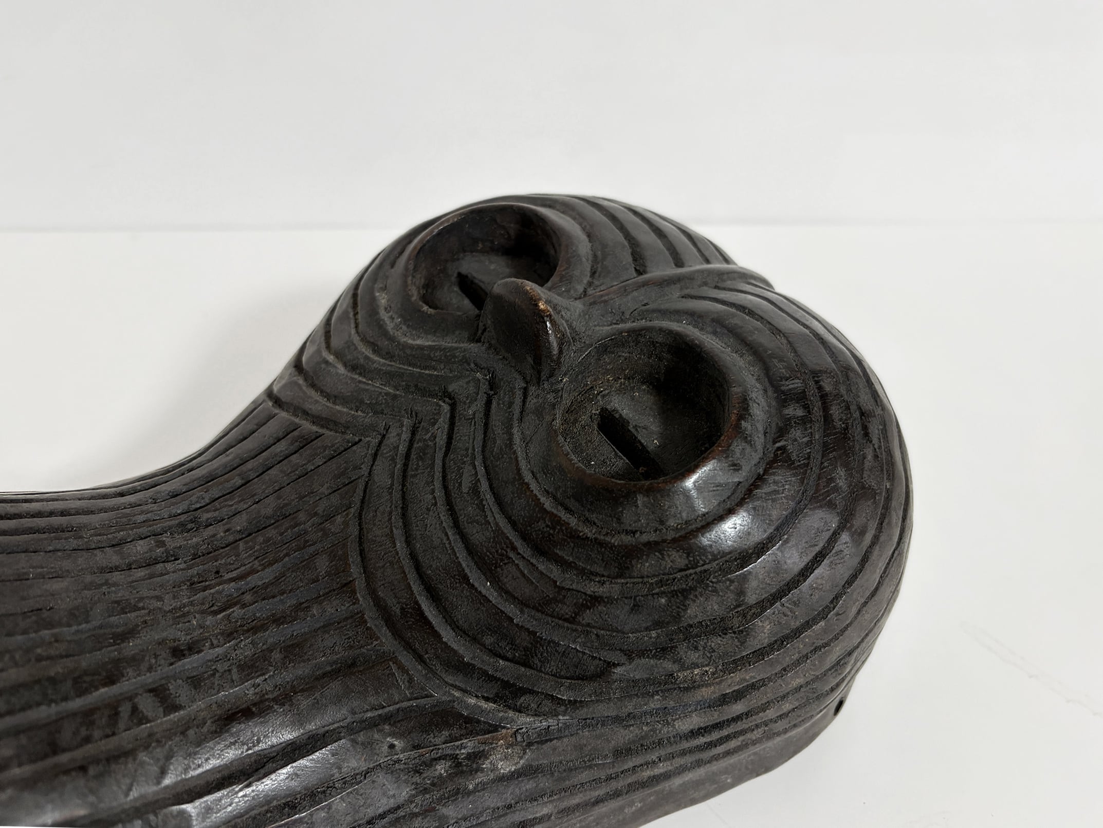 目や口にあたる部分は深く穿たれ、流れるような彫り線は装飾であると同時に造形全体に生命感を与えています。