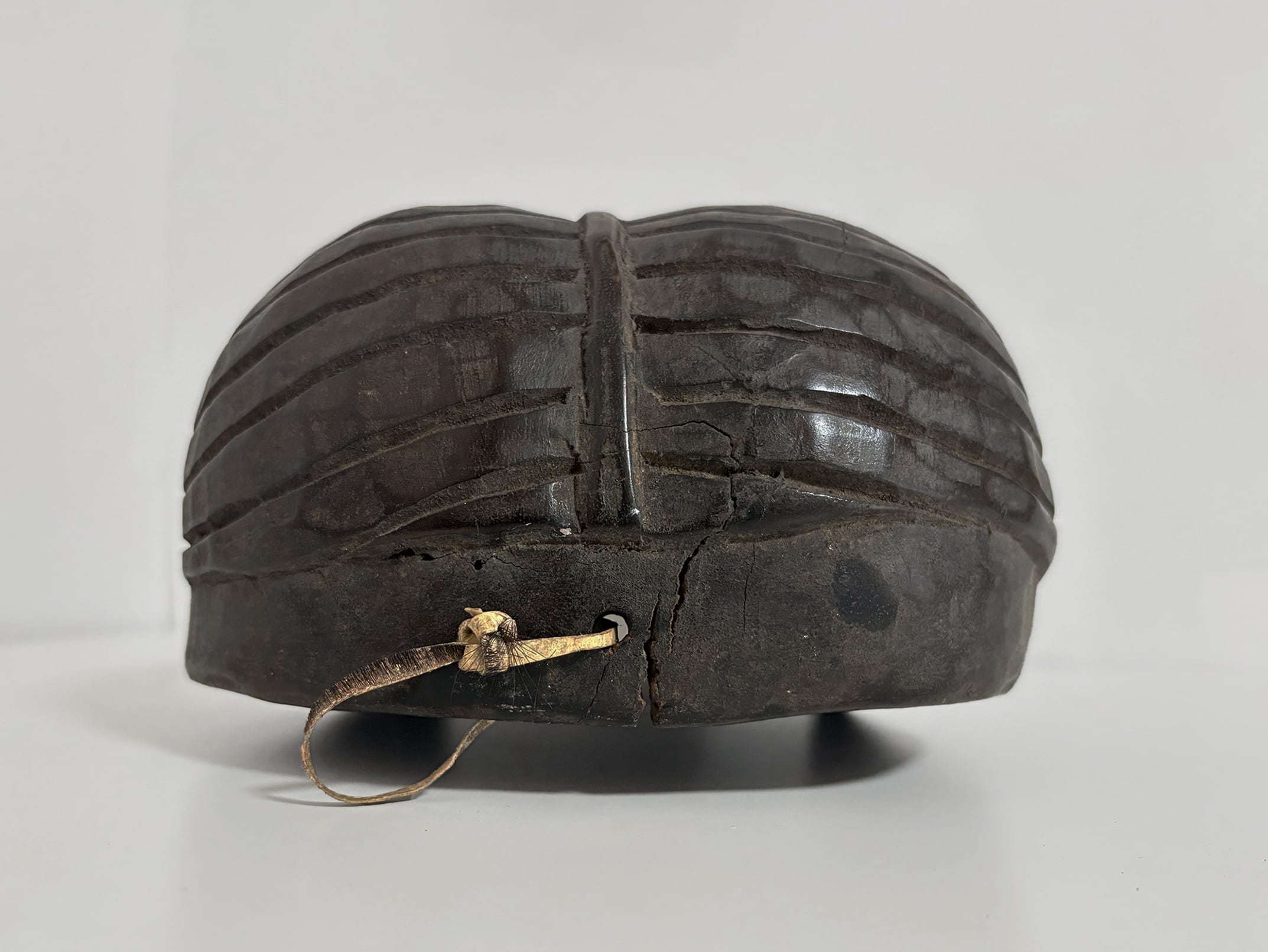 ずっしりと重いこちらのマスクは、一本の木を丹念にくり抜いて形作られたもので、内側には手斧やノミによる削り跡が残り、熟練した職人の手仕事の痕跡が随所に見られます。