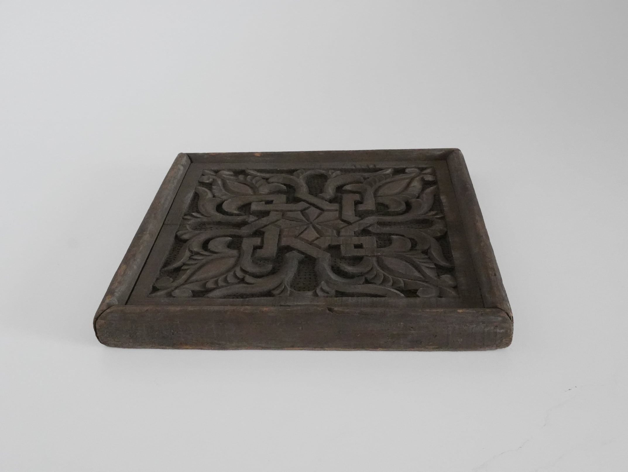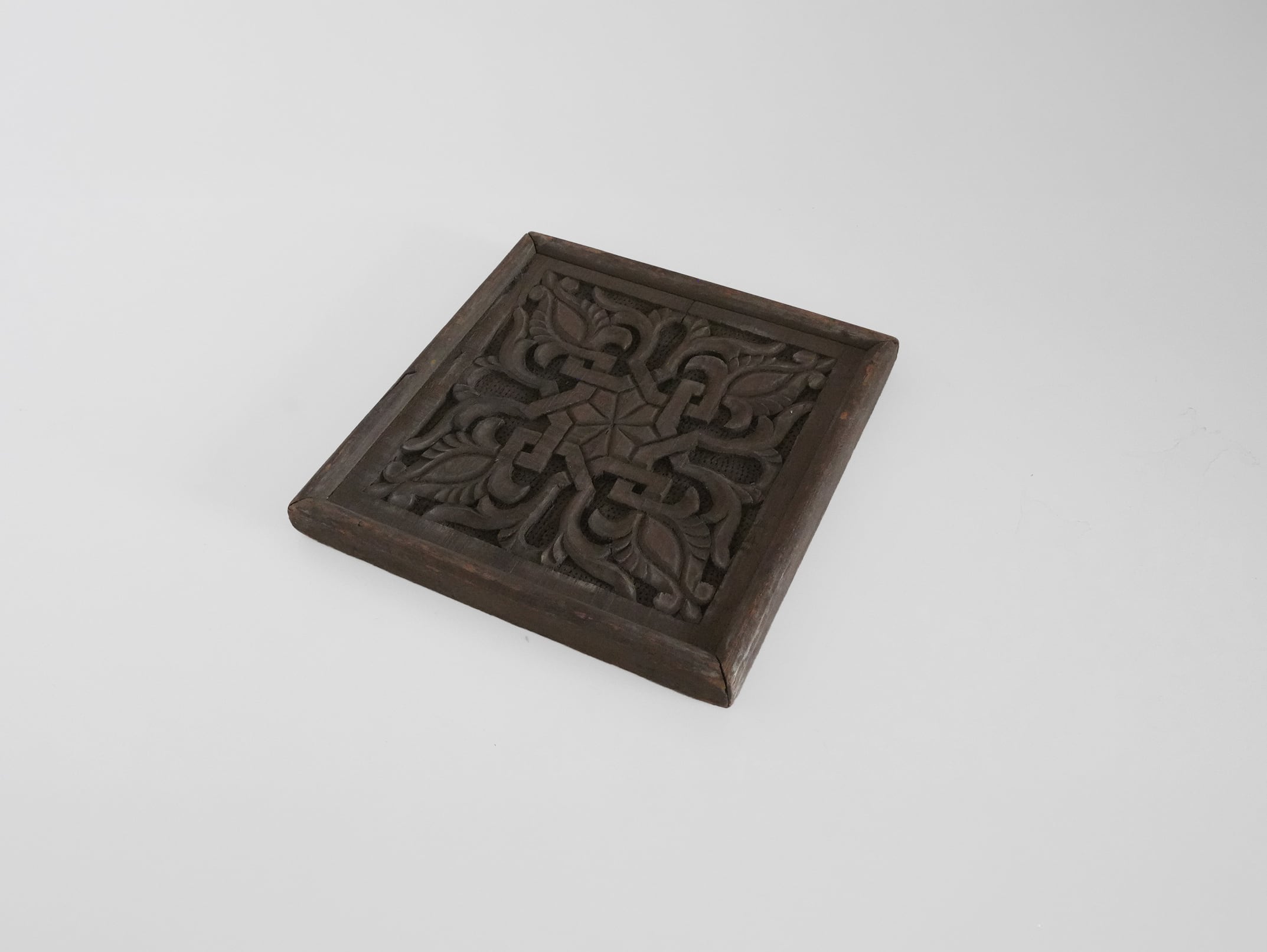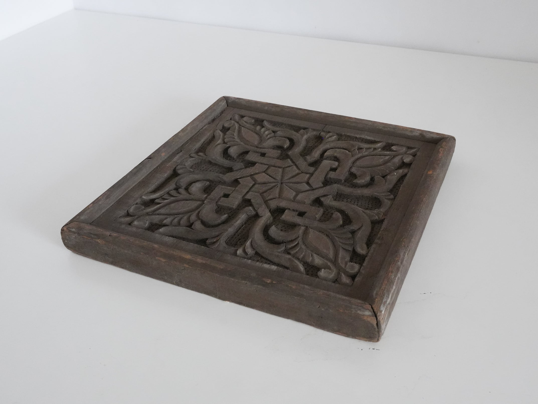 This hand-carved wooden panel was sourced in Morocco and crafted from dark, richly toned natural wood.