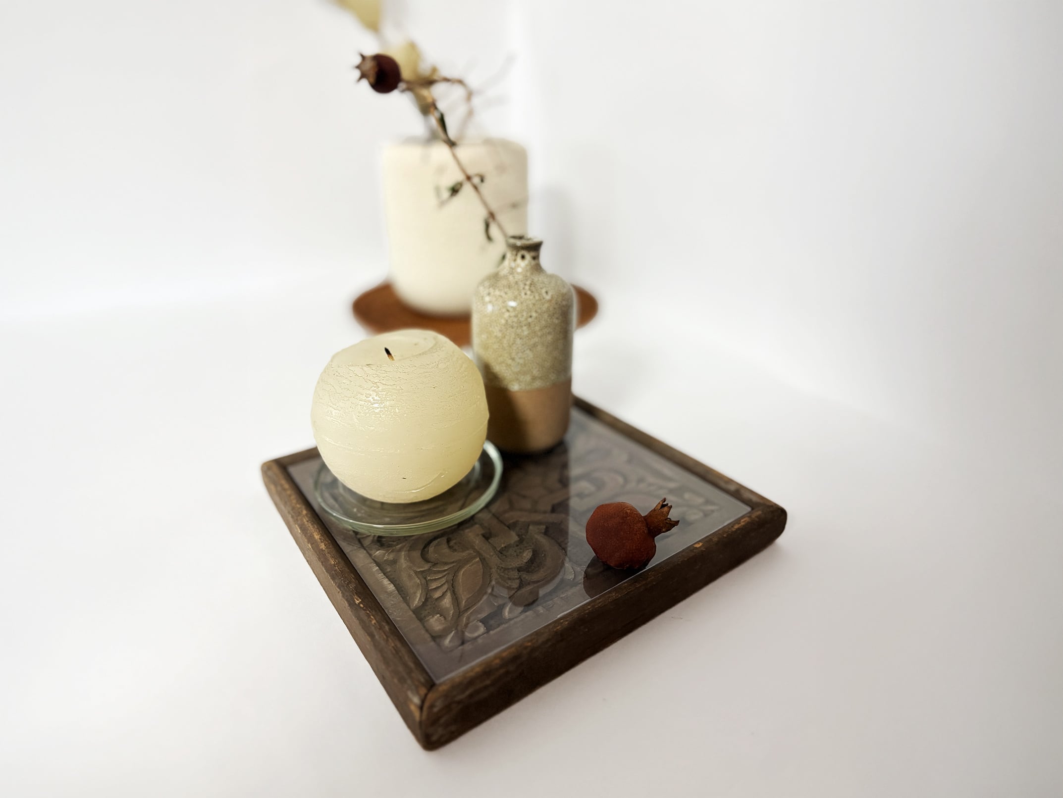 It can be enjoyed not only as a decorative wall panel but also as a small tray for displaying accessories, or as a coaster-like object used purely for aesthetic presence.