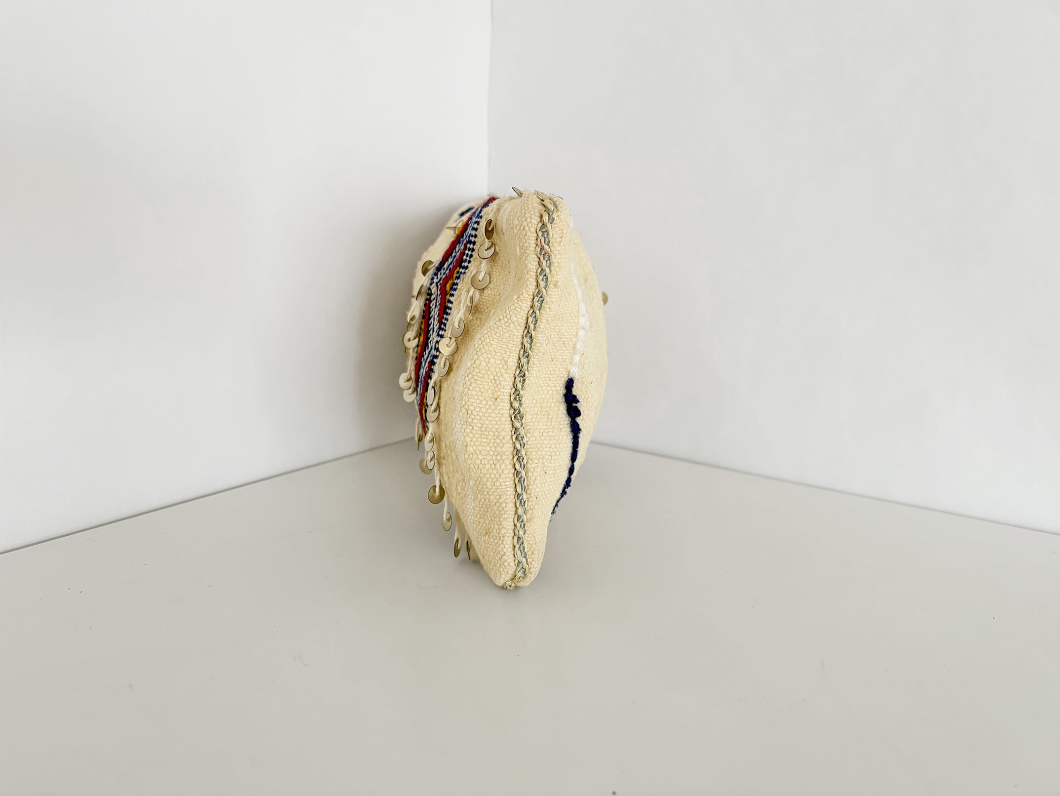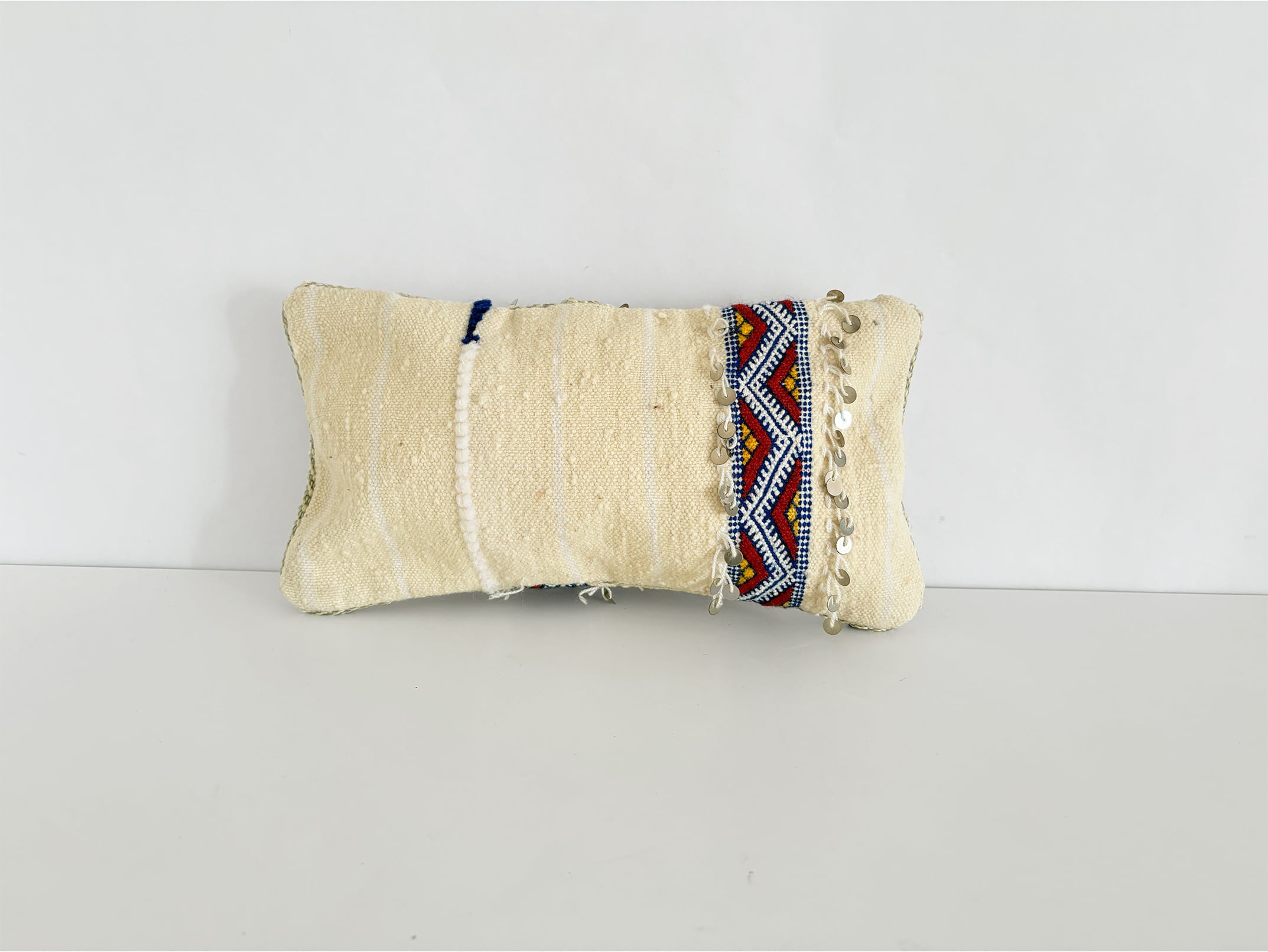 Fine stripes woven into the natural wool ground create a quiet rhythm, a feature often seen in Berber textiles where the artisan’s handwork forms the visual cadence of the cloth. At the center, a colorful decorative band combines red, blue, and yellow geometric motifs—designs traditionally associated with harmony, continuity, and the bonds within a household in Berber weaving culture. Metal sequins along the edges catch the light and add a celebratory touch reminiscent of festive Moroccan textiles.