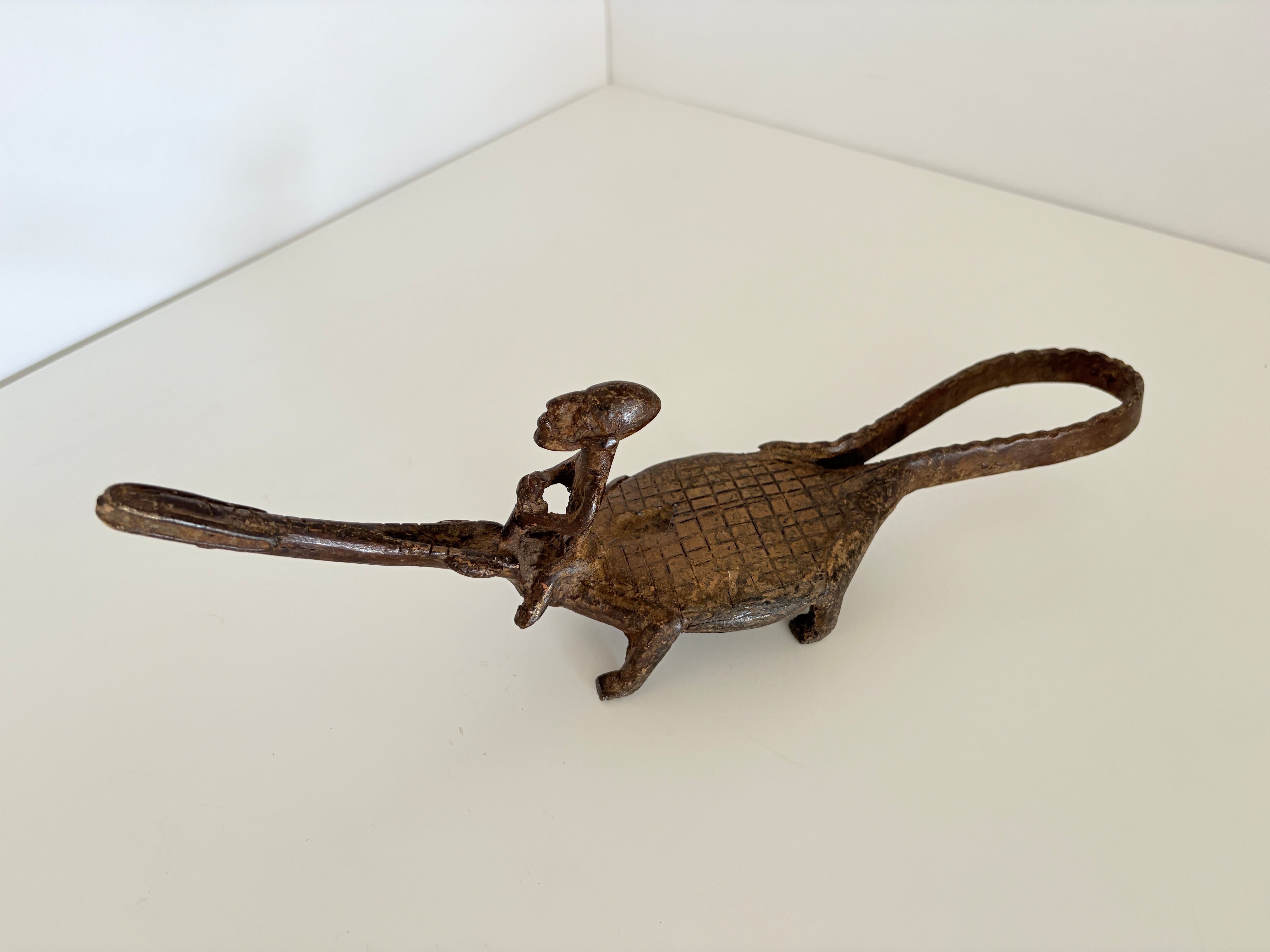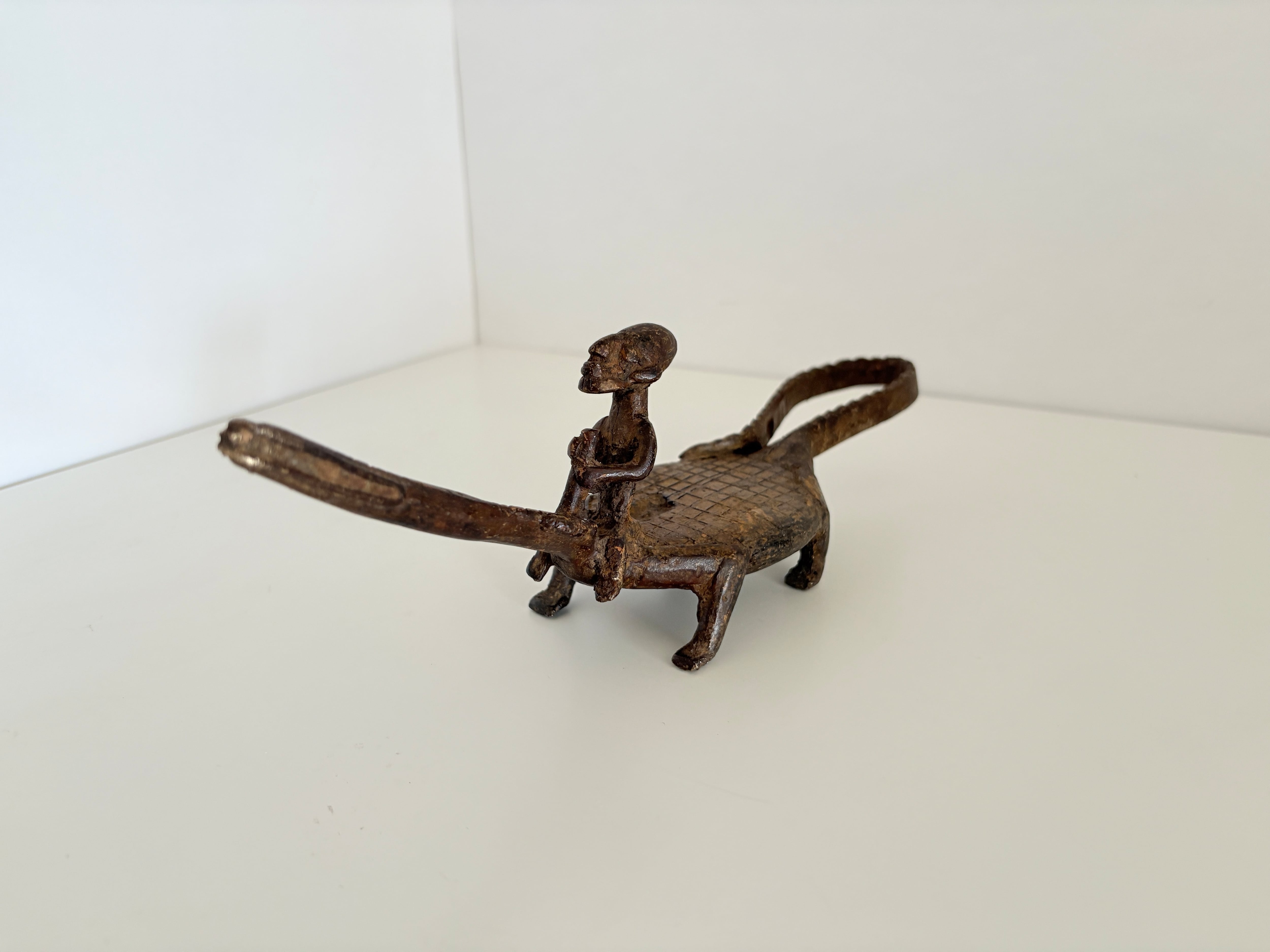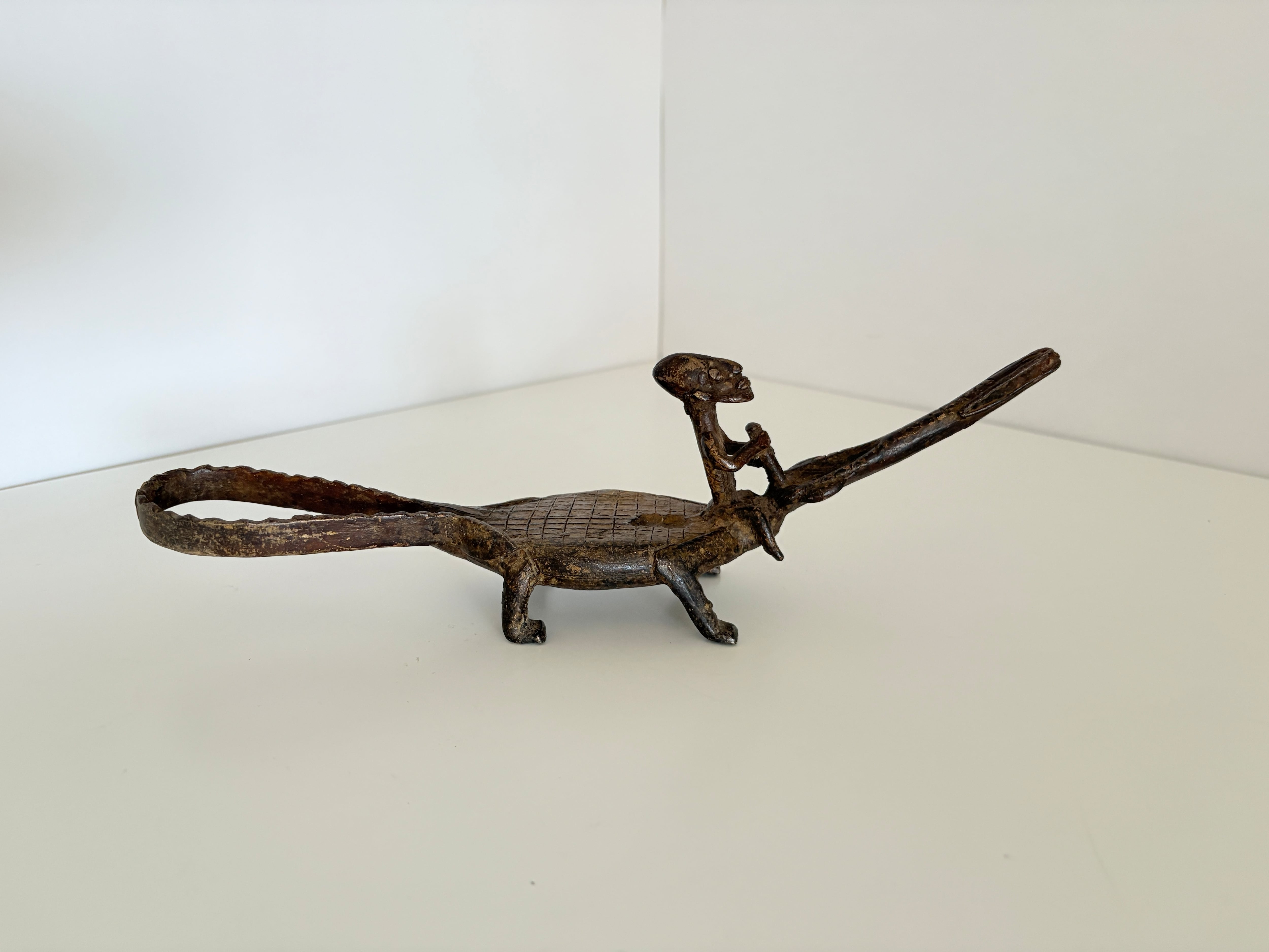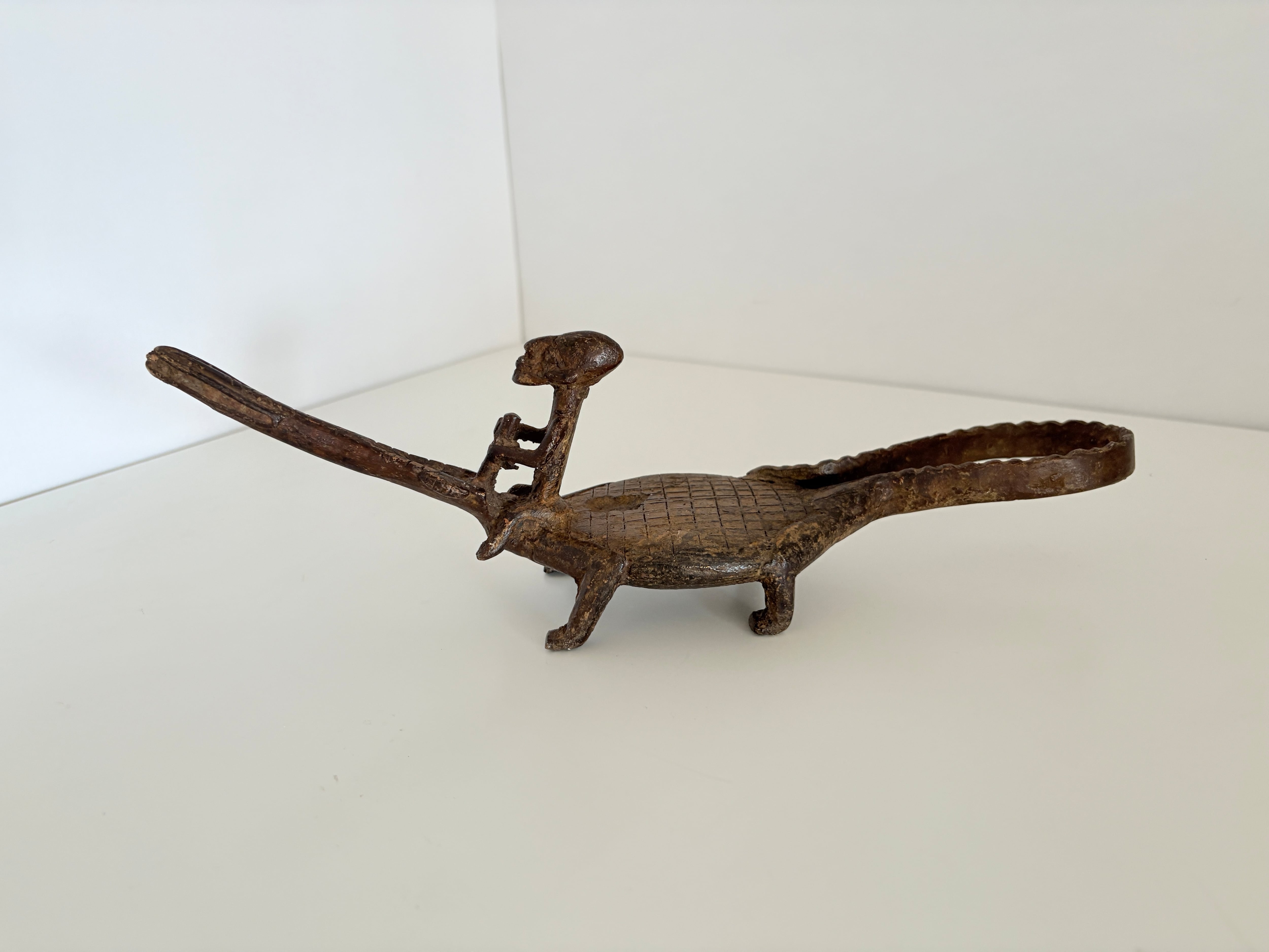 このワニと人物を組み合わせた作品も、そうした造形伝統を受け継ぐ一つのスタイルであり、アフリカ金属工芸特有の精神性と造形美が静かに宿っています。