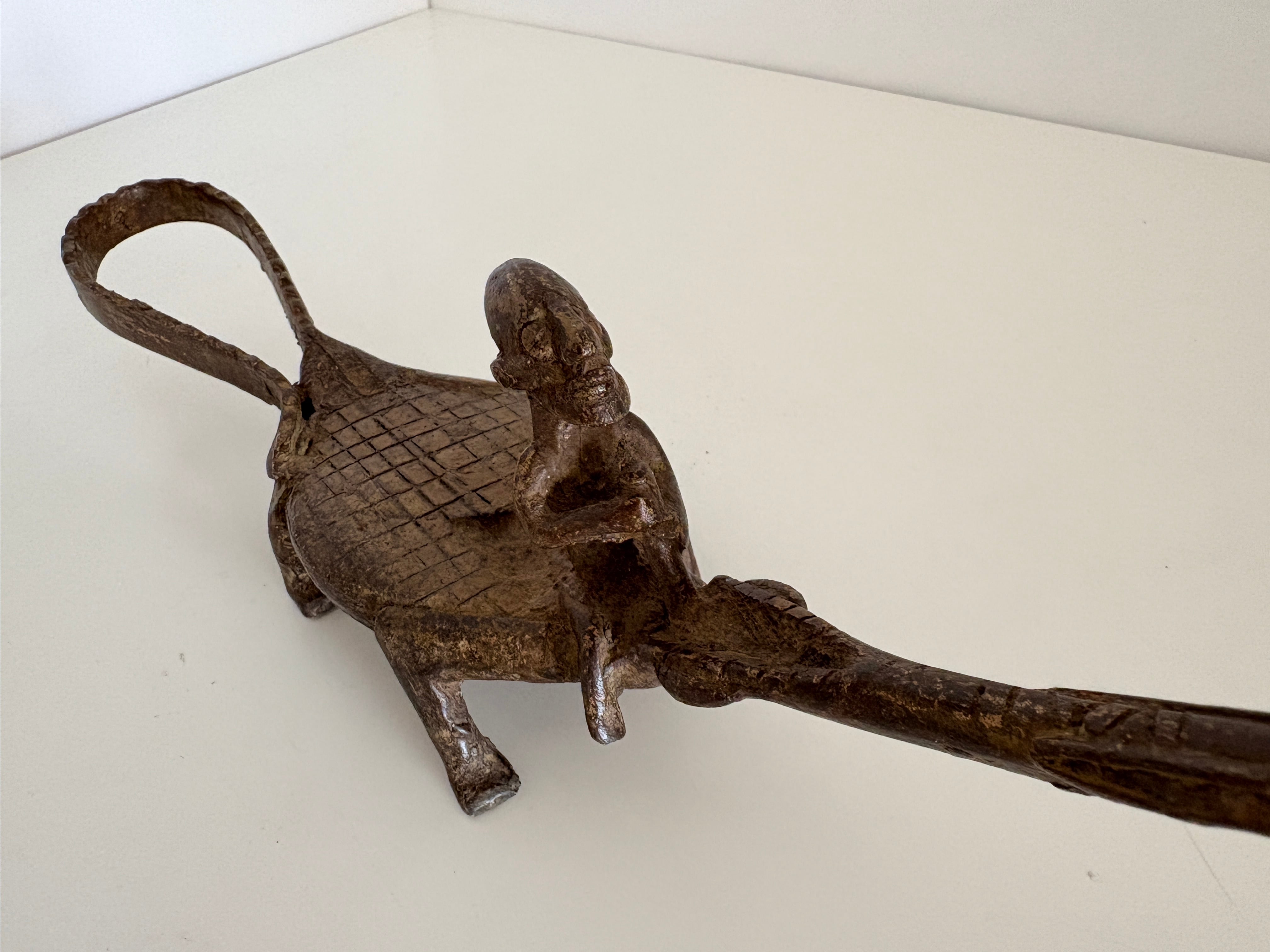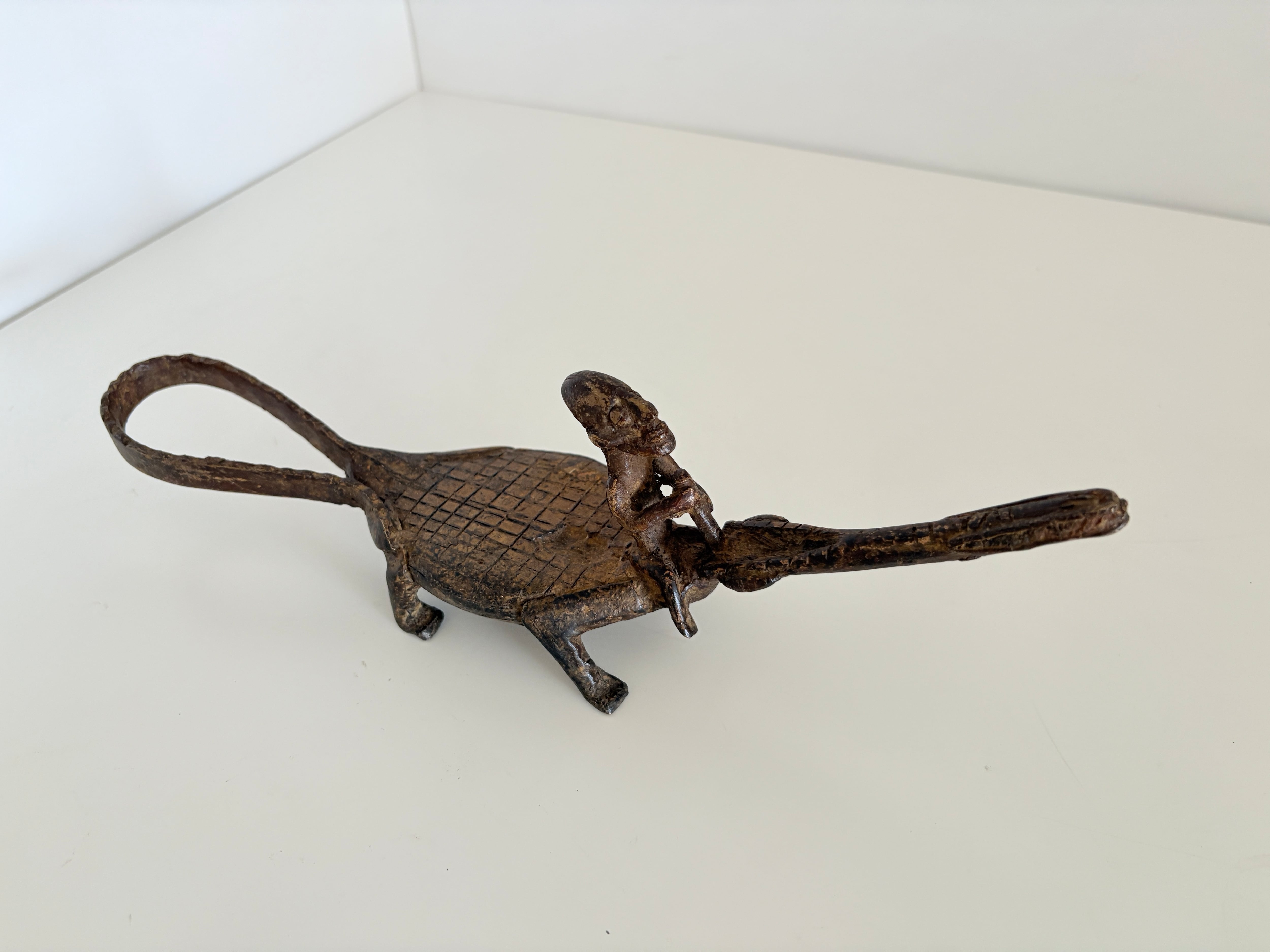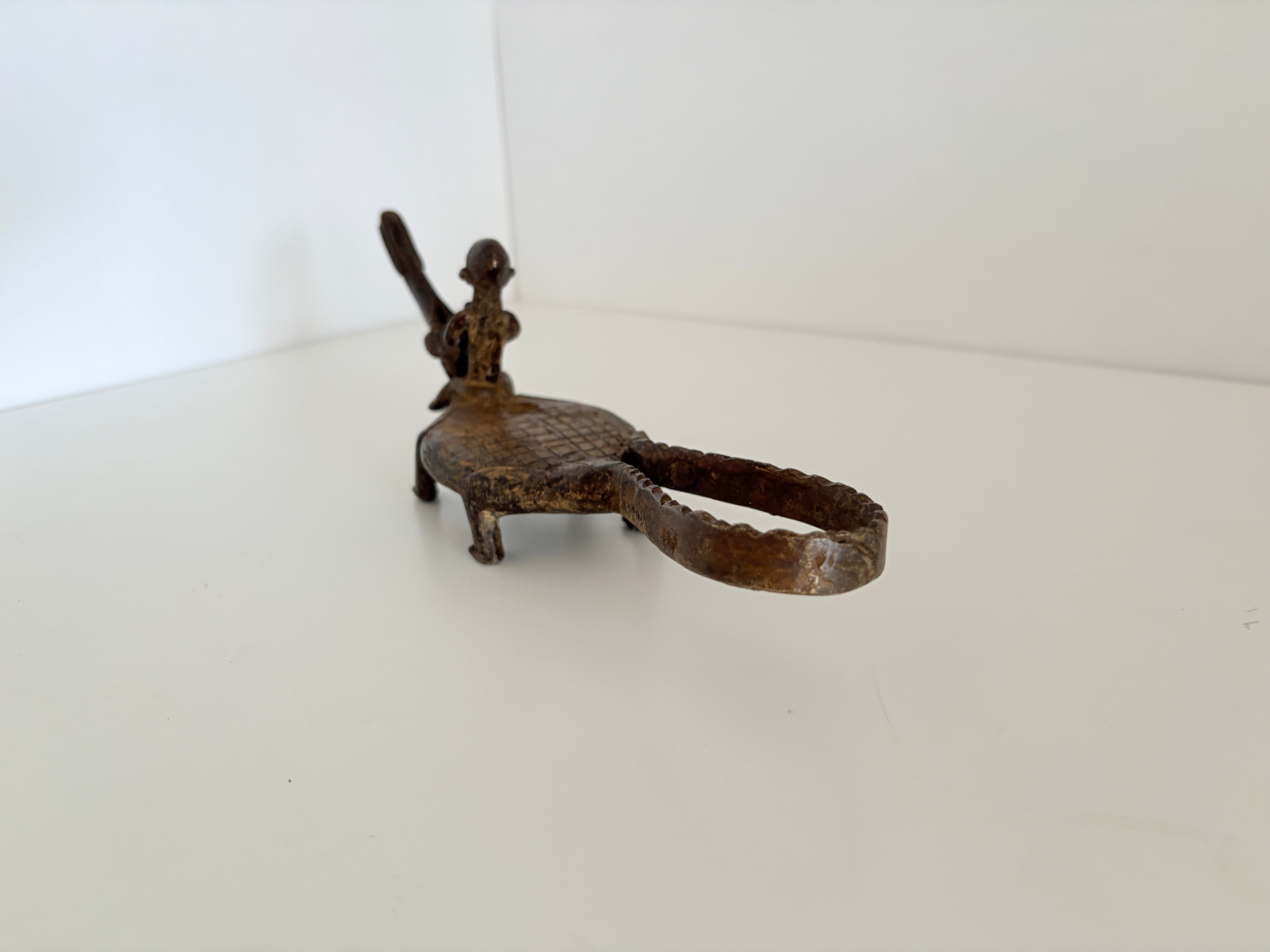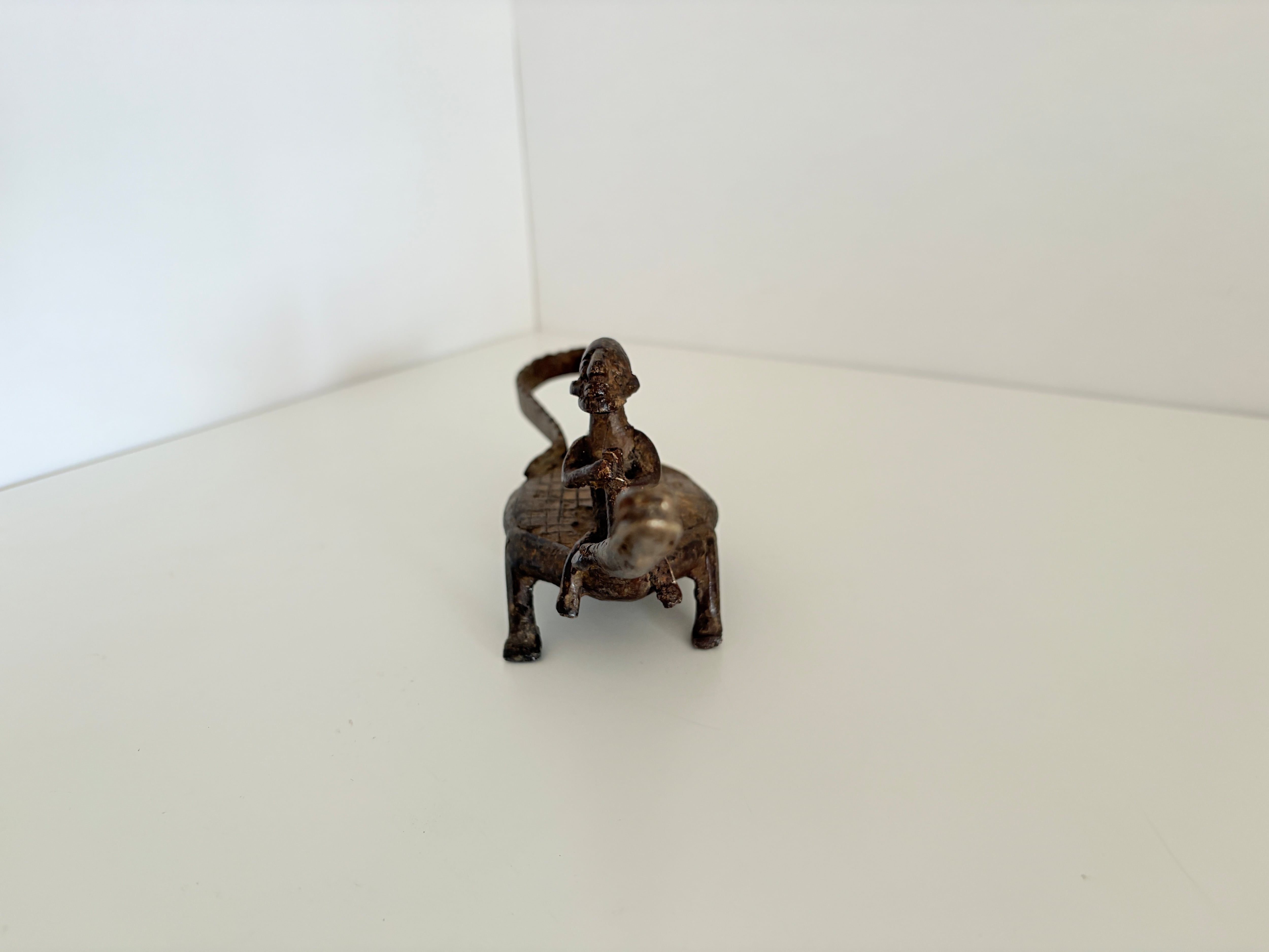 このワニと人物を組み合わせた作品も、そうした造形伝統を受け継ぐ一つのスタイルであり、アフリカ金属工芸特有の精神性と造形美が静かに宿っています。