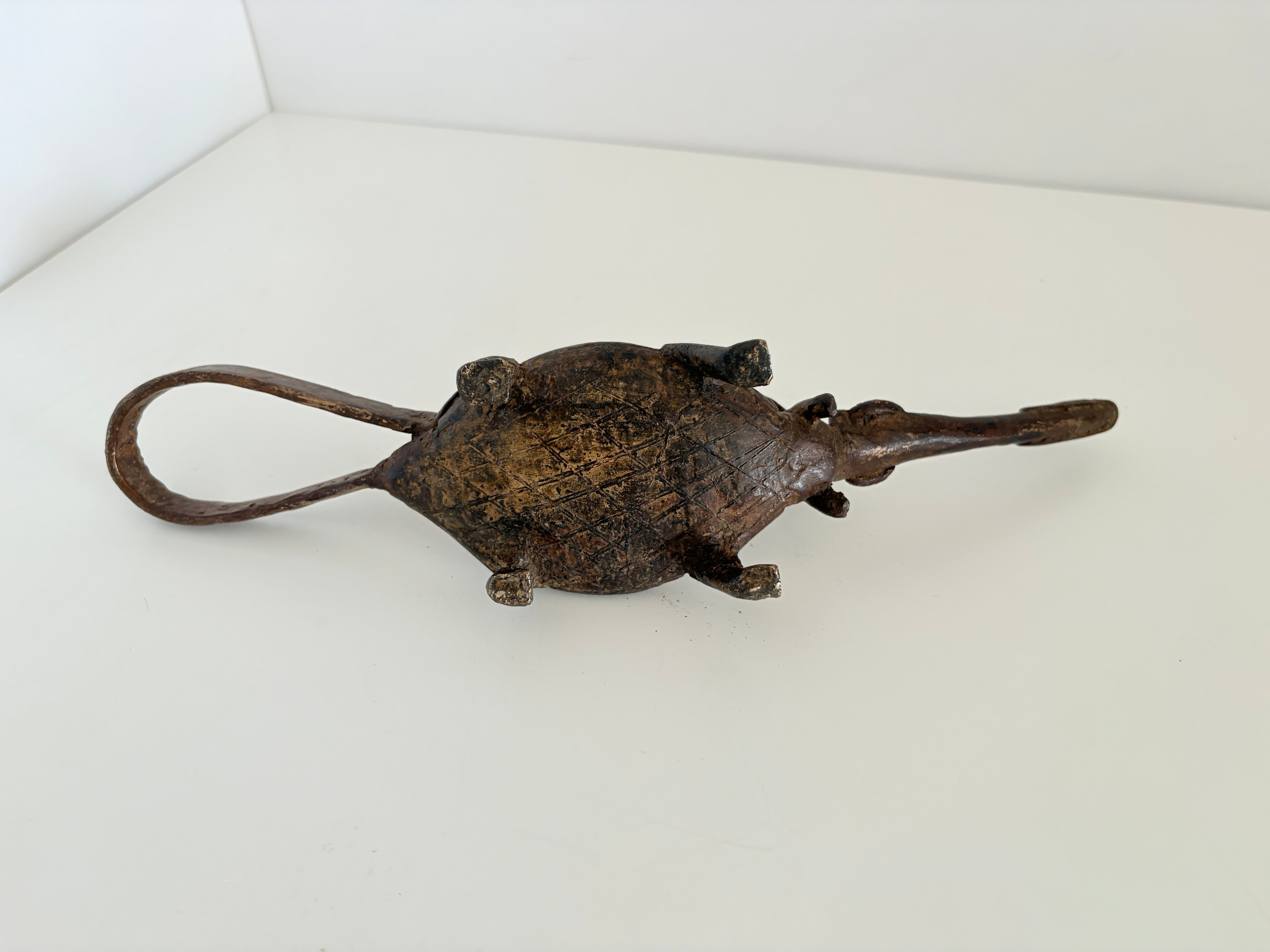 In Dogon art, the crocodile frequently appears as a symbol that links natural environments with daily life. It is considered an important creature associated with water sources and the cyclical flow of the land, and in some regions it is regarded as a protective animal for the community. These motifs reflect the Dogon value of living in balance with nature, a worldview often expressed through their metal and wood sculptures.