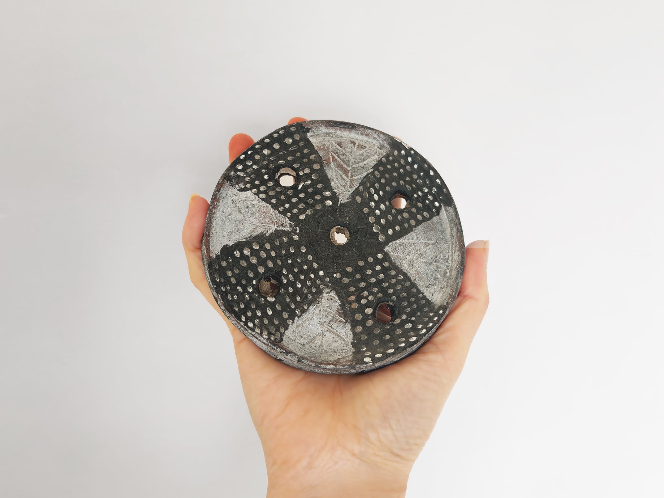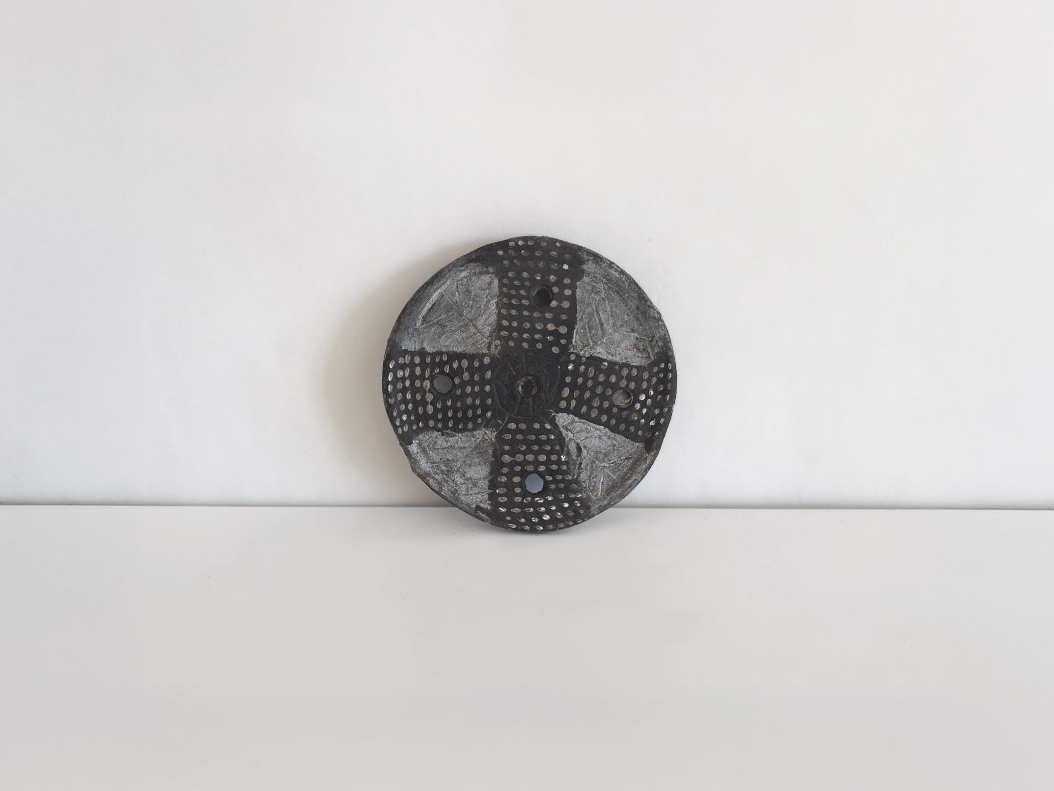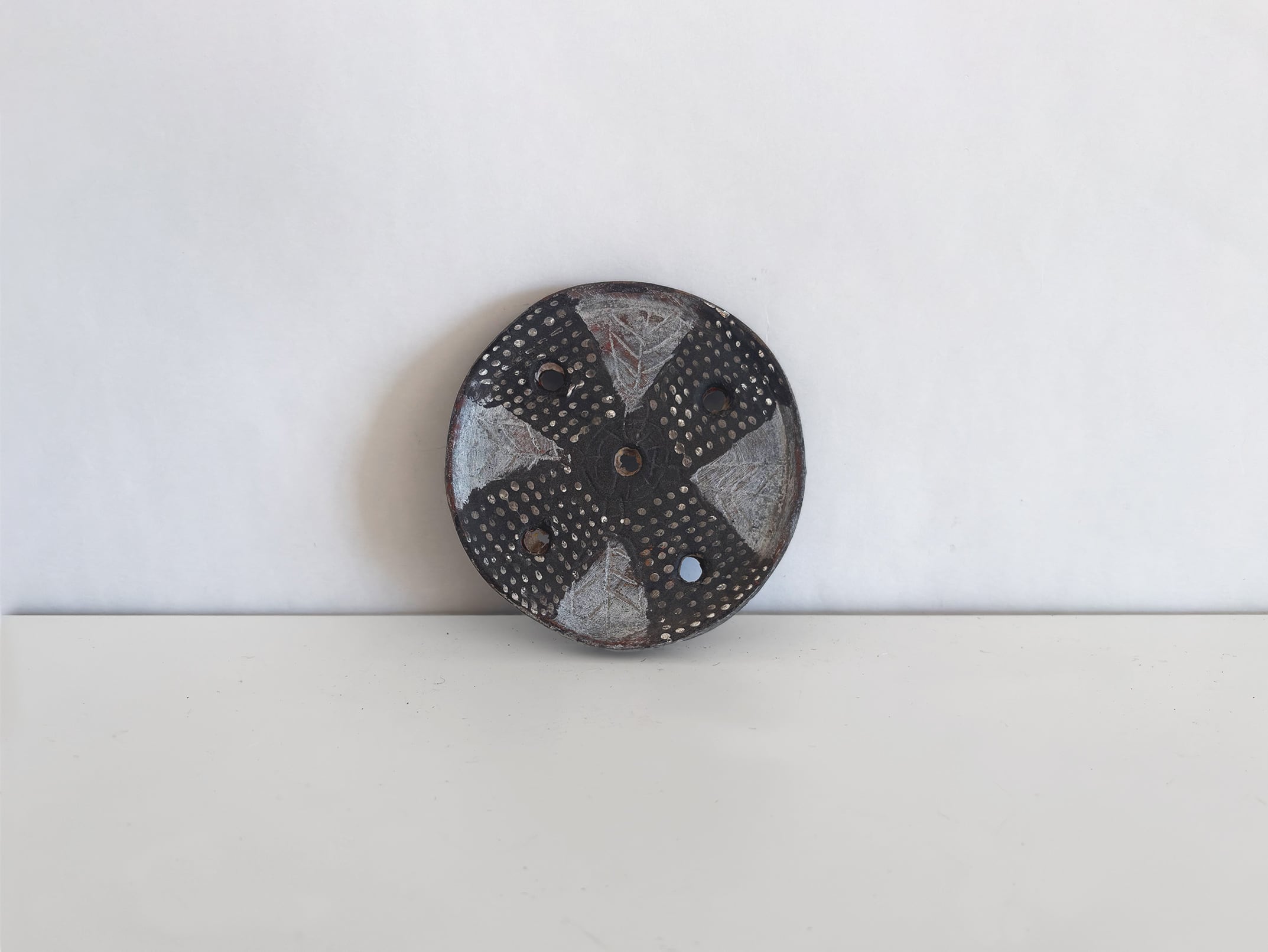 焼成された陶土の素地に、グレーがかった茶色と白の顔料で抽象的な文様が描かれており、円形という明確なフォルムと静かな存在感を併せ持っています。