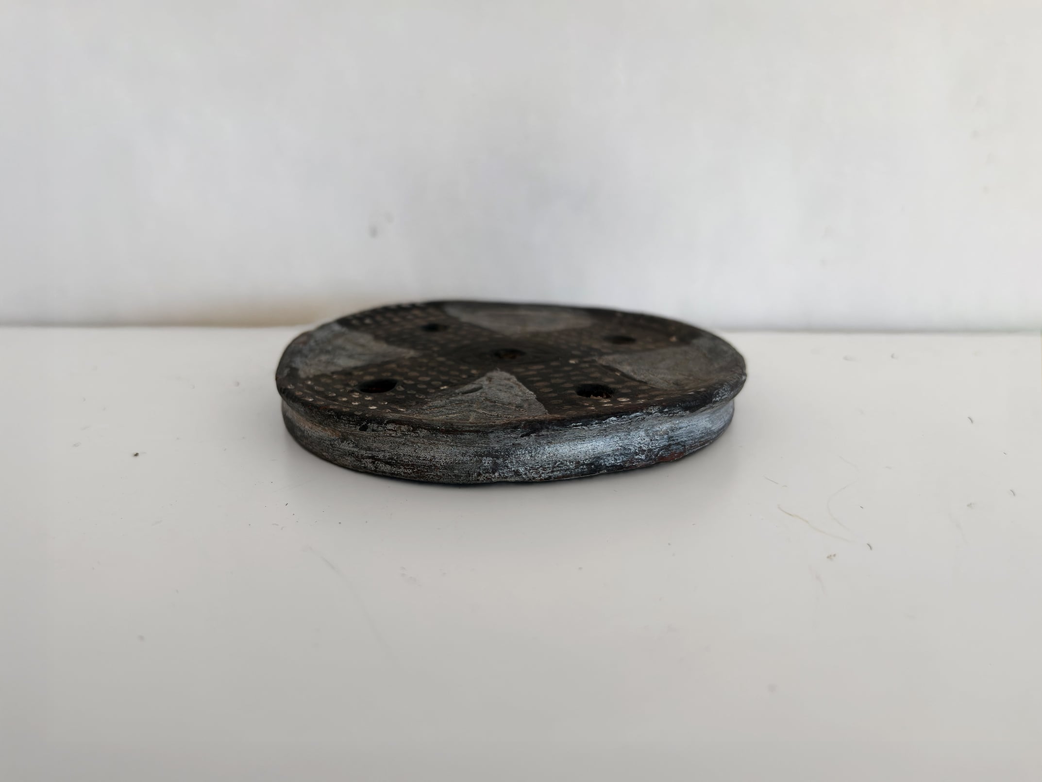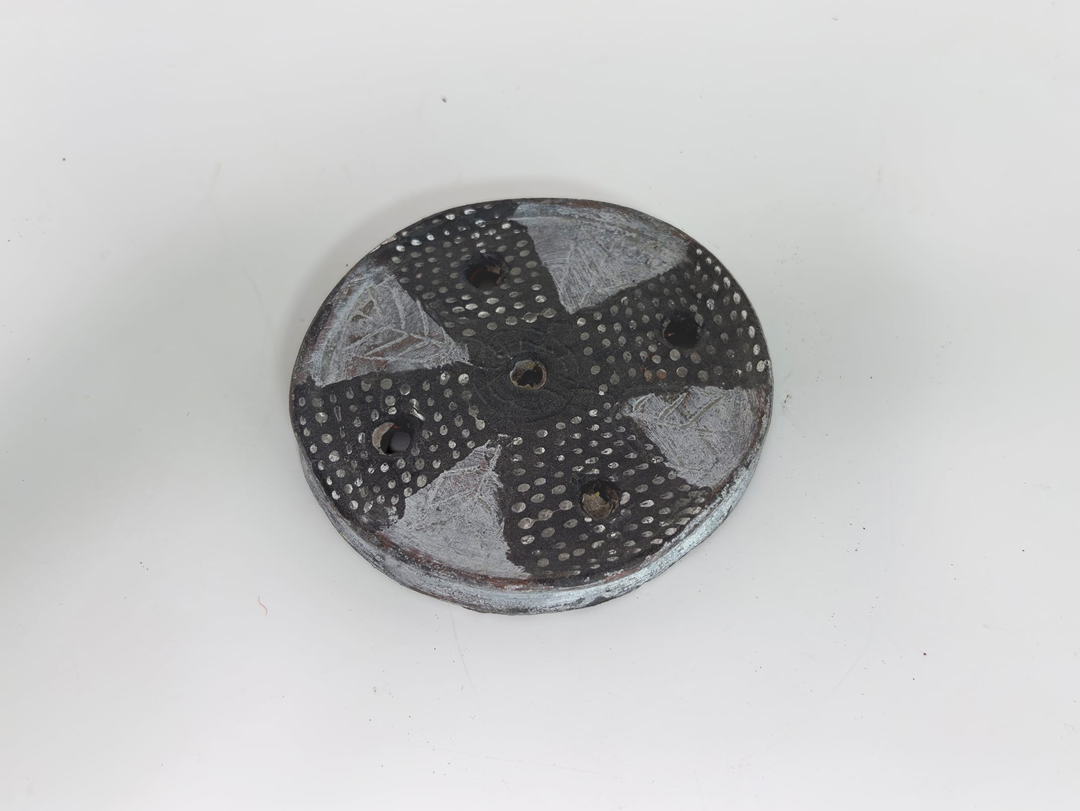 This lip plate was made by the Mursi people who live around the Omo Valley in southwestern Ethiopia. Formed by hand from fired clay, it features abstract patterns painted in soft gray-brown and off-white pigments. The clear circular shape and muted surface give it a quiet but strong presence. Depending on the light, especially in dimmer rooms, the colors subtly change in appearance. Each piece is entirely handmade, and the slight variations in dots and tones reflect the maker’s natural hand movements.