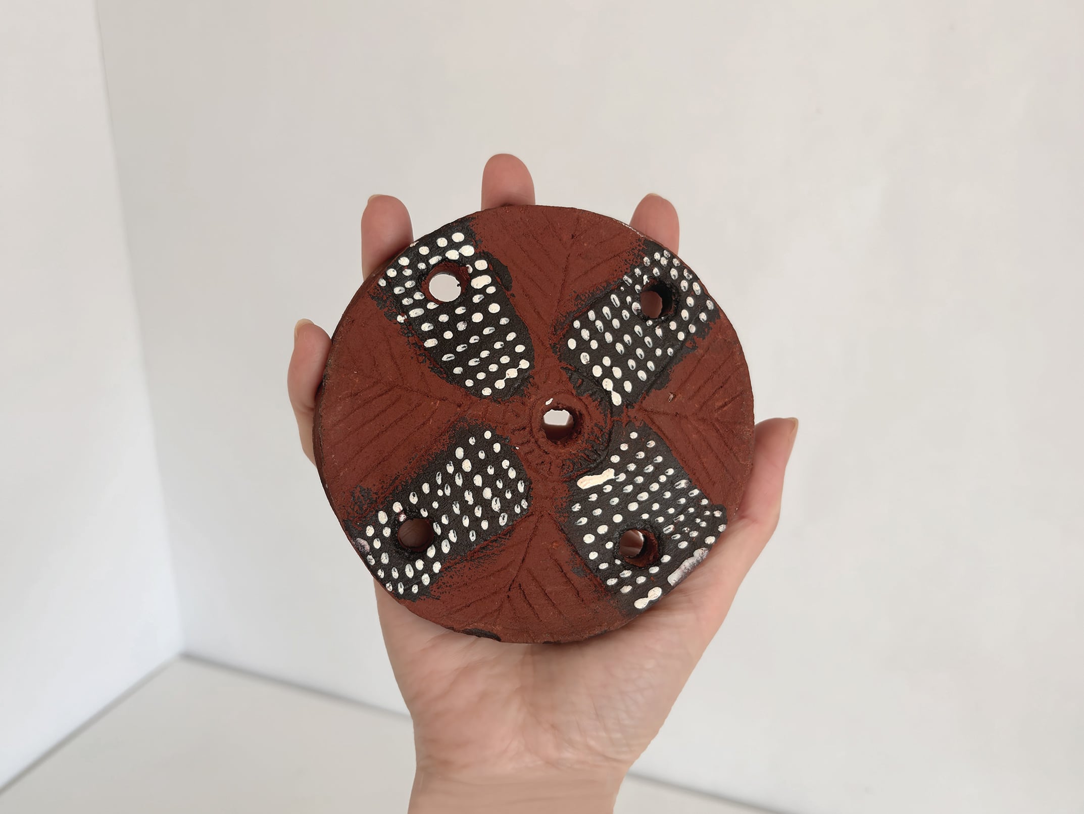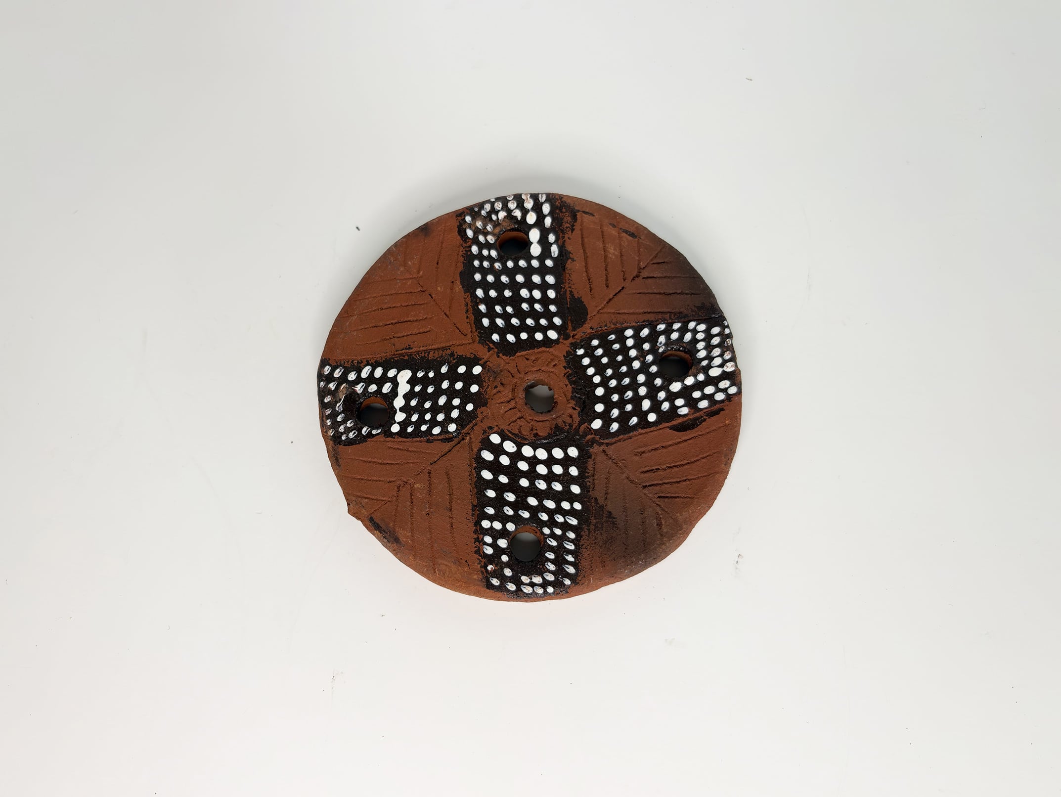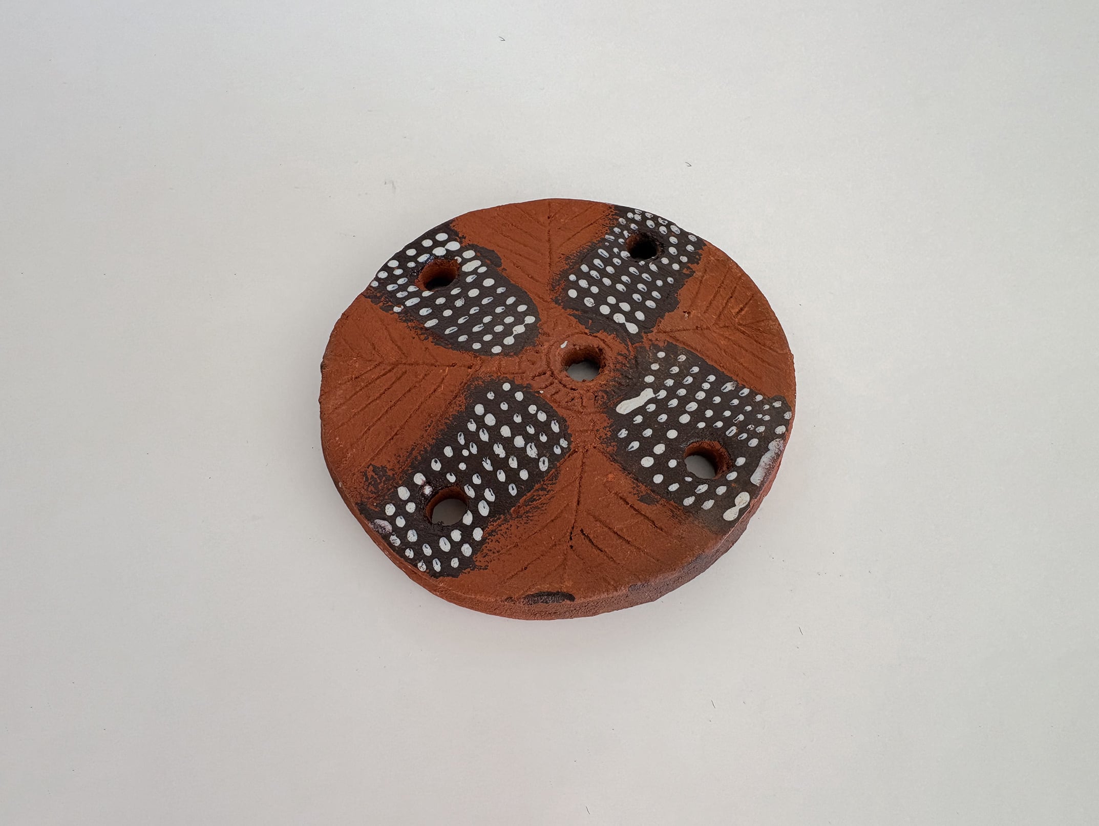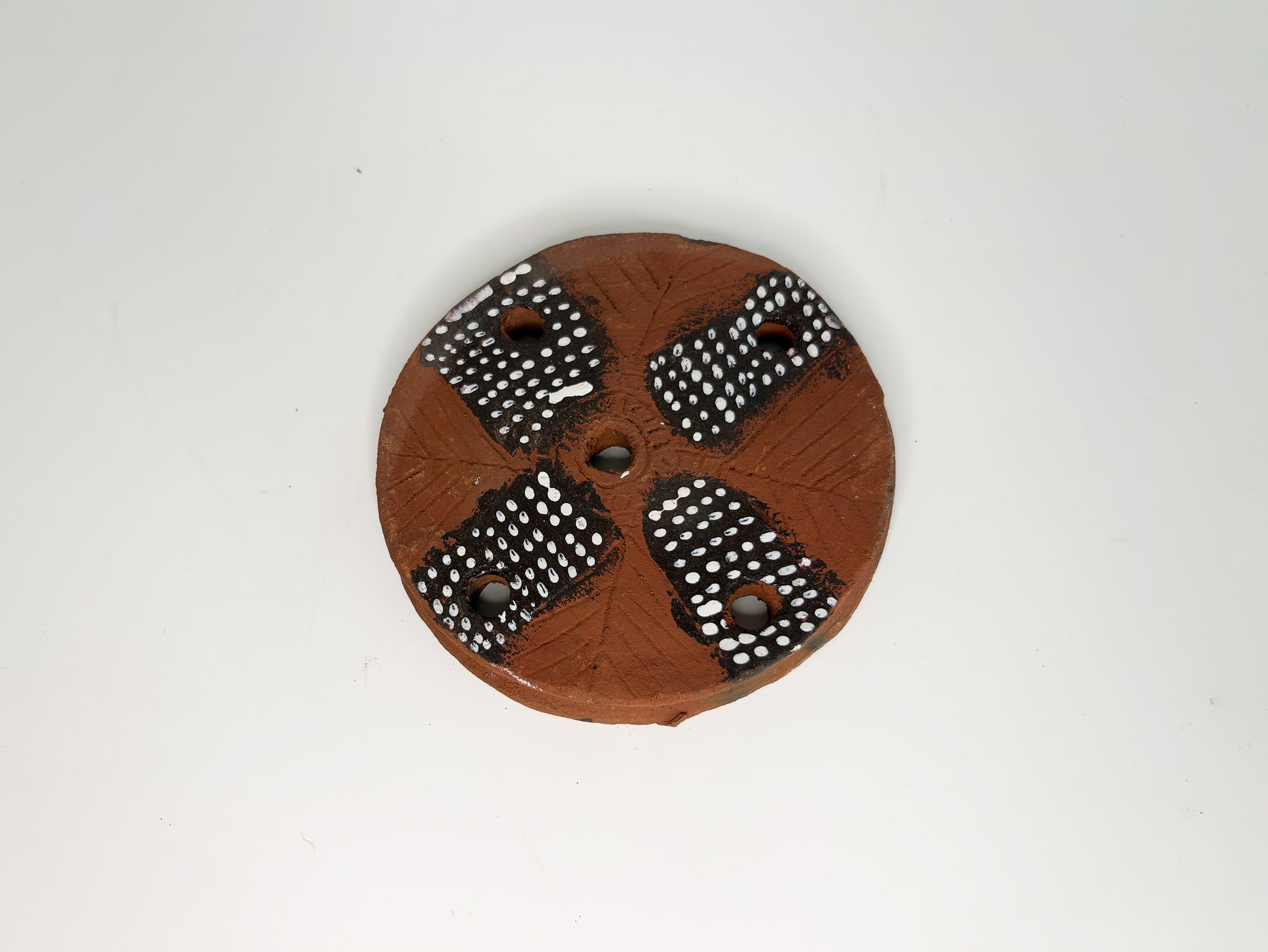 形は明確な円形で、中央に一つ、周囲に複数の穴が設けられています。