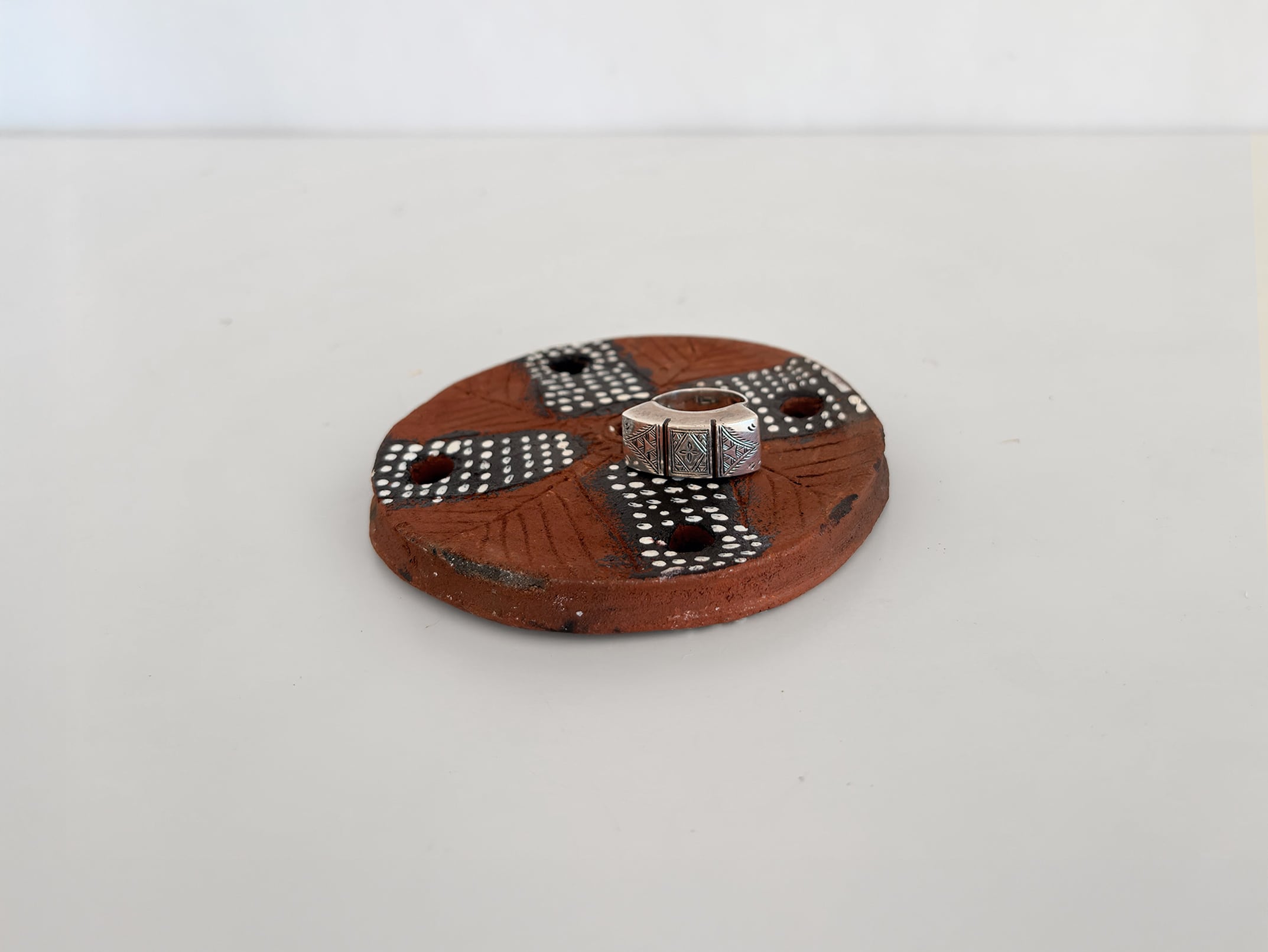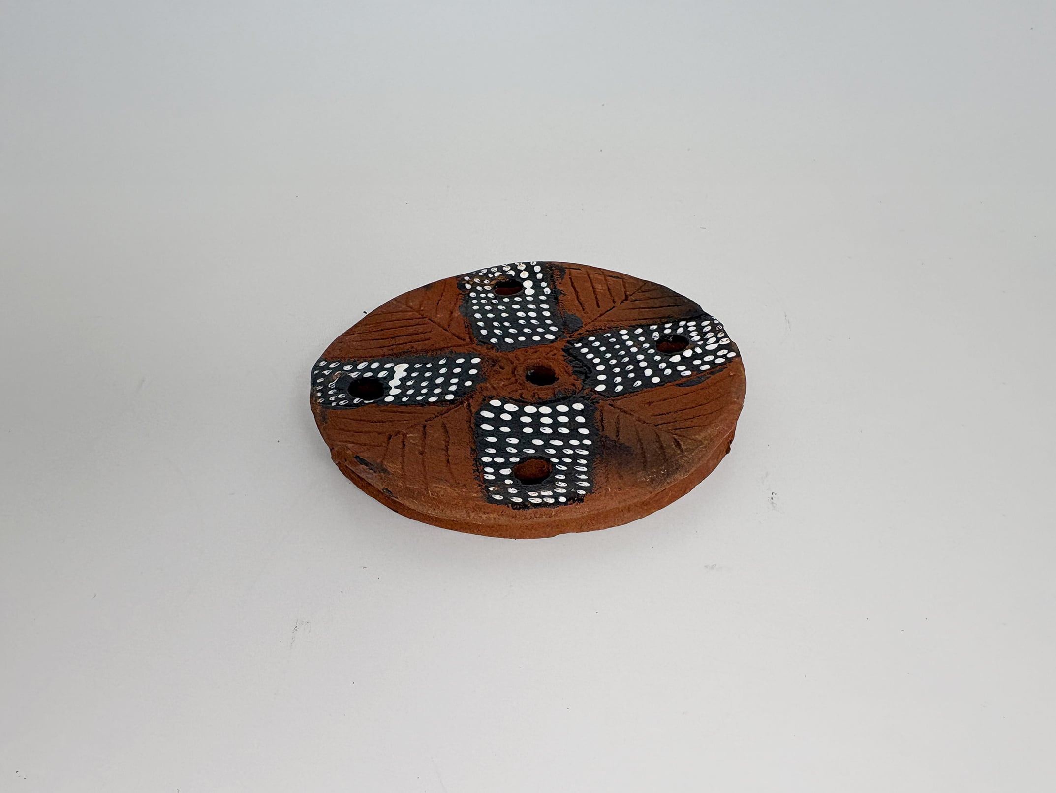 Each piece is entirely hand-shaped and one of a kind. Variations in the placement of the dotted patterns, the wavering of lines, and the depth of color retain the direct trace of the maker’s hands. Mursi lip plates are still produced today using natural materials and traditional handcraft methods, and this piece was created within that continuing tradition. Rather than striving for uniformity or technical perfection, it reflects an aesthetic that embraces irregularity and imperfection.