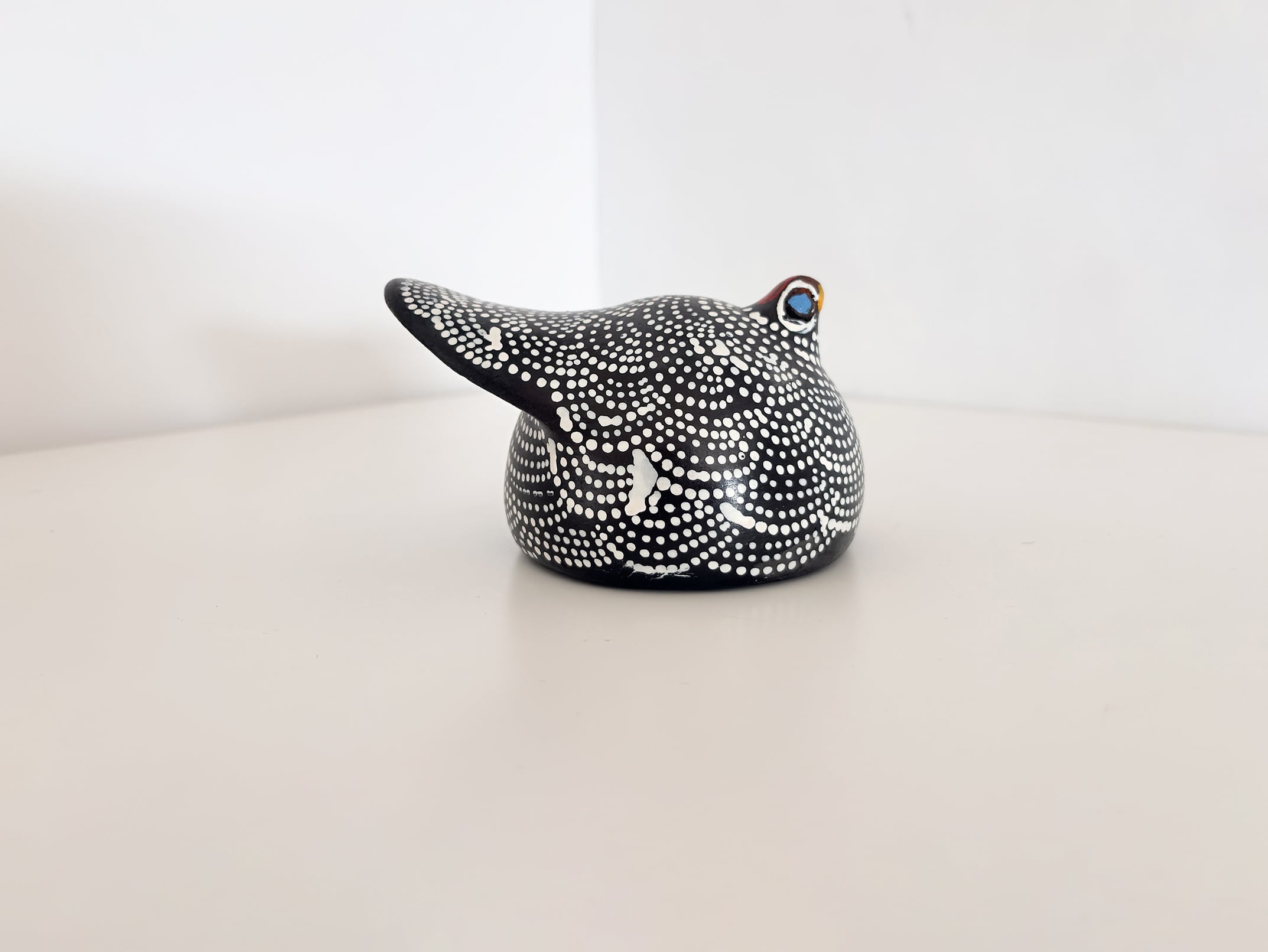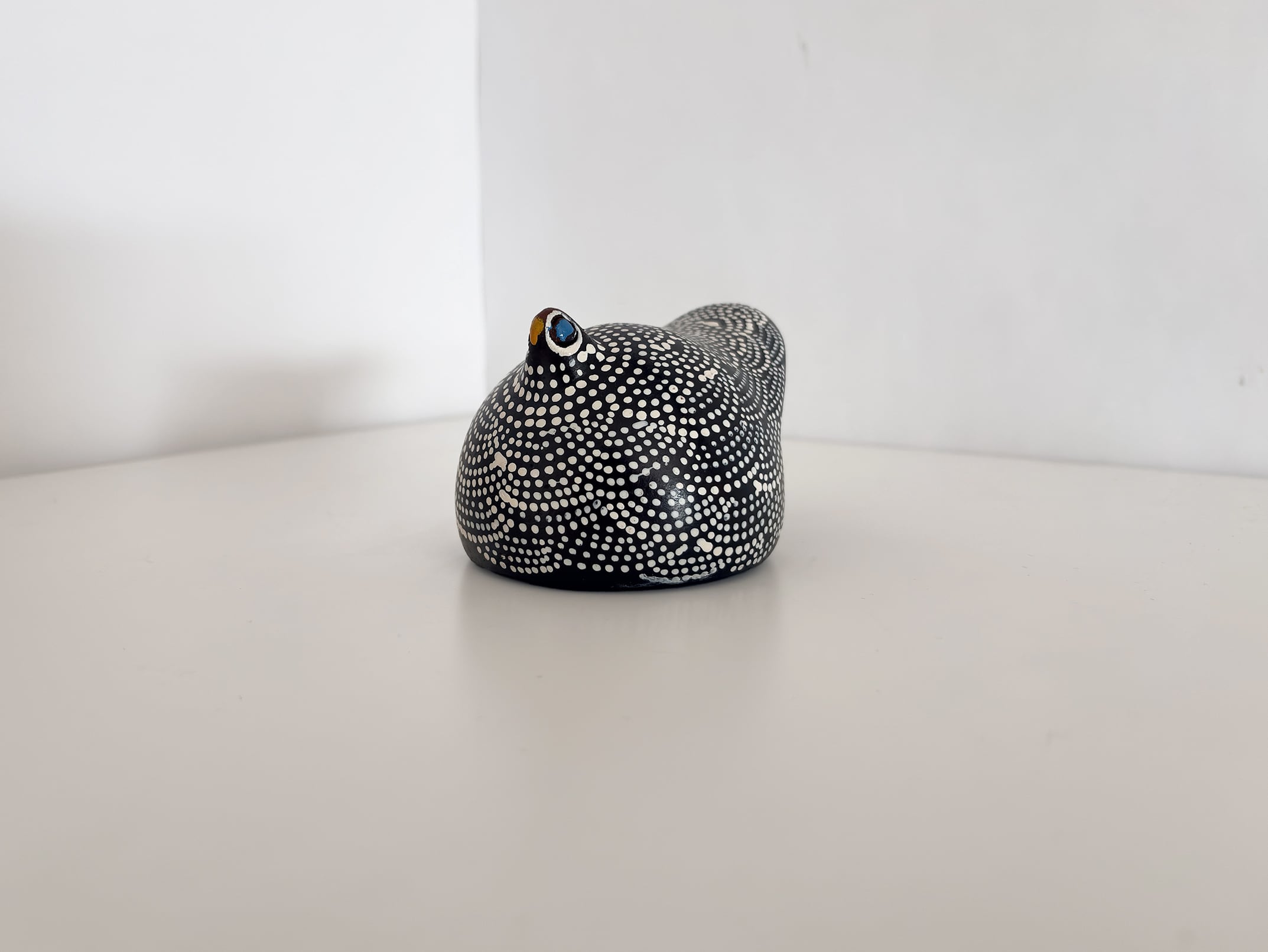 丸みを帯びたコンパクトなフォルムに、全身を覆う白い点描模様が印象的な一点。黒地に白の細かなドットが規則的に施され、静けさの中にリズムを感じさせる造形に仕上がっています。