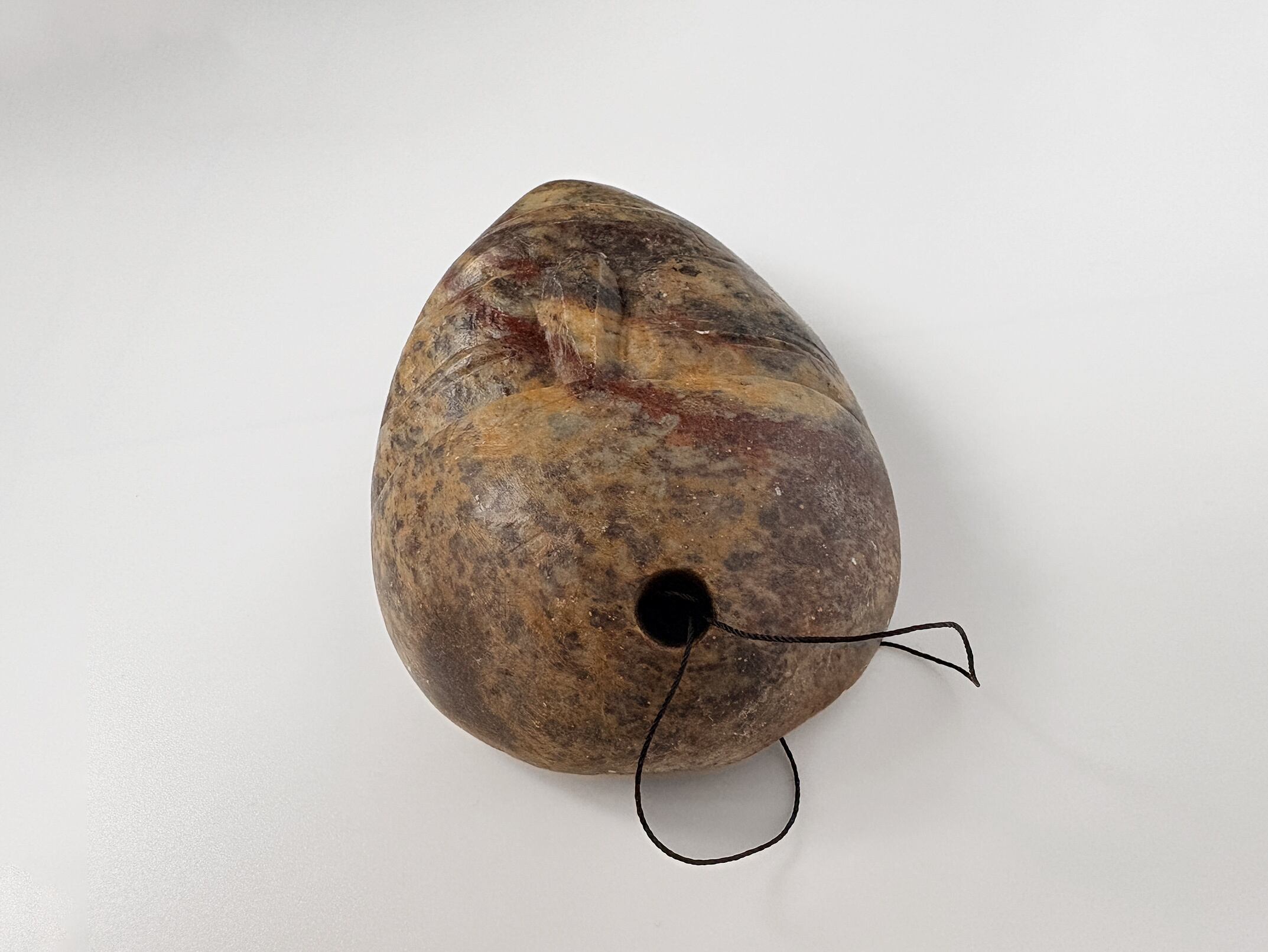一般に白〜淡灰色の個体も流通していますが、本作は黄褐色や赤み、黒点が混在するまだらの石肌が特徴です。