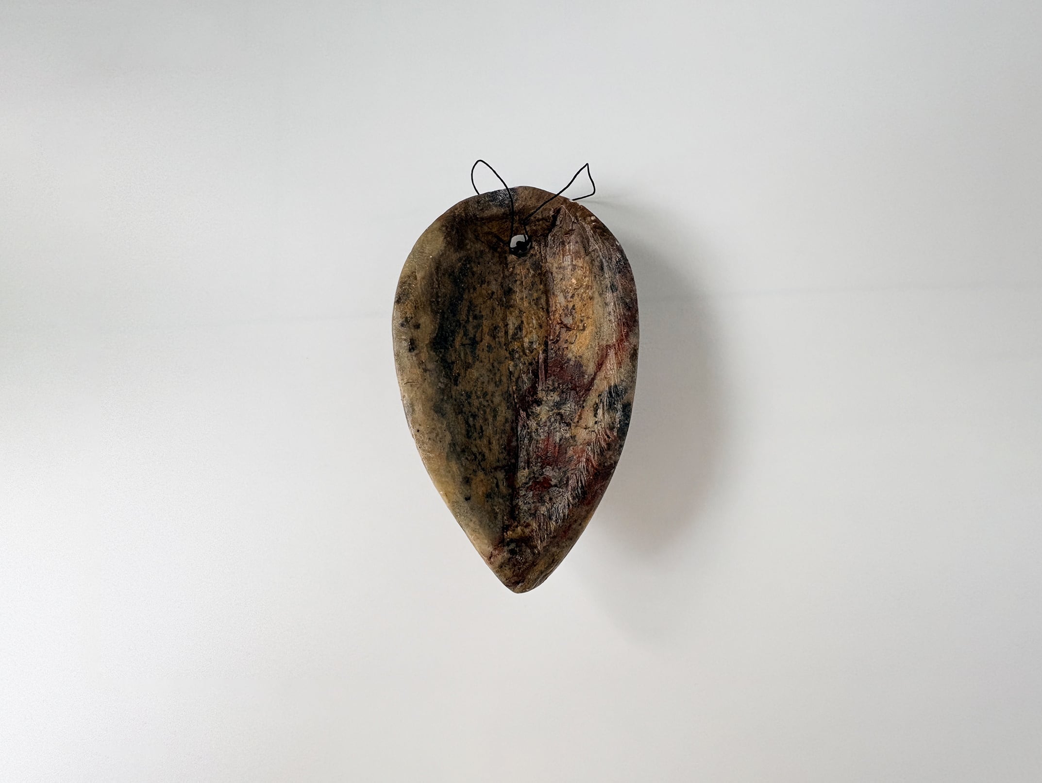 上部に開けられた穴に紐を通しており、壁掛けオブジェとして空間に浮かせることができます。