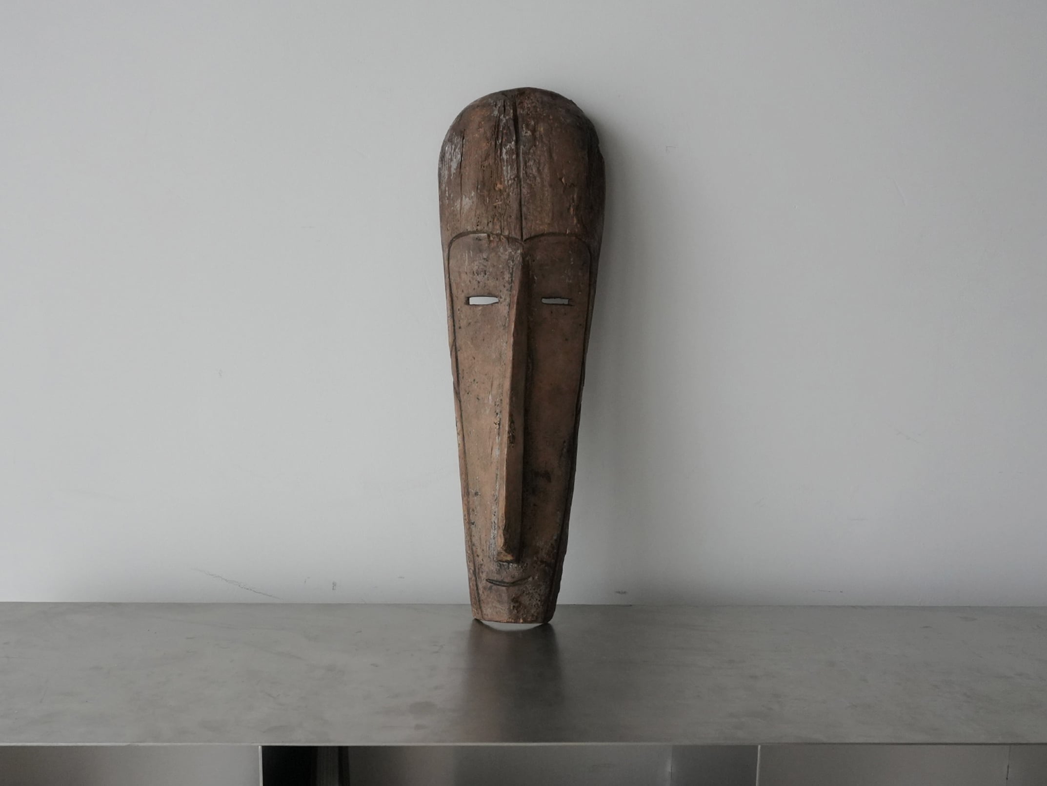 The carving traditions of the Fang people, who live in and around present-day Gabon, are among the most refined sculptural traditions in African art. This mask appears to have been carved from a single piece of wood, forming a tall and elongated silhouette with narrow horizontal eyes, a long straight nose and a subtly defined mouth. The design is extremely minimal, composed of simple lines and smooth planes that create shifting shadows depending on the light. This restrained approach gives the mask a calm yet powerful presence.