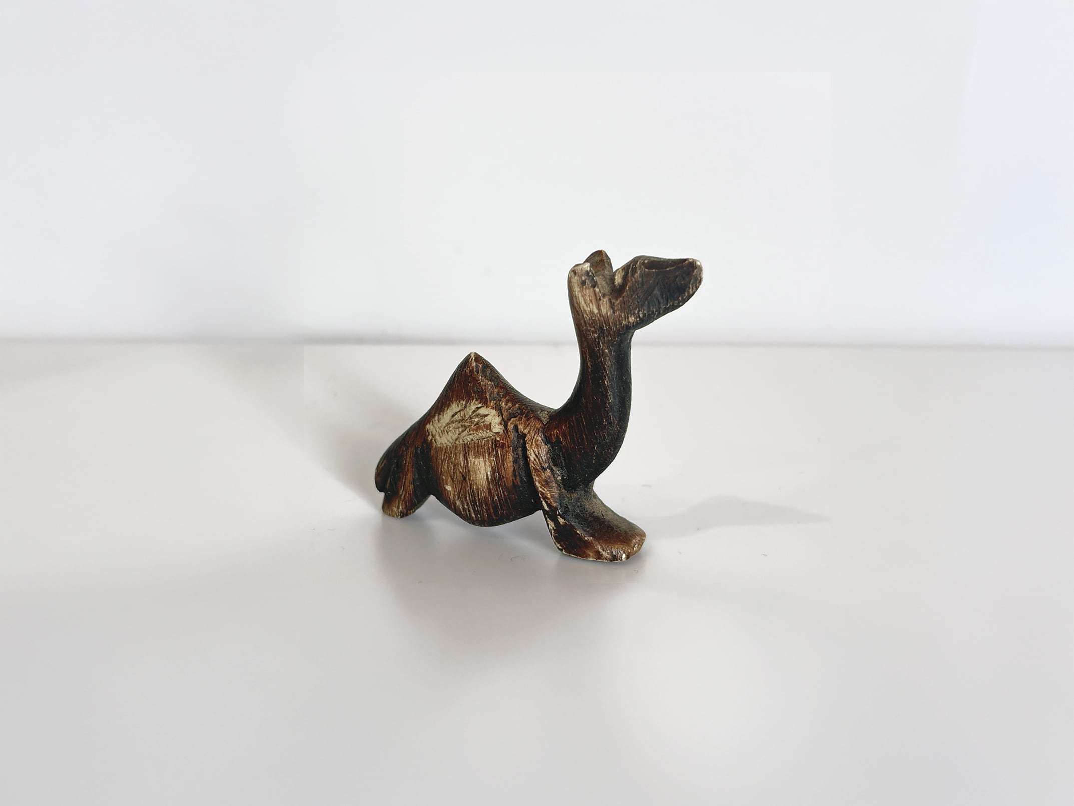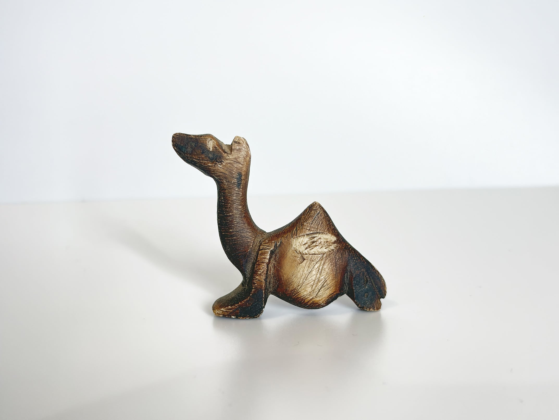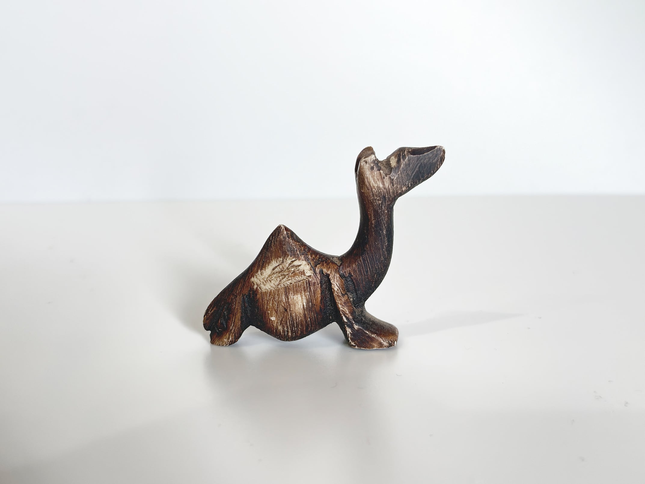この作品では、ラクダの特徴である長い首と背のコブが簡潔なフォルムで表現され、装飾を抑えたミニマルな造形が際立ちます。シンプルな形状でありながら、石の質感と彫刻のラインによって彫刻作品としての存在感が生まれています。