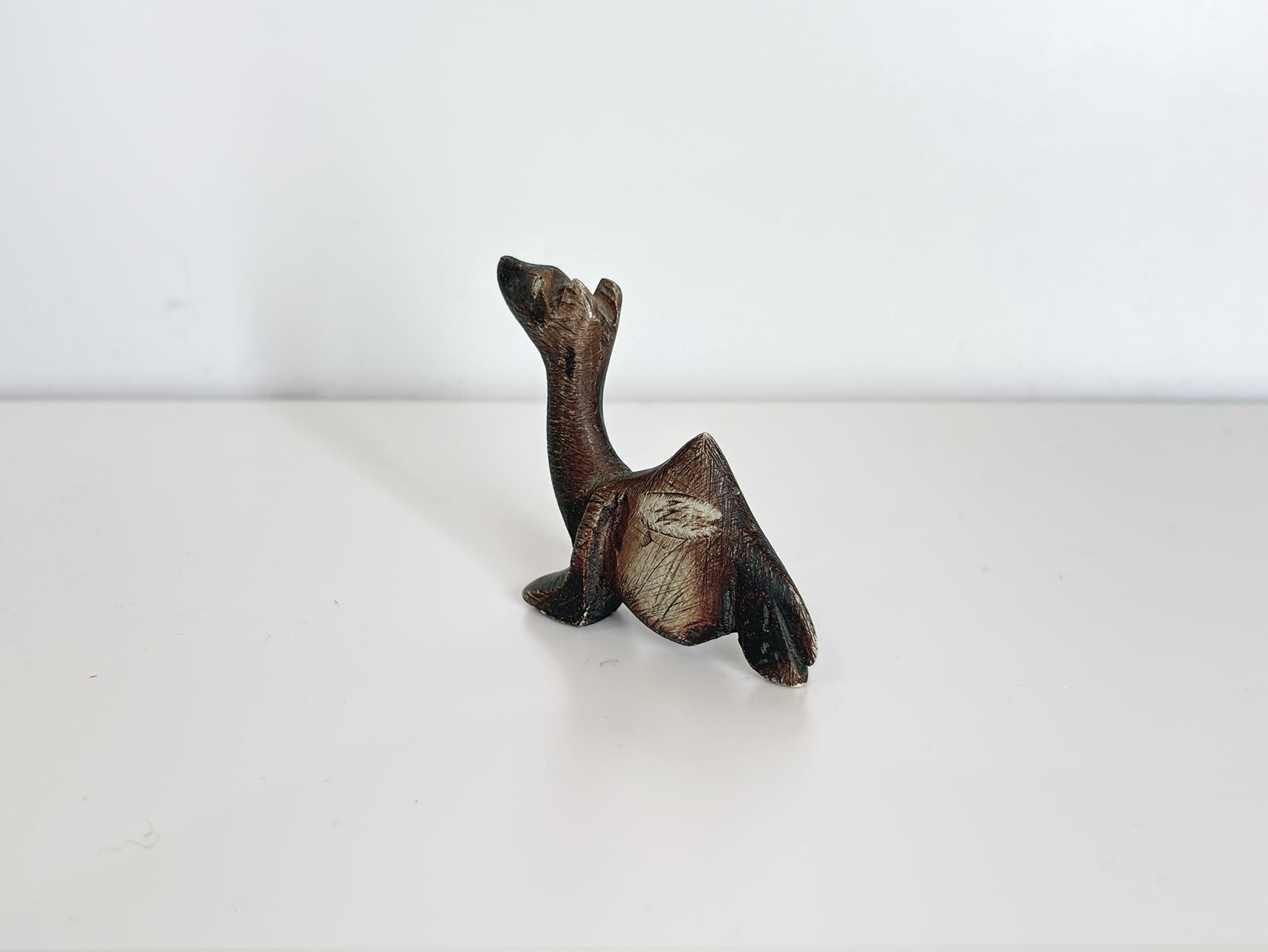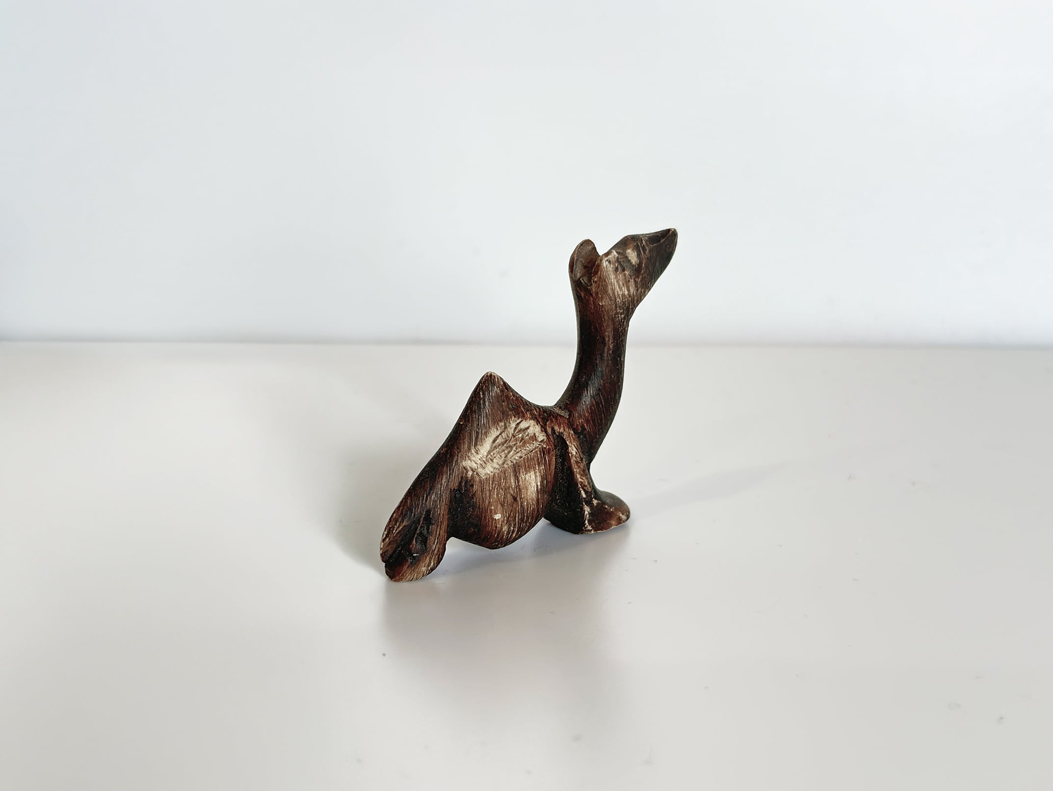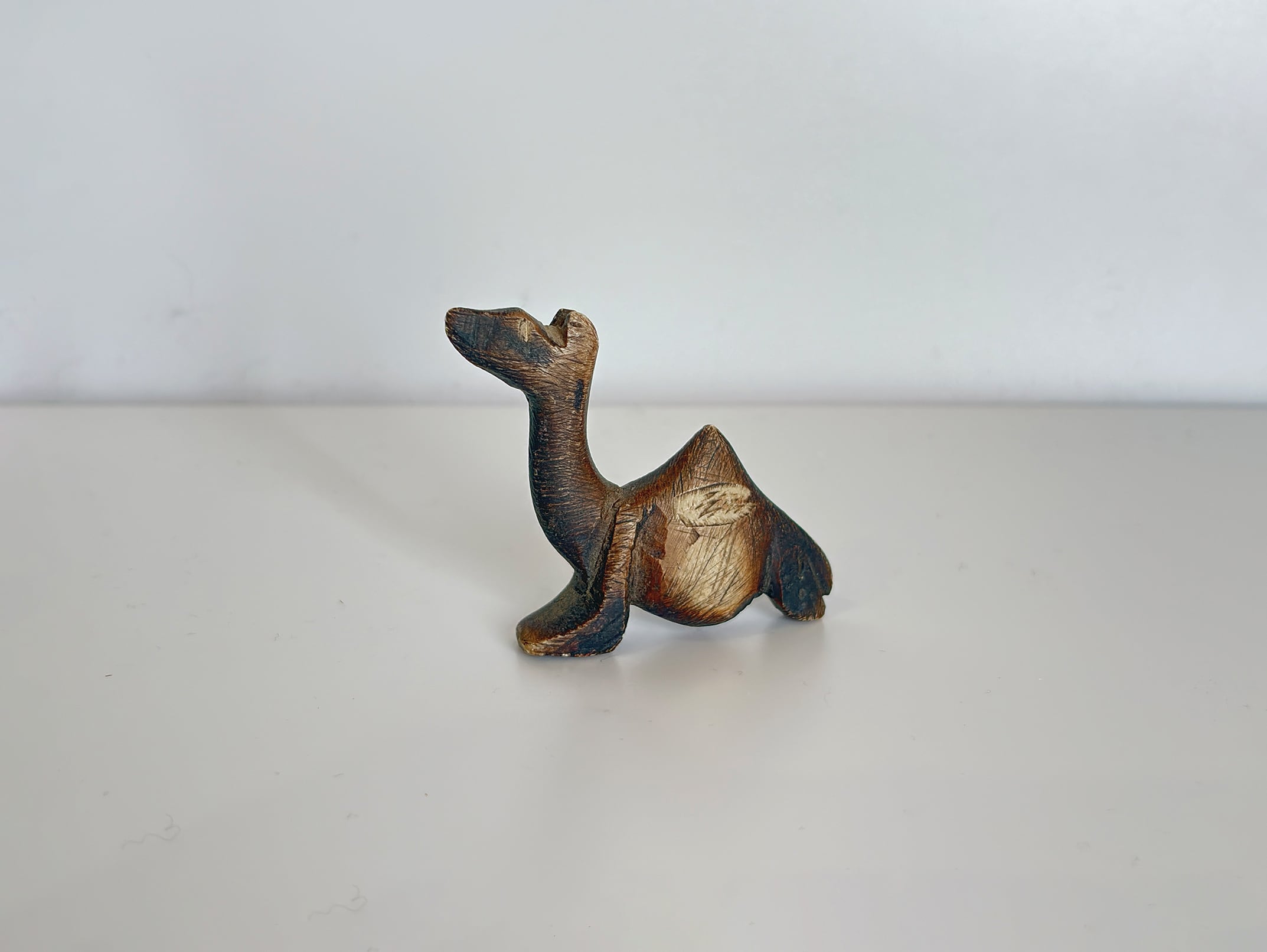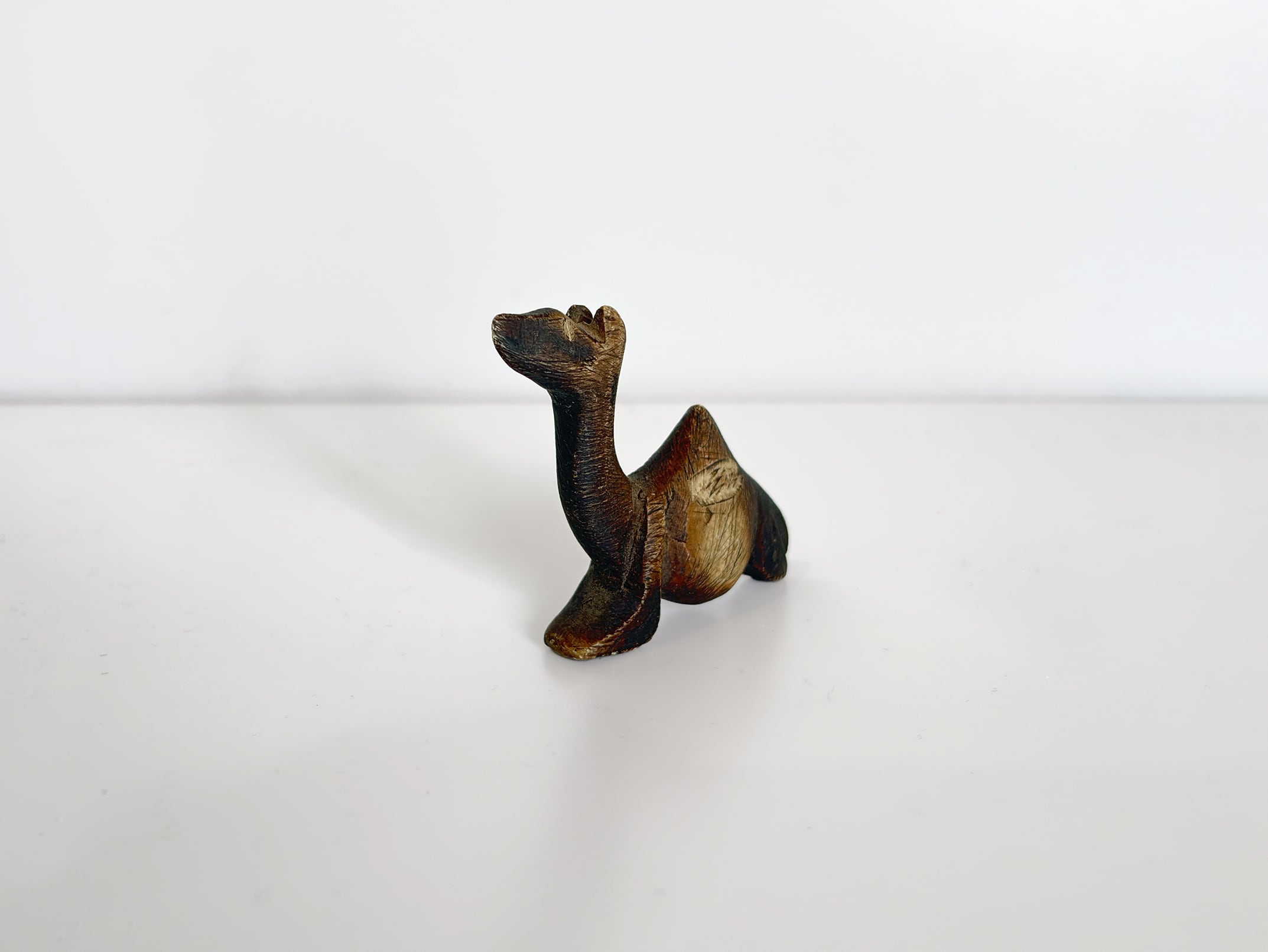 この作品では、ラクダの特徴である長い首と背のコブが簡潔なフォルムで表現され、装飾を抑えたミニマルな造形が際立ちます。シンプルな形状でありながら、石の質感と彫刻のラインによって彫刻作品としての存在感が生まれています。