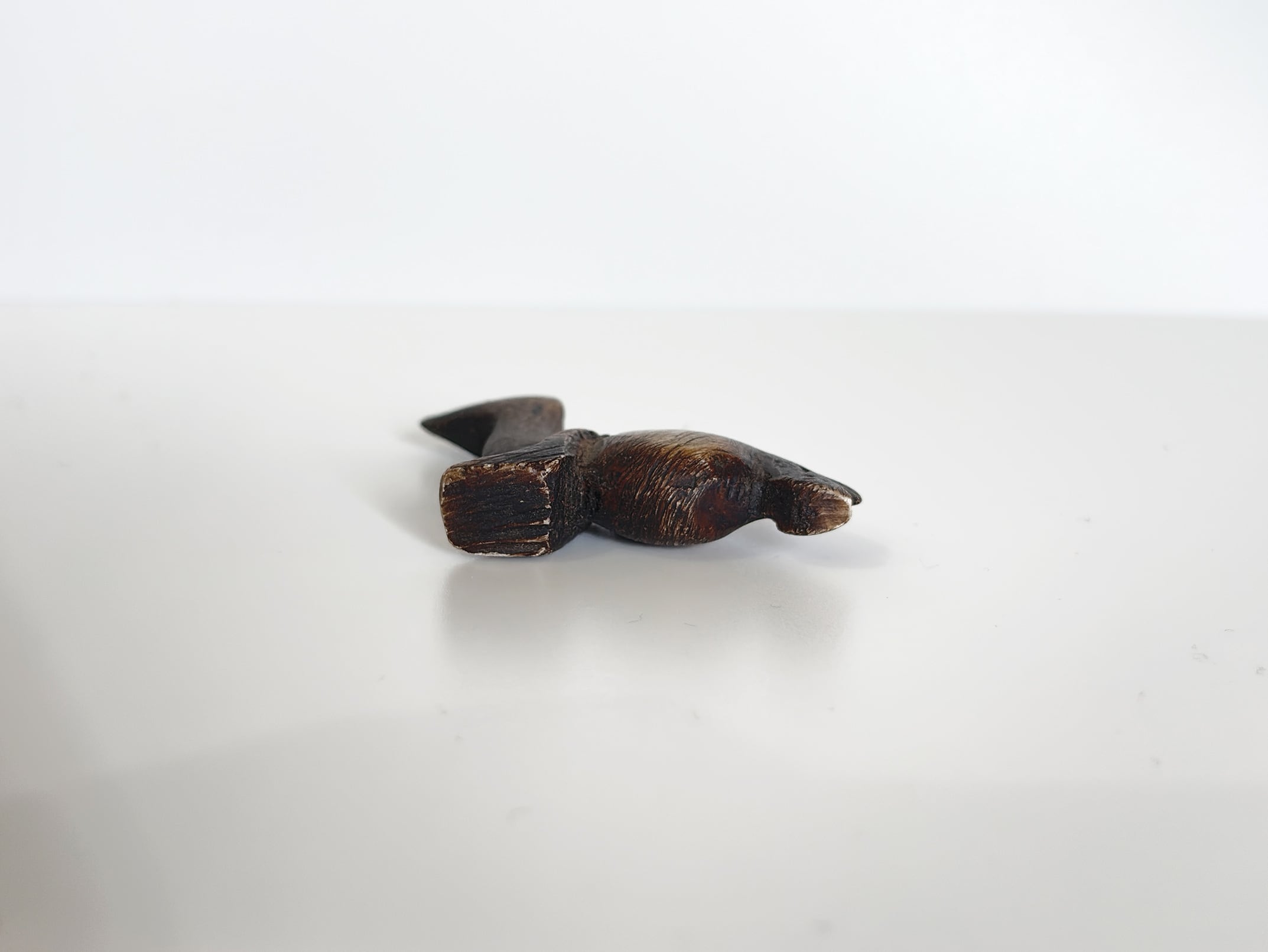 ソープストーンは滑らかな手触りと落ち着いた石質が特徴で、古くからアフリカ各地で彫刻や日用品に用いられてきた素材です。磨きすぎず彫り跡を残した仕上げは、石の素材感と手仕事の痕跡をそのまま感じさせ、プリミティブアートの魅力を強く伝えています。