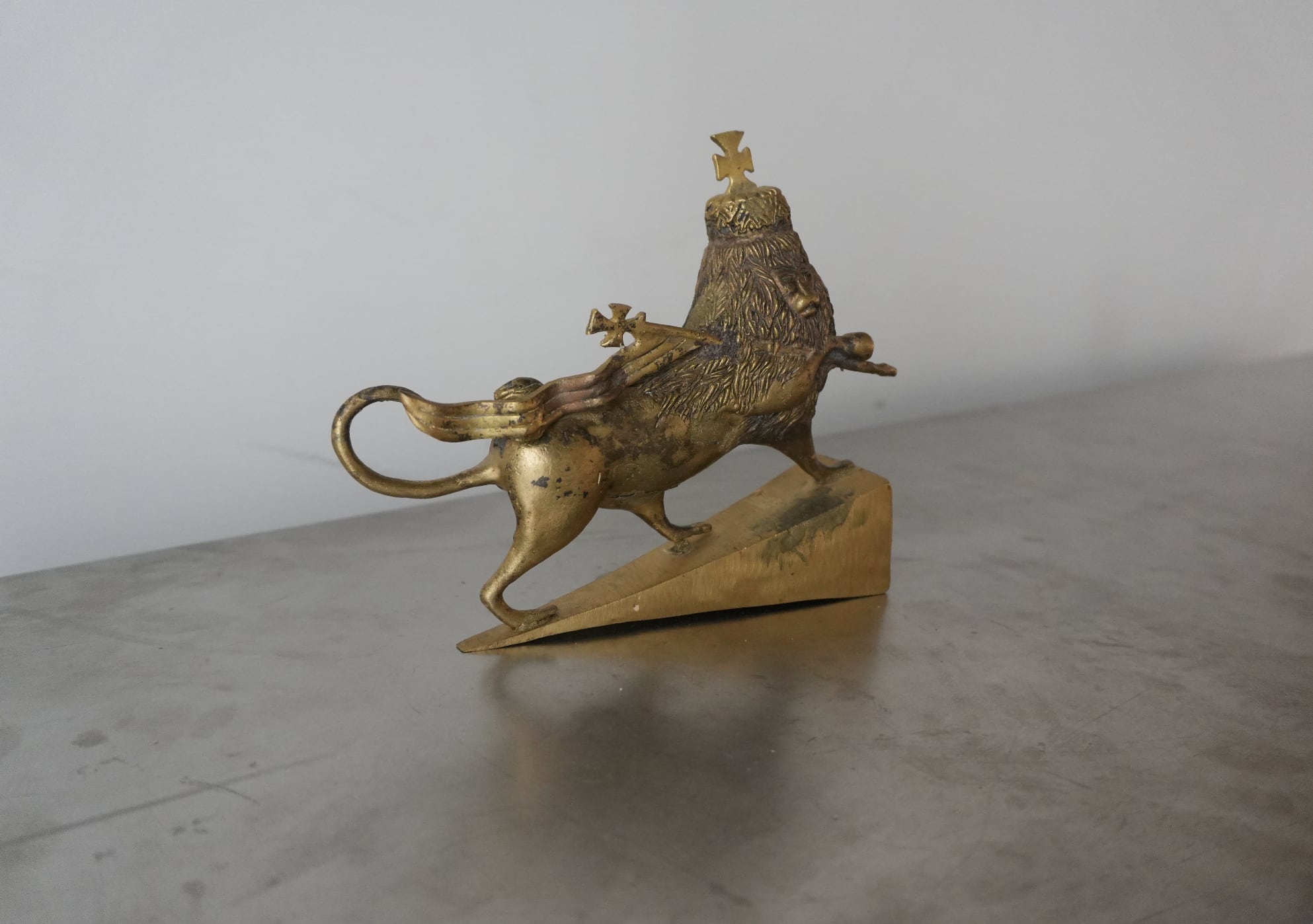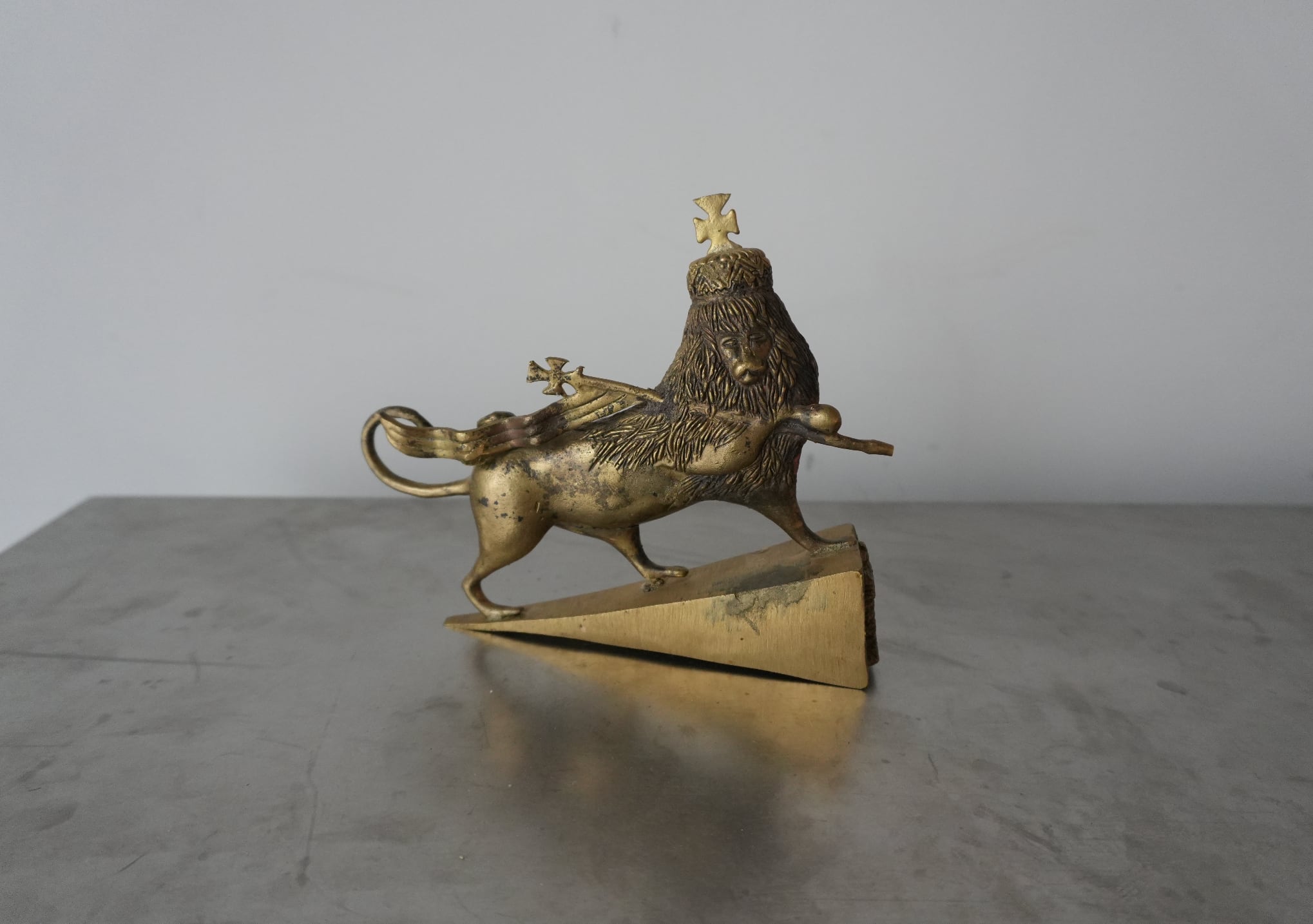 頭上のクラウンは皇帝の権威を、クロスはエチオピア正教会との深い結びつきを表しています。エチオピアはアフリカで最も長い独自のキリスト教の歴史を持つ国であり、このオブジェにはその文化的な厚みが凝縮されています。