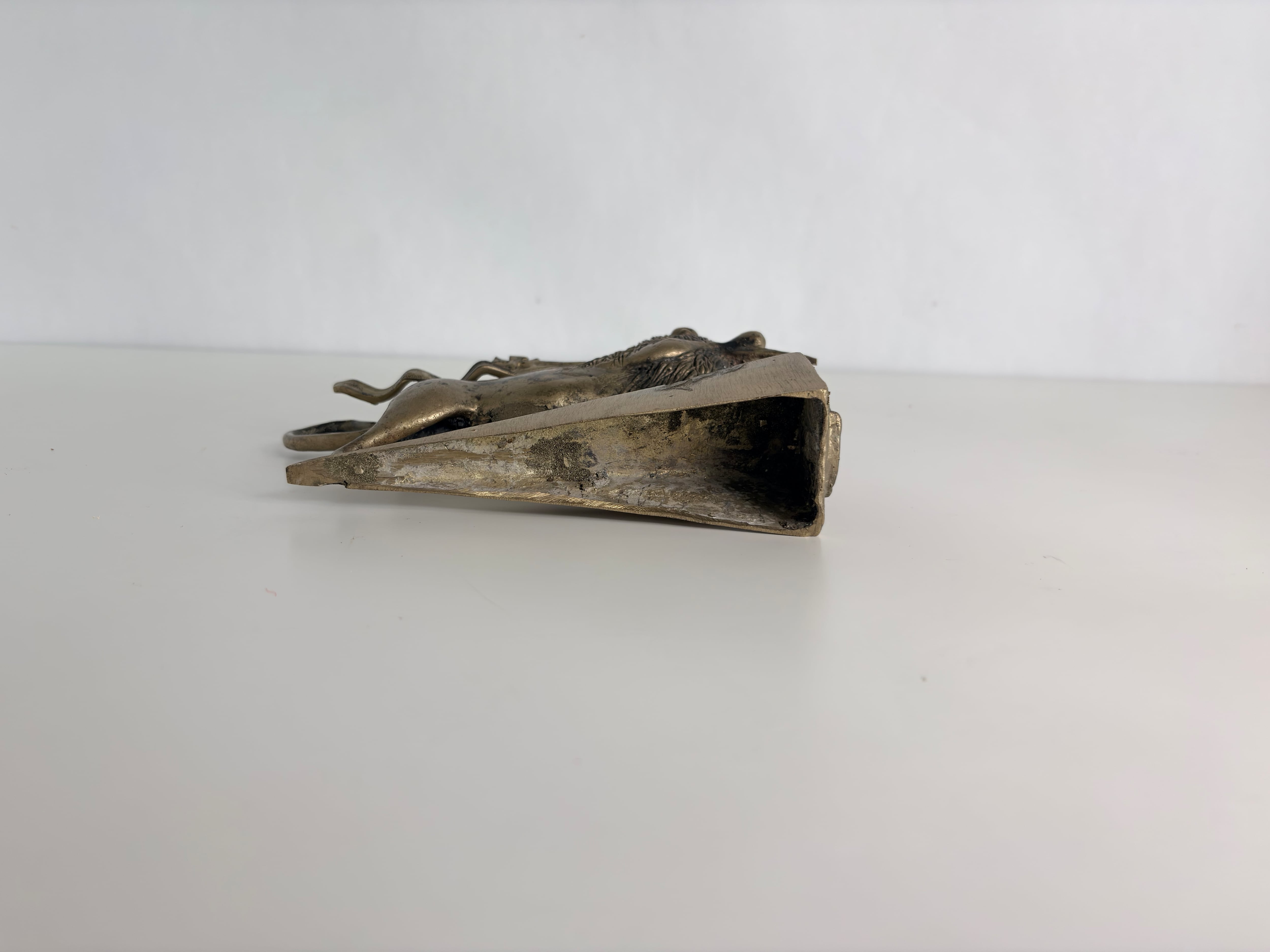 The material is likely brass or bronze. It has a solid weight when held and a naturally aged dark patina across the surface. This patina gives depth and character that cannot be replicated in new pieces. Fine carved details in the mane and body suggest traditional casting and hand finishing.